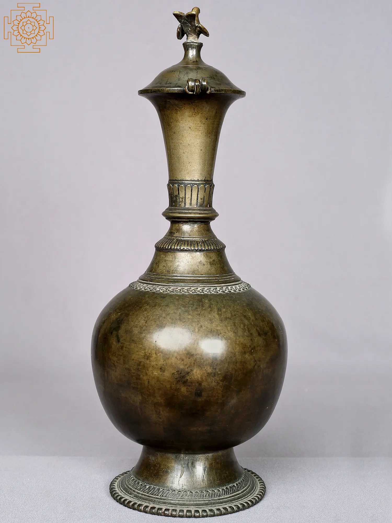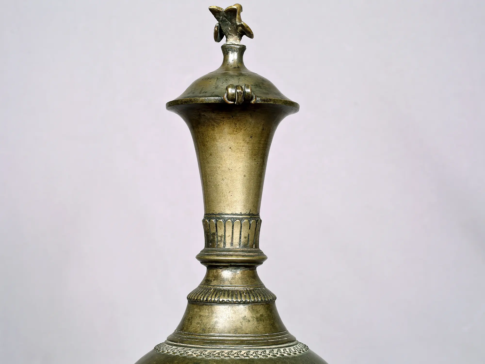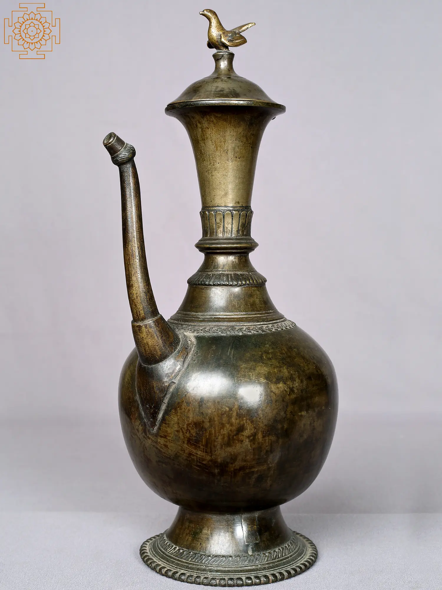 The surahi, as a form, has deep roots in the spiritual and ceremonial practices of South Asia. Often associated with the dispensing of sacred waters, it finds parallels in the mythological narratives of deities and sages using such vessels for divine libations. The curved spout, reminiscent of a swan's neck, can be interpreted as a symbol of purity and grace, often linked to the goddess Saraswati, the patron of arts, music, and knowledge. The inclusion of a delicately sculpted bird atop the lid further enhances this symbolism, perhaps representing a messenger of the gods or a guardian spirit, bringing peace and auspiciousness to its surroundings. In many Indian traditions, birds like the dove or peacock are seen as omens of good fortune and divine favor, adding another layer of spiritual significance to this already captivating piece.