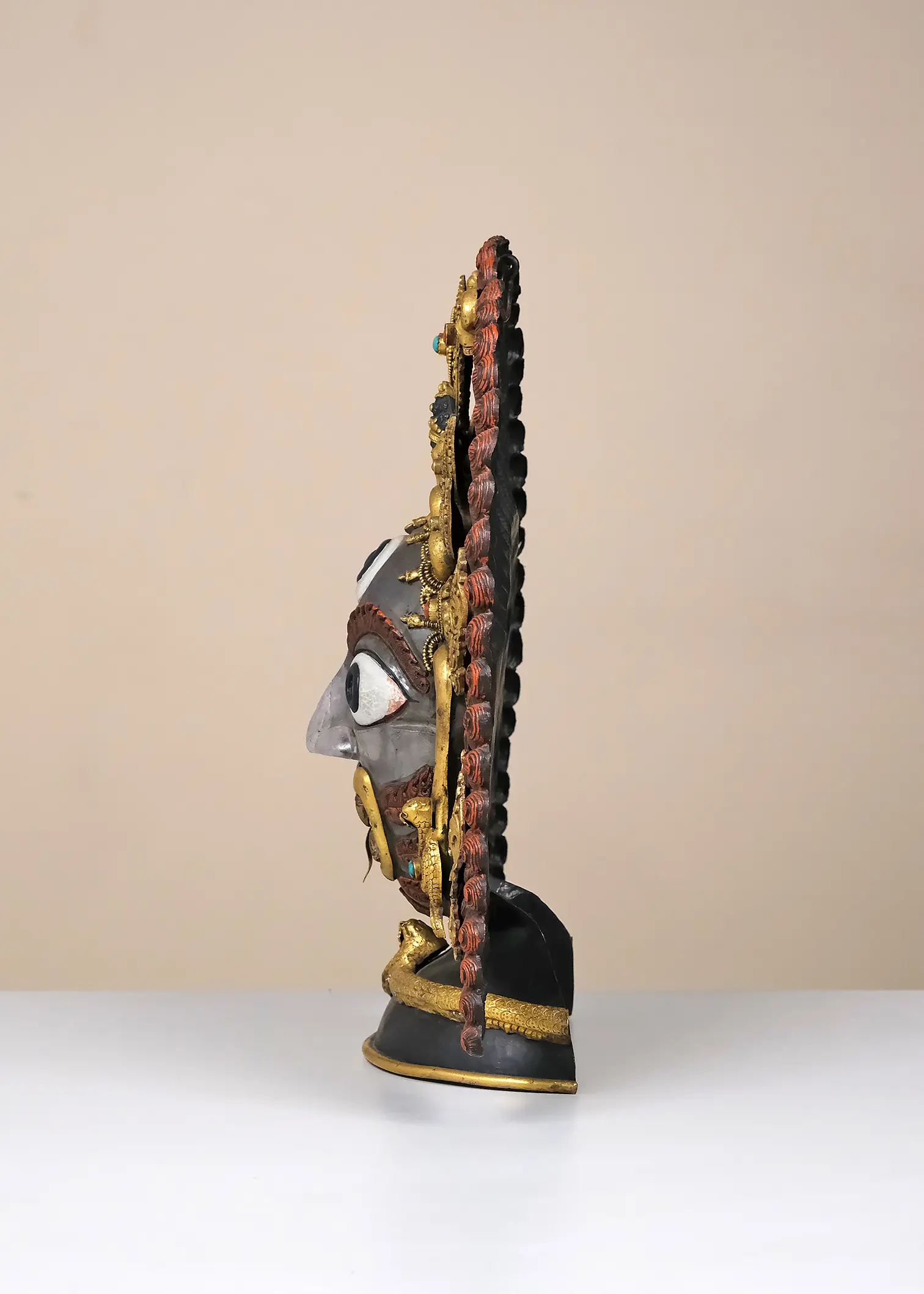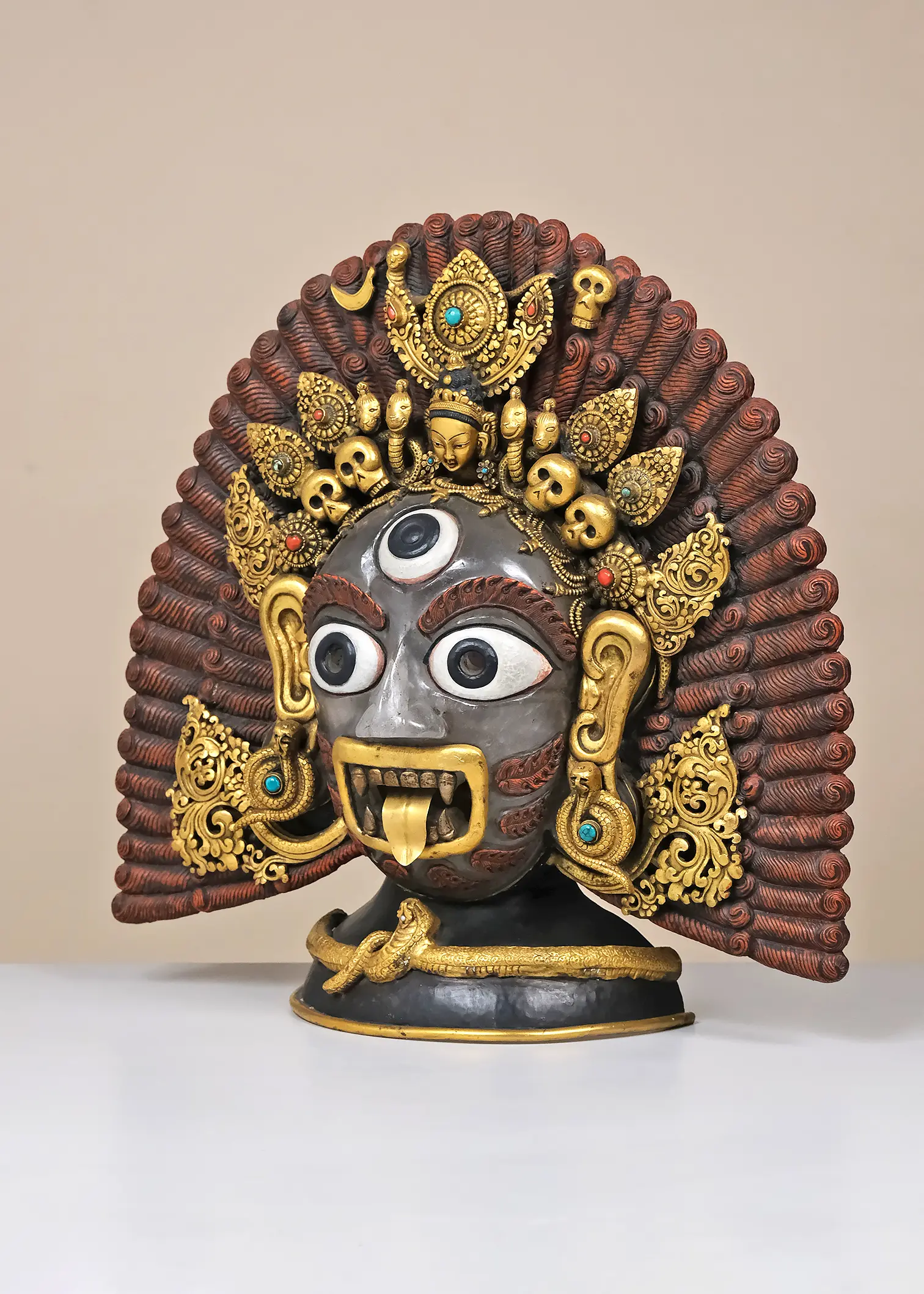 The cosmic dancer of creation and destruction, Bhairav reigns supreme, an embodiment of raw power and divine fury. Bhairav, a fierce manifestation of Lord Shiva, commands adoration for his role as the protector of the righteous. In this breathtaking wall hanging, his presence captivates with an intricate gold-plated skull symbolizing the cycle of life and death. The gold-plated snake gracefully wrapped at the bottom signifies the transcendence of fear, while the three eyes represent the omniscience of the divine. This sculpture radiates the boundless strength within us, urging us to face challenges fearlessly through its heavenly presence.