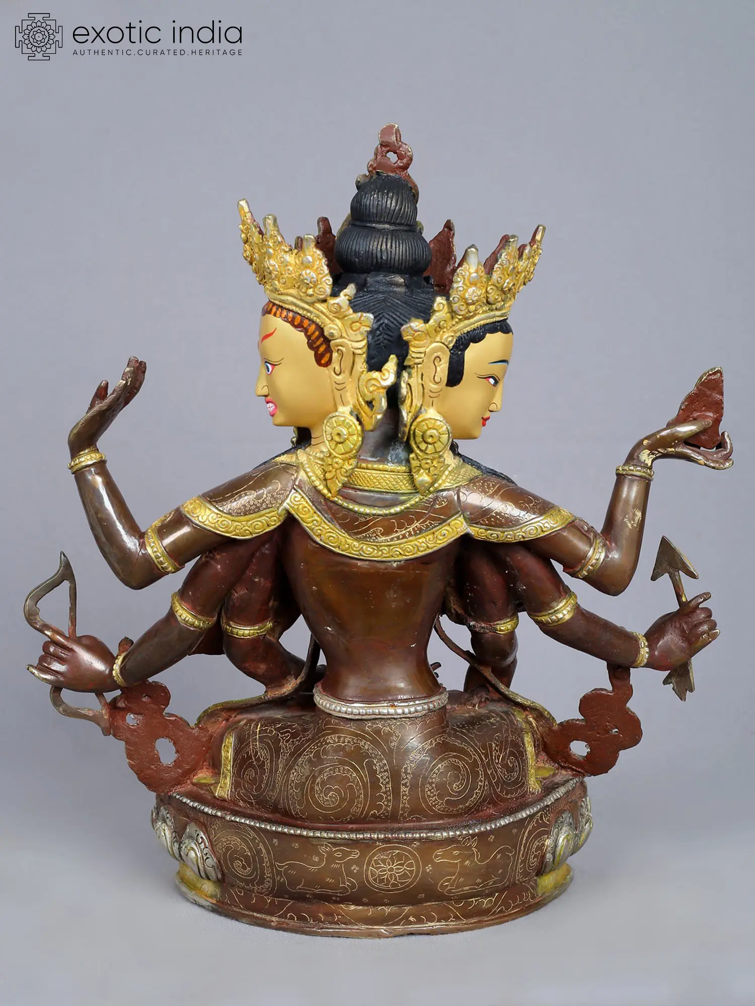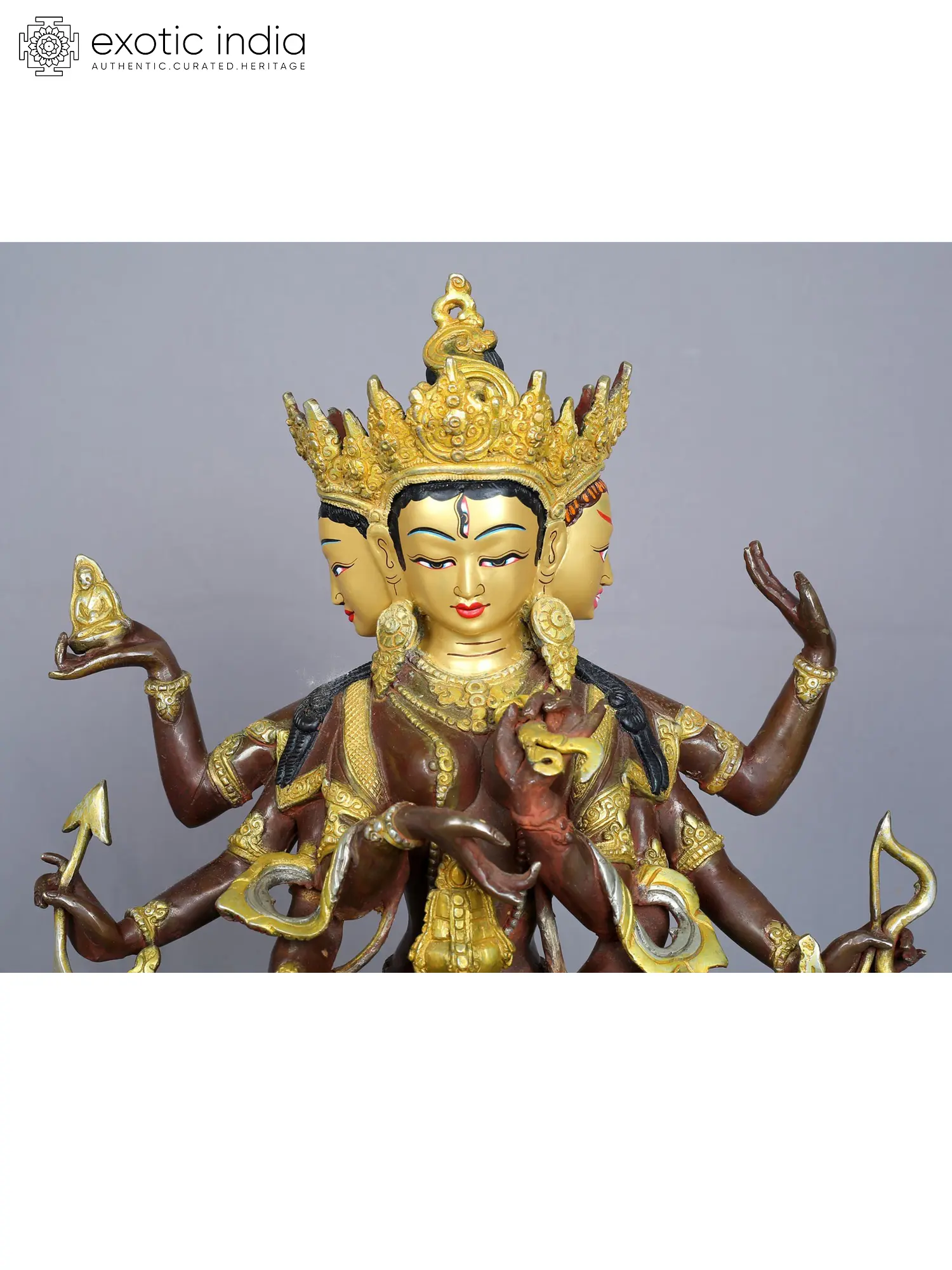 The Namgyalma Thangka depicts the Dakini of Longevity with her distinctive three faces, each adorned with a third eye symbolizing heightened insight.