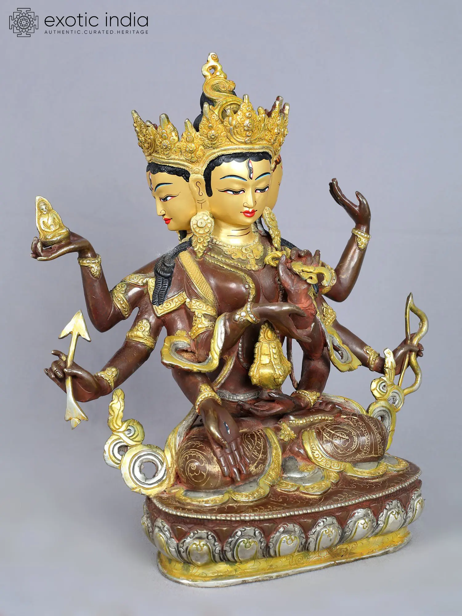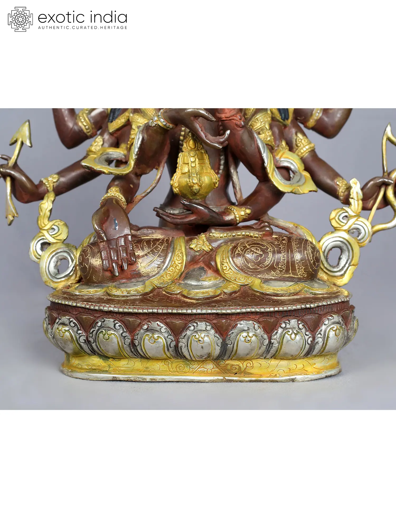 Her attire is resplendent with precious jewels and ornaments, further emphasizing her divine presence. With eight hands, she embodies the multifaceted nature of enlightenment. Dakini Namgyalma holds the twin Dorje, a symbol representing the physical cosmos's foundation, close to her chest. This empowering gesture serves to dispel malevolent forces and enhance one's karma positively. In her upper right hand, she gracefully clutches a statue of Amitabha Buddha. Moreover, she cradles an immortality vessel in her lap.