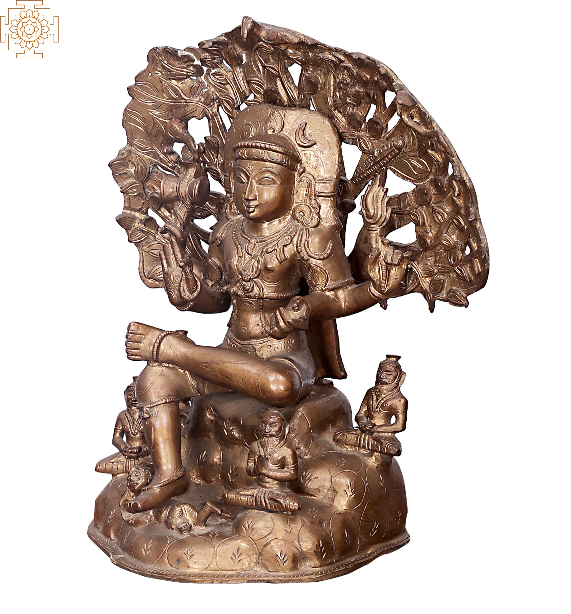 This beautiful statue captures lord Dakshinamurty in unmoving stillness and divine serenity, along with his disciples sitting around him. With folded hands, they are showing their limitless devotion to Shiva. The lord is sitting under a tree with his right leg set upon a demon, which signifies the ignorance of the human mind. He is holding a Damru(musical instrument) and a flame of fire in his upper arms. The fire is the symbol of the light of knowledge, which dispels the darkness of ignorance of his disciples. While holding scriptures in his lower right hand, the lord is blessing his disciples with the left hand. The lord is also adorned with beautiful clothes and exquisite pieces of jewelleries. His serene face is emanating peace and silence all around.