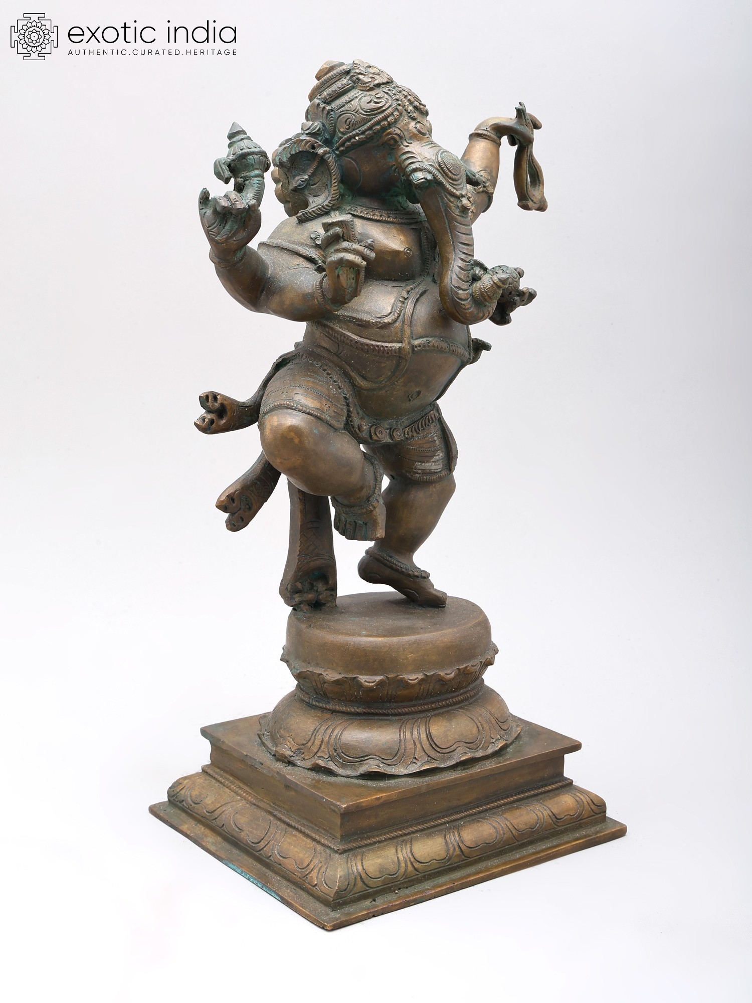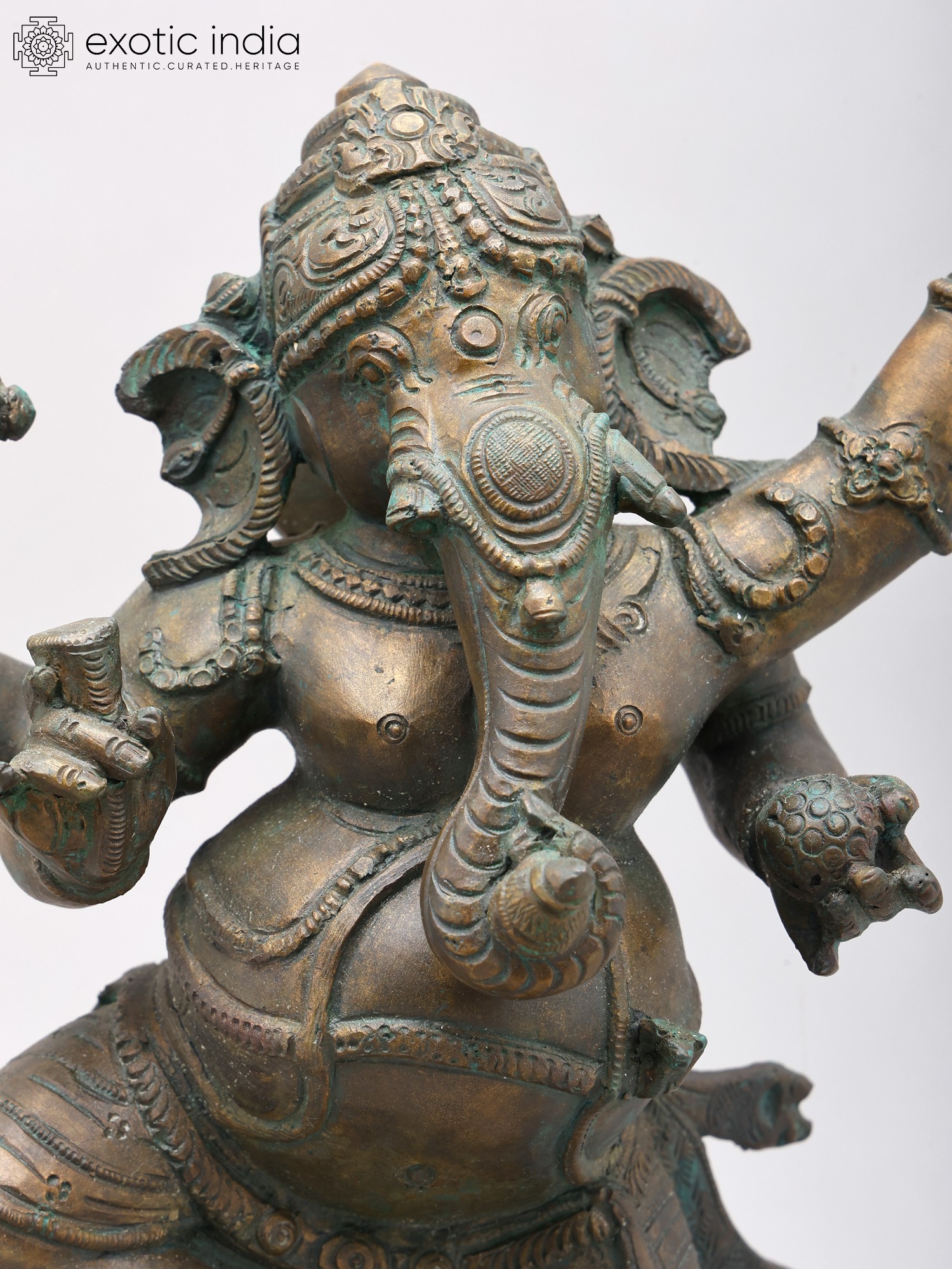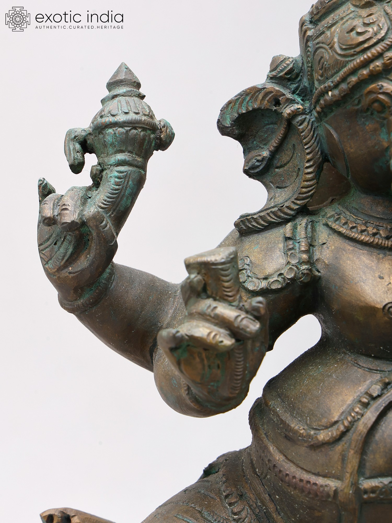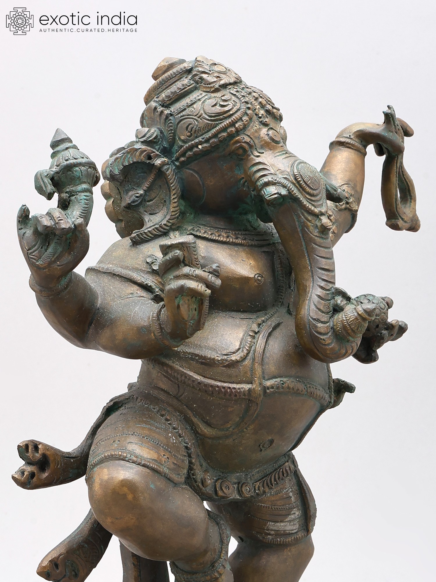 This dancing manifestation, crafted in Panchaloha bronze from “Swamimalai” using the ancient “Madhuchista Vidhana (Lost-Wax) technique”, signifies the rhythmic harmony of creation, an ode to the joy inherent in cosmic cycles. In each graceful step, Nritya Ganesha, “the bestower of eternal bliss”, becomes a transcendent expression of divine joy, an everlasting celebration of life’s vibrant cadence.