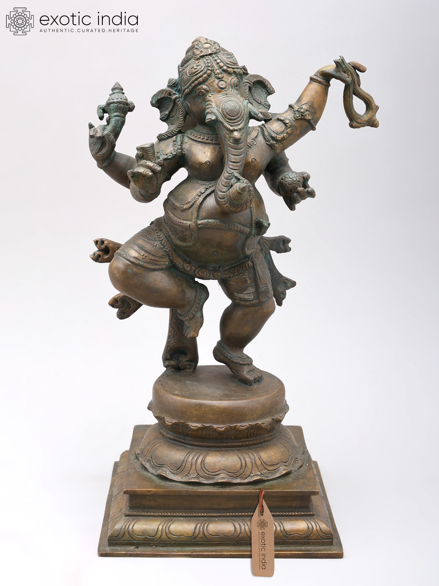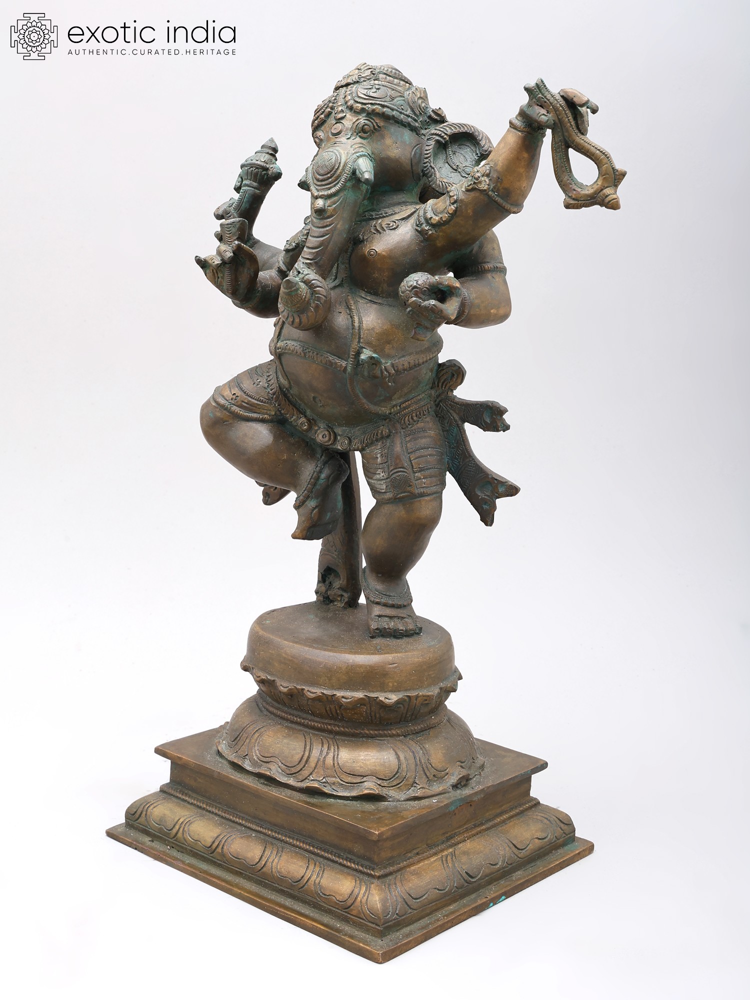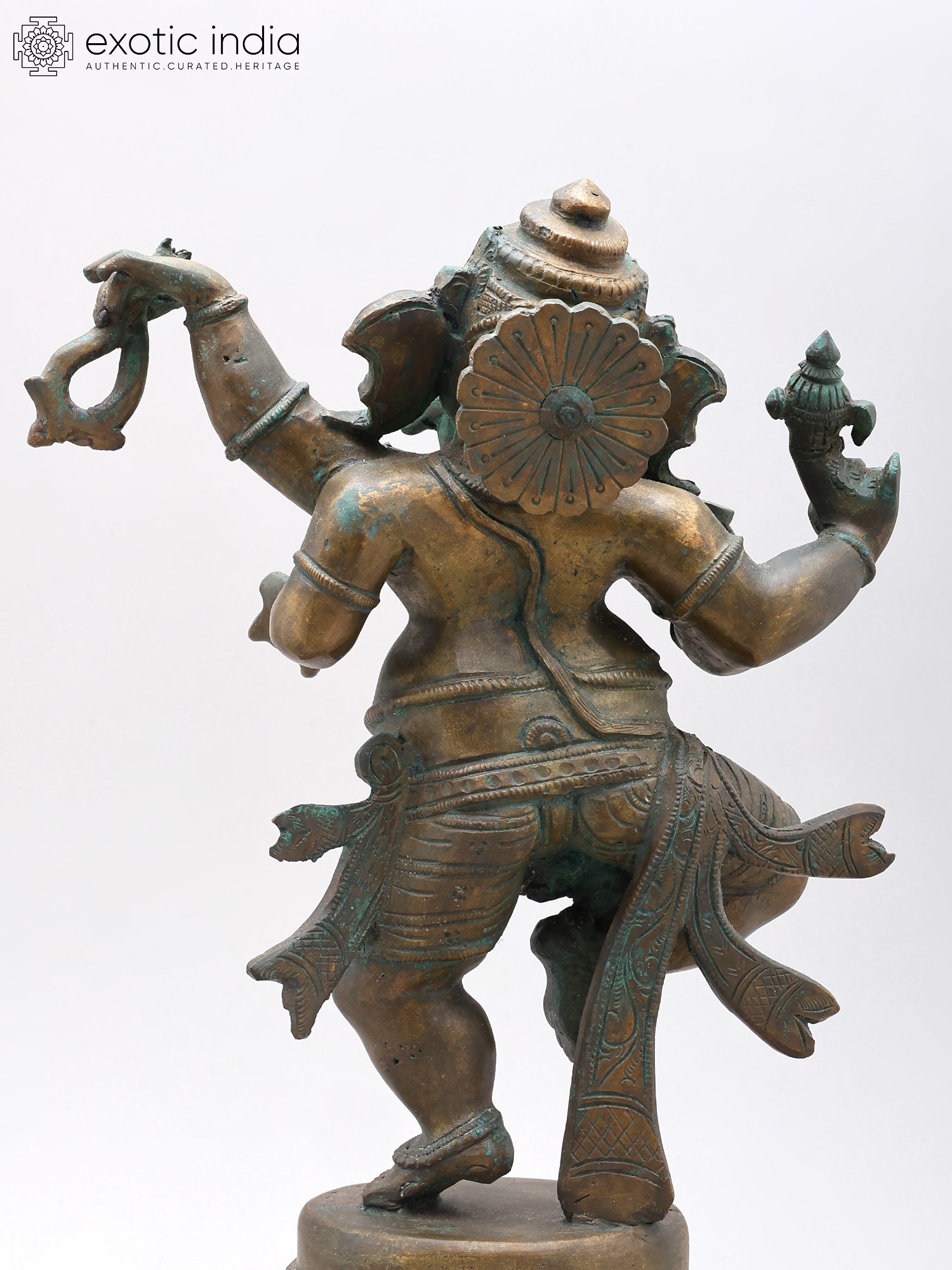 This dancing manifestation, crafted in Panchaloha bronze from “Swamimalai” using the ancient “Madhuchista Vidhana (Lost-Wax) technique”, signifies the rhythmic harmony of creation, an ode to the joy inherent in cosmic cycles. In each graceful step, Nritya Ganesha, “the bestower of eternal bliss”, becomes a transcendent expression of divine joy, an everlasting celebration of life’s vibrant cadence.