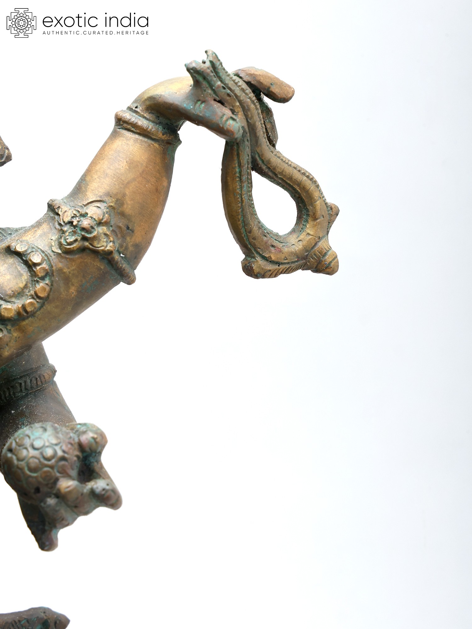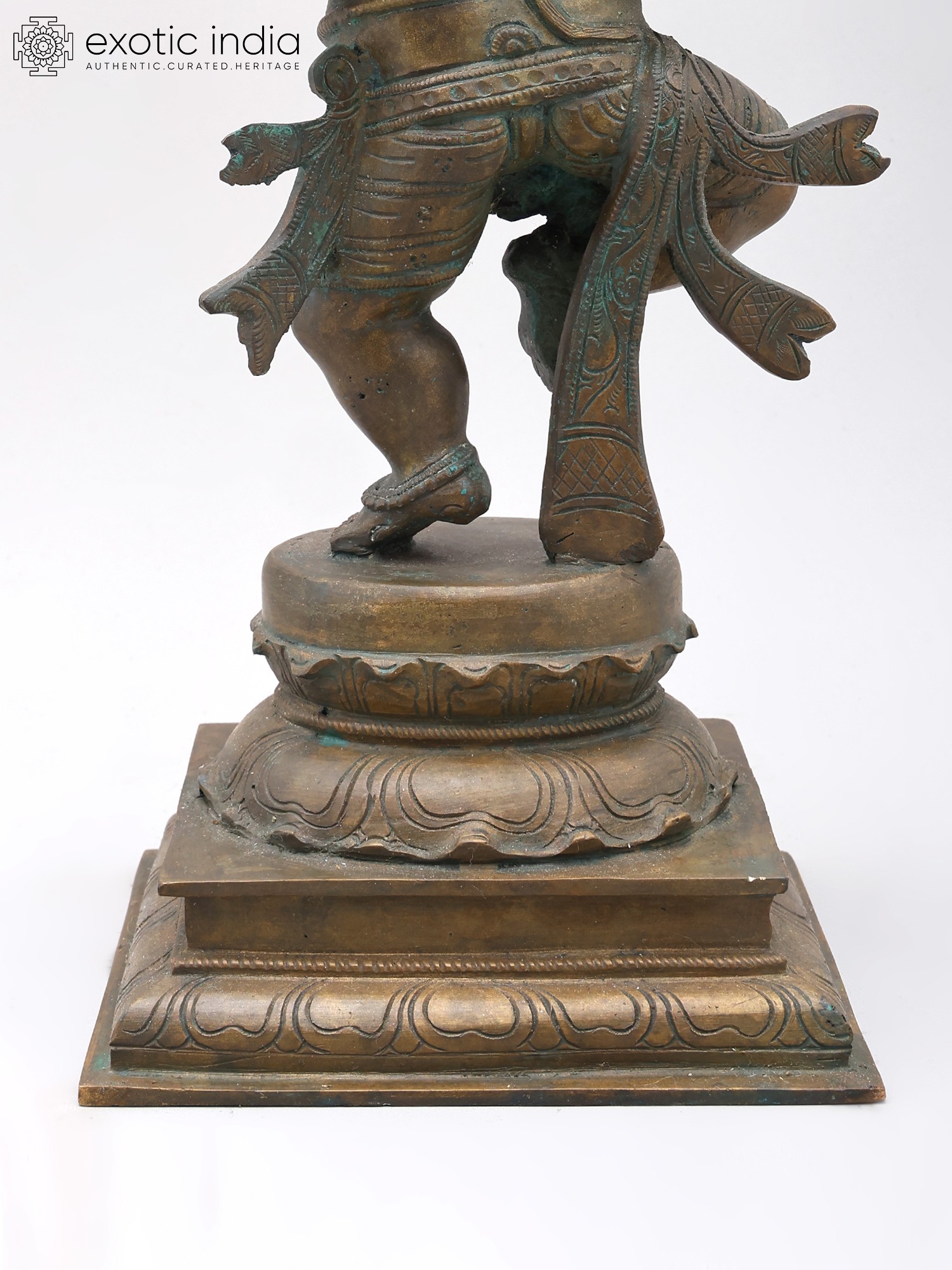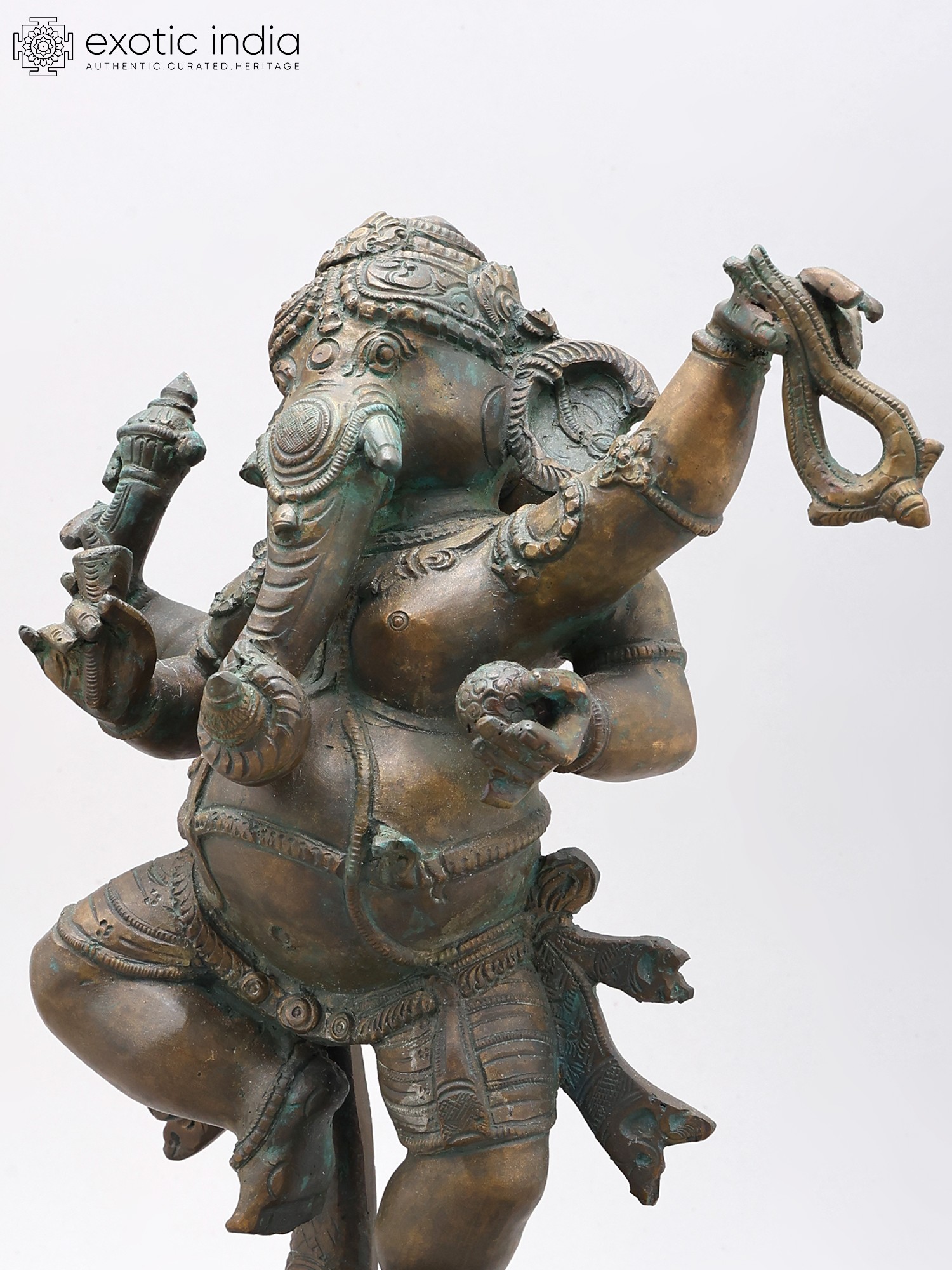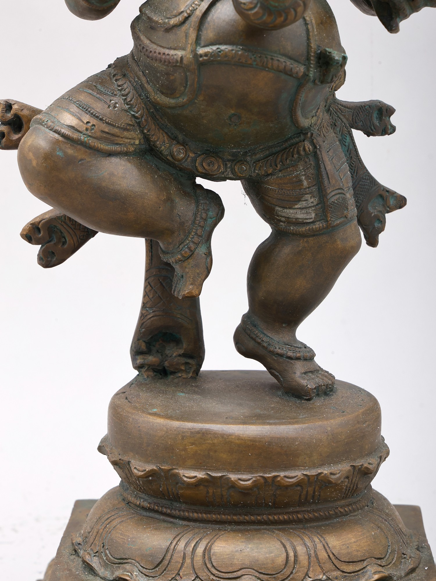 This dancing manifestation, crafted in Panchaloha bronze from “Swamimalai” using the ancient “Madhuchista Vidhana (Lost-Wax) technique”, signifies the rhythmic harmony of creation, an ode to the joy inherent in cosmic cycles. In each graceful step, Nritya Ganesha, “the bestower of eternal bliss”, becomes a transcendent expression of divine joy, an everlasting celebration of life’s vibrant cadence.