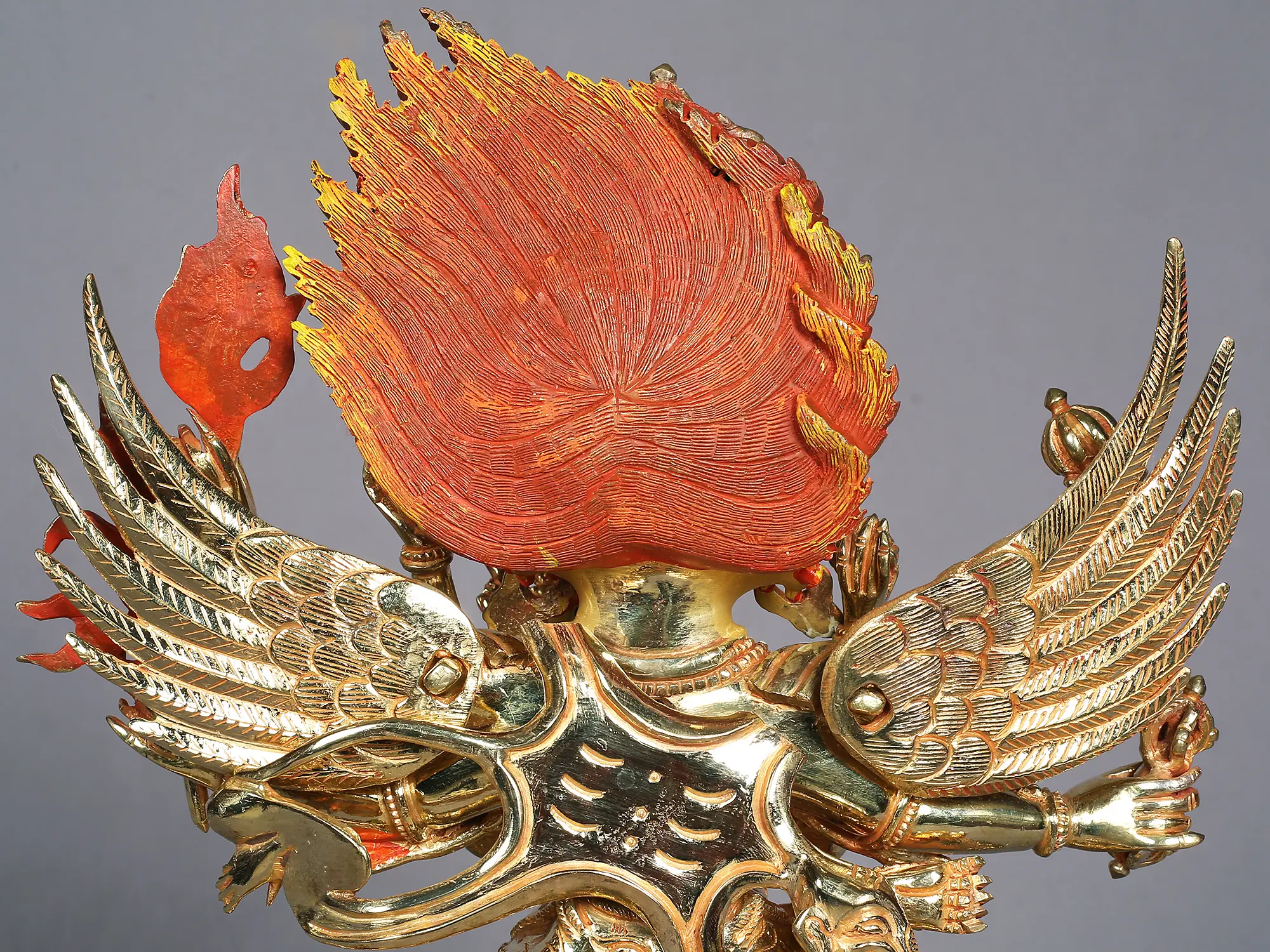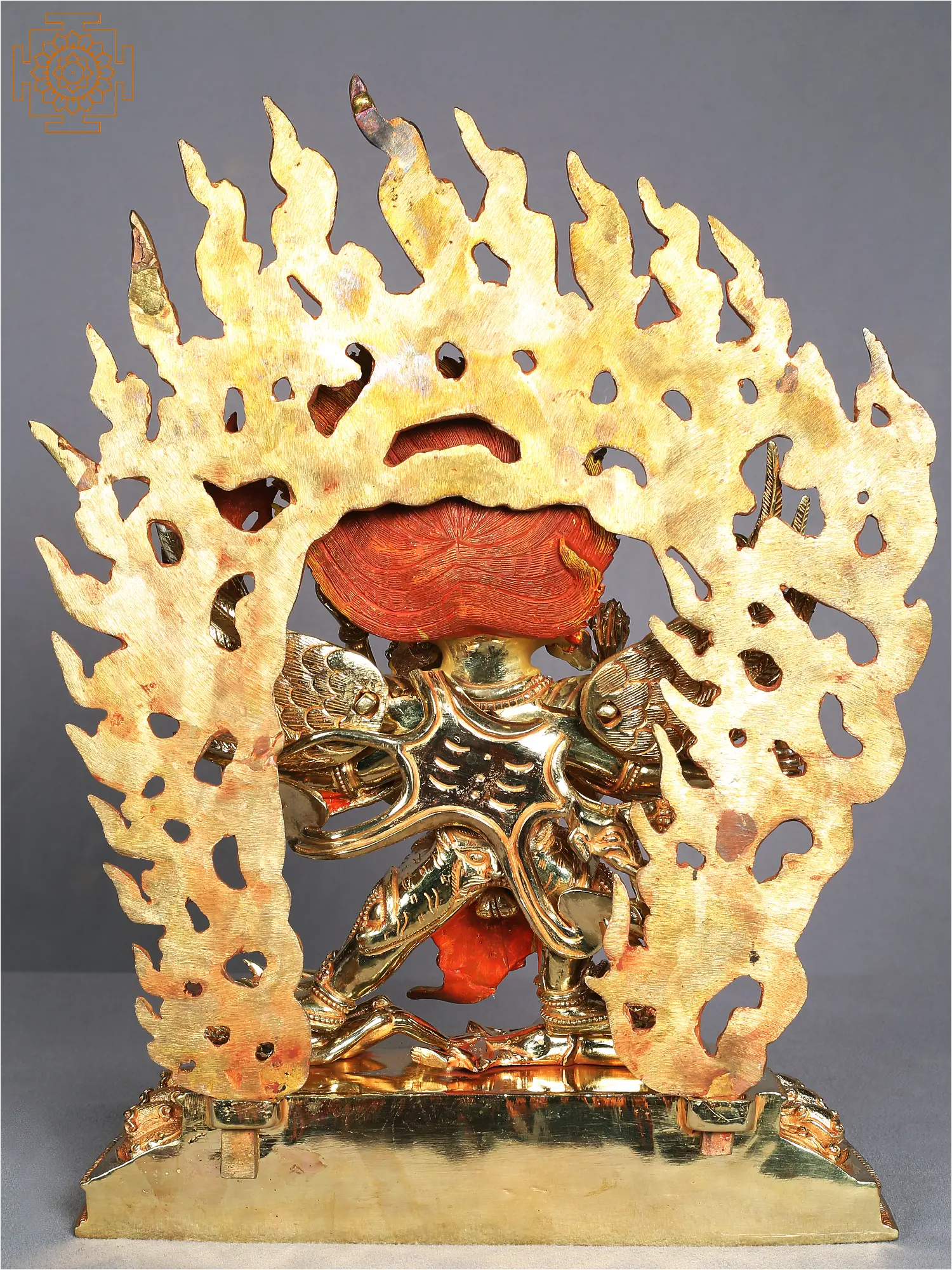 With a phurba (ritual dagger) in one hand and a vajra (thunderbolt) in the other, Vajrakilaya is a ferocious and energetic figure. His angry face, painted in flames, represents the cleansing of impurities and the quick, transformational effect of his work.
