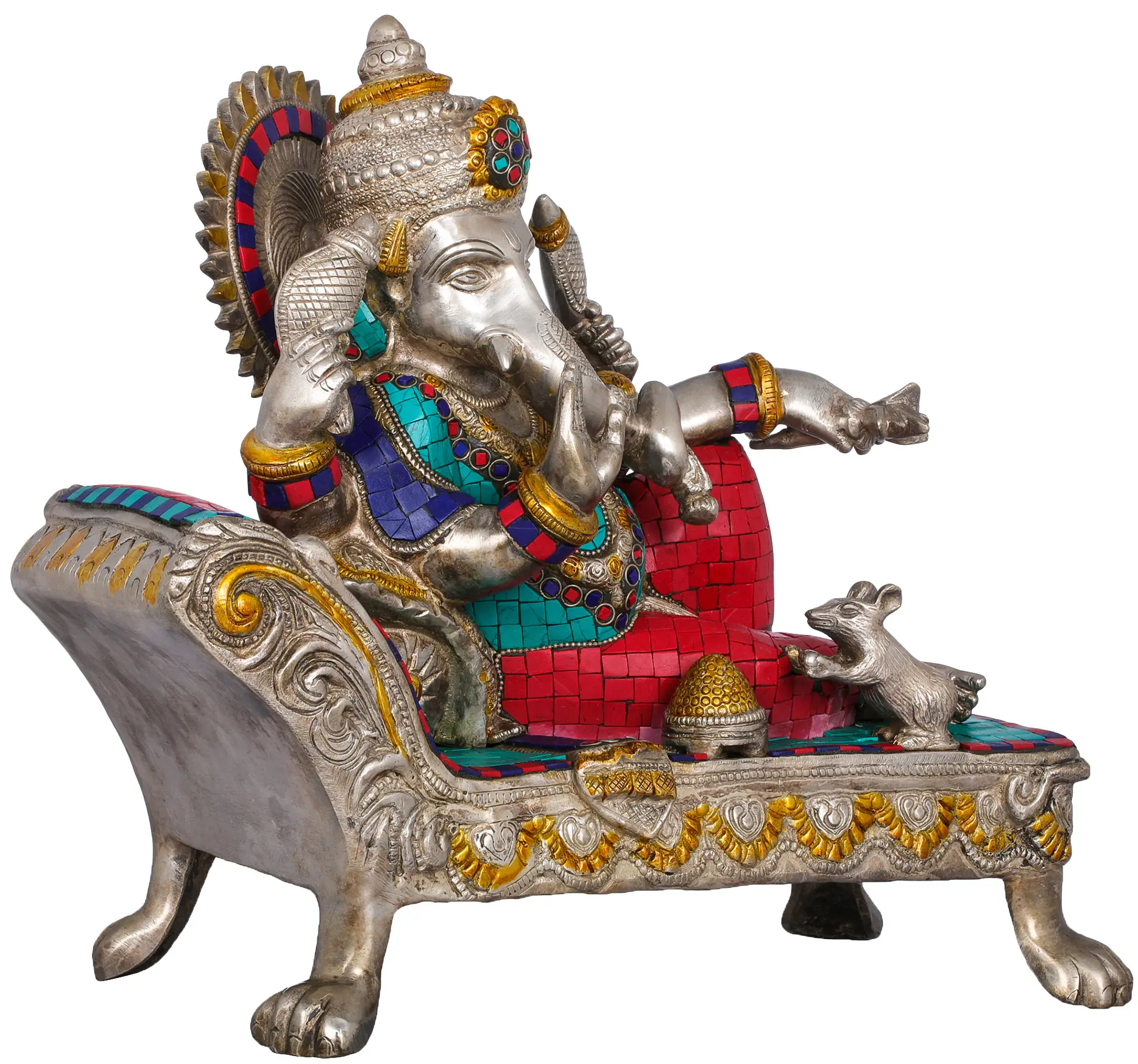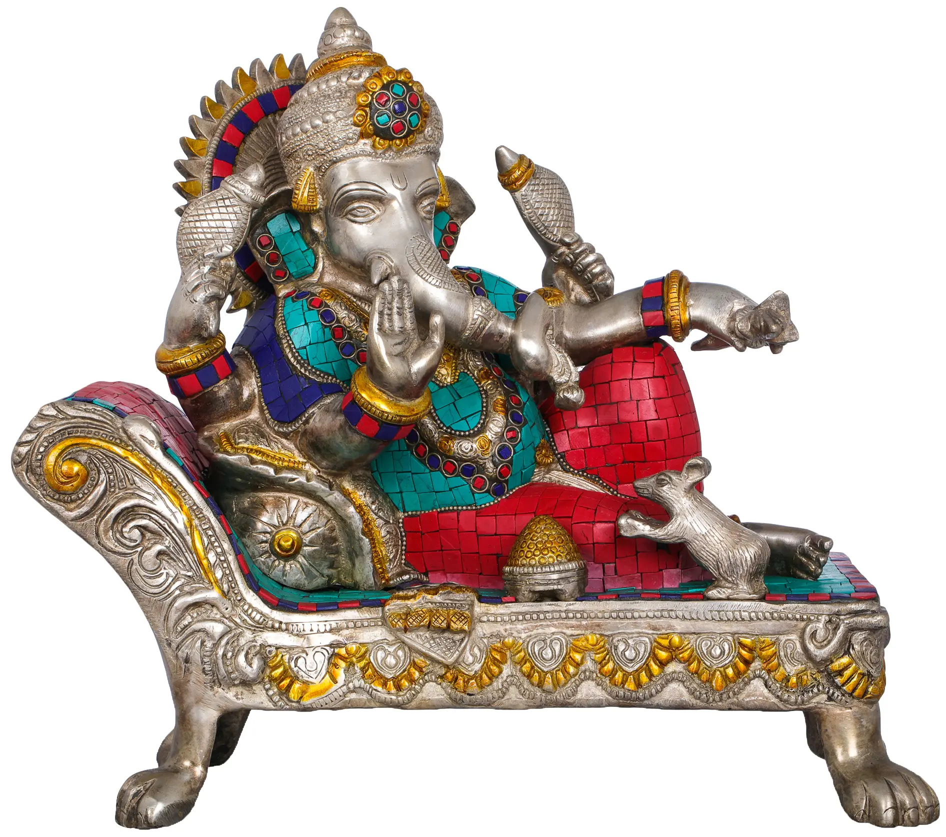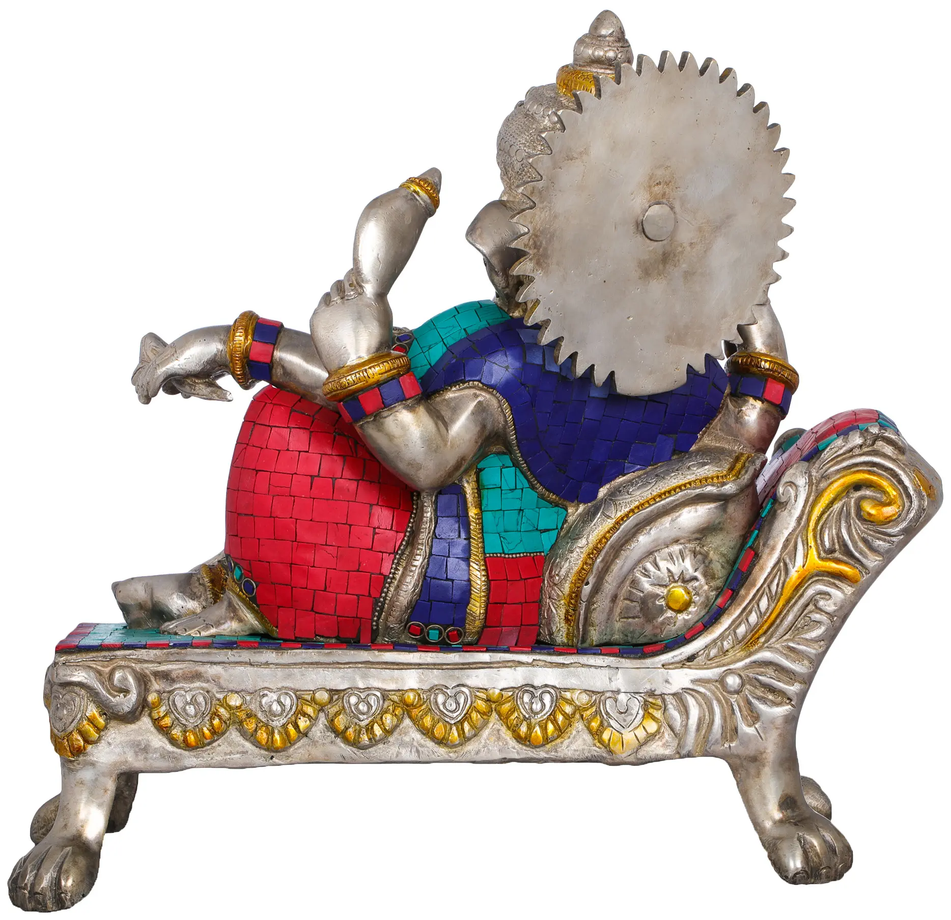 Crafted from high-quality brass, this idol is a masterpiece of Indian artistry. The intricate inlay work, featuring vibrant tessellations of turquoise and red, elevates the sculpture from mere representation to a breathtaking work of art. The shimmering brass forms the divine figure, adorned with ornate jewelry and a regal headdress, each detail meticulously rendered by skilled artisans. The recliner itself is a symphony of design, with elaborate carvings and decorative motifs that speak of opulence and divine comfort. This fusion of traditional craftsmanship and artistic flair makes this idol a truly captivating centerpiece, whether placed in your meditation room, living space, or office.