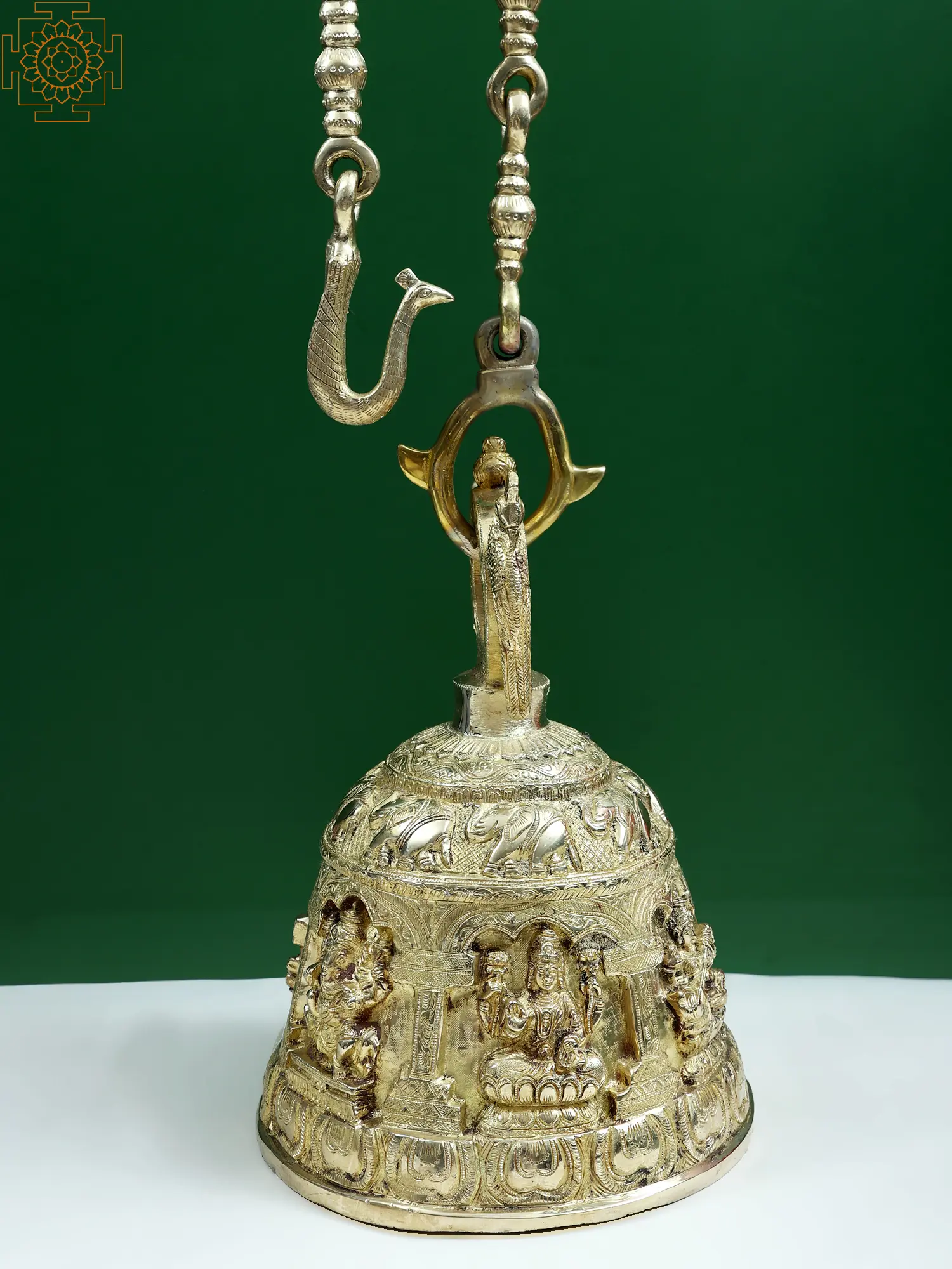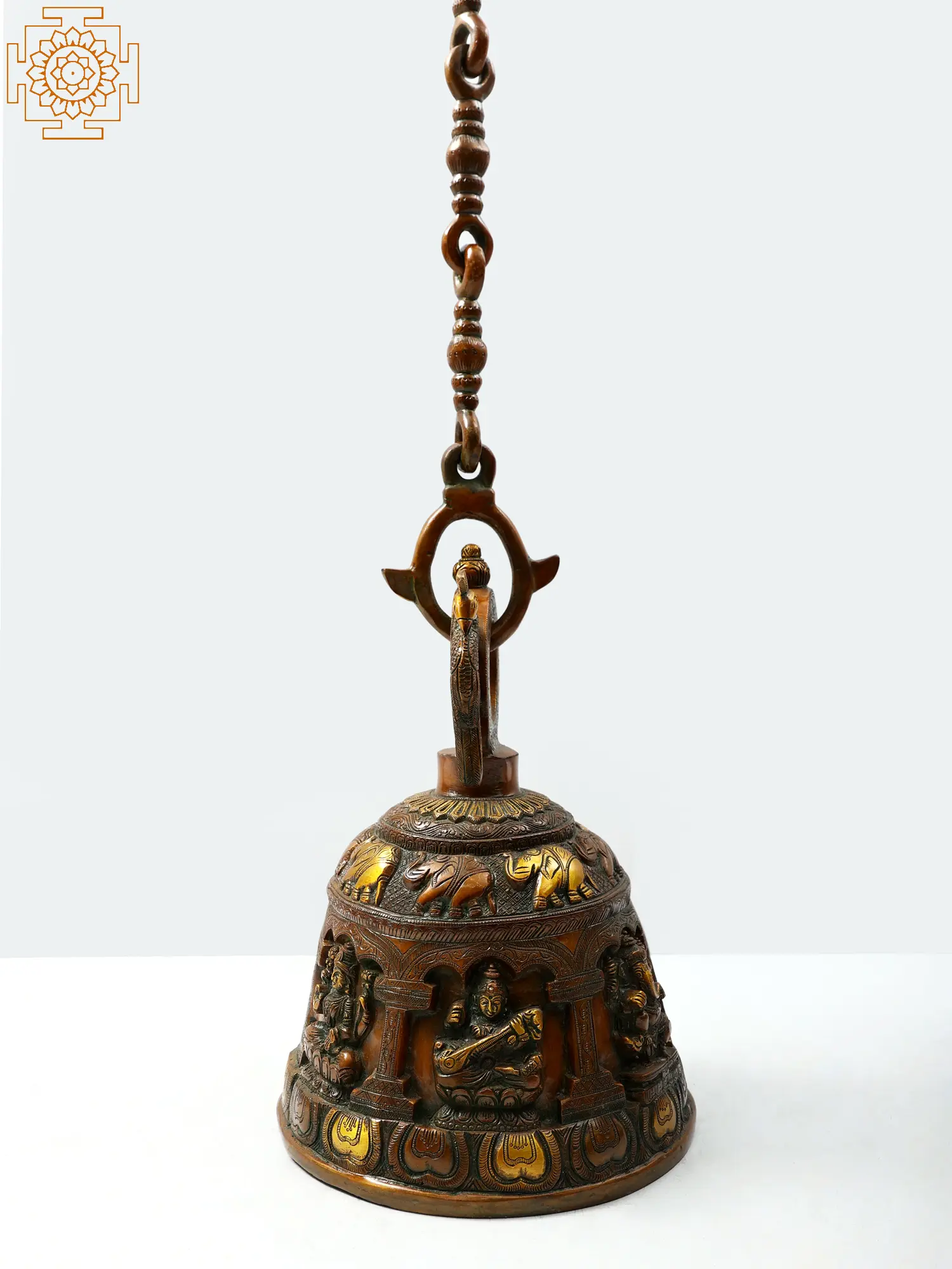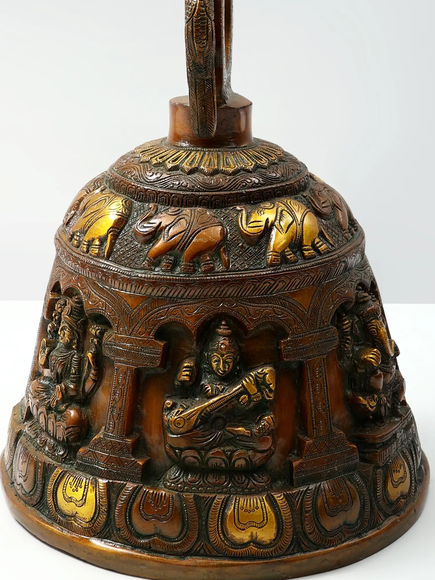 This brass temple hanging bell features the divine trinity of Ganesha, Lakshmi, Saraswati. Ganesha, with his elephant head, represents wisdom and the removal of obstacles. Lakshmi embodies wealth and abundance, while Saraswati symbolizes creativity and knowledge. The bell's sound is believed to purify the environment and invoke blessings. As it hangs in your sacred space, it becomes a reminder to seek wisdom, wealth, and creativity in your life, and to cultivate the qualities that these divine deities represent.