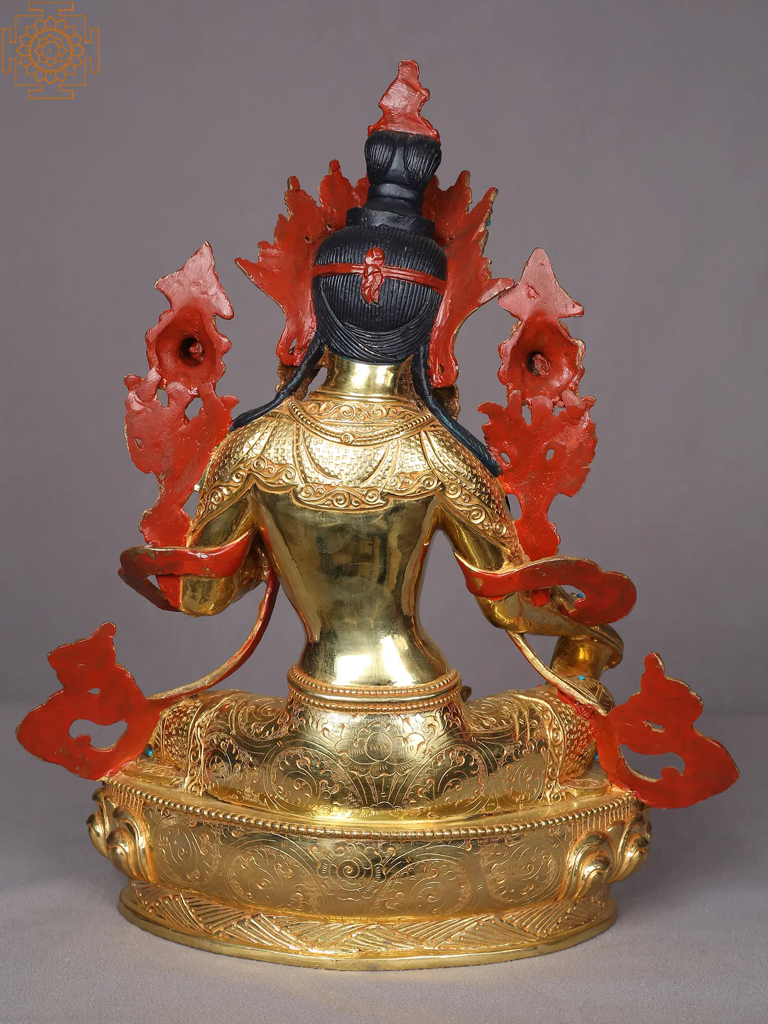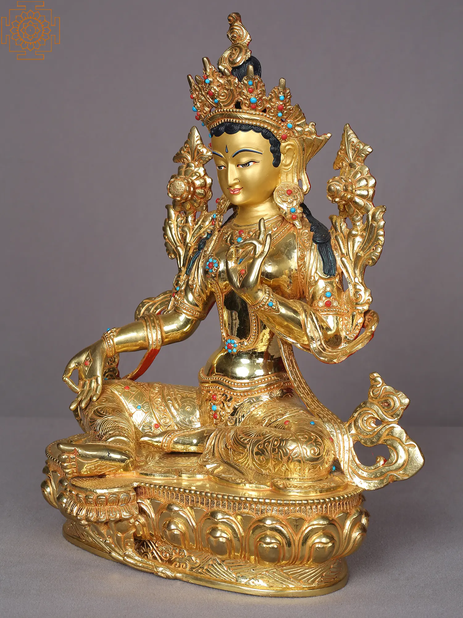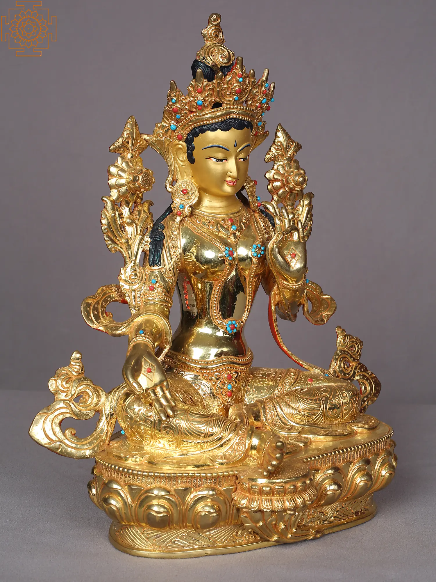 Goddess Green Tara, the nurturing mother of liberation, cradles the essence of success and accomplishment within her celestial arms. As the feminine counterpart to Avalokiteshvara, Tara embodies the sublime qualities of the feminine principles, an ethereal embodiment of compassion and grace. Worshipping her unlocks the gates of achievement and to bask in the divine energy of triumphant endeavours. This statue, a masterpiece born of devotion, has been meticulously carved from copper, its regality magnified by a golden gilding that glows like the first light of dawn. Embellished with inlay work, this enthralling creation captures the essence of Tara’s benevolence.