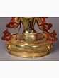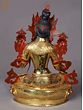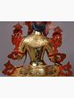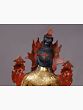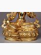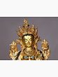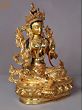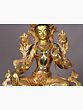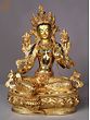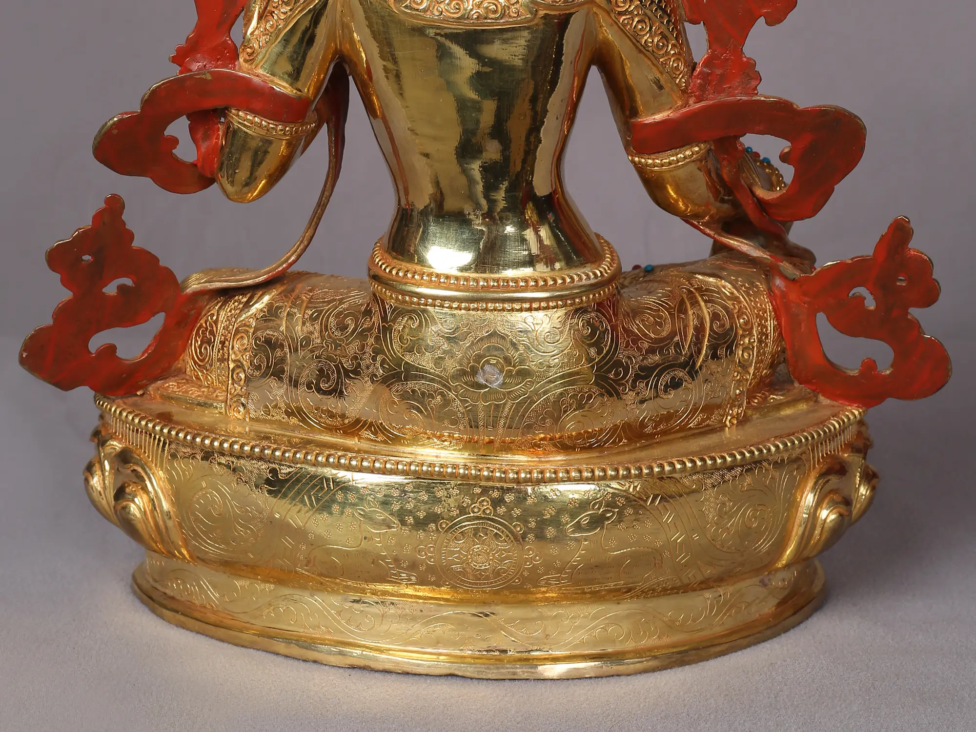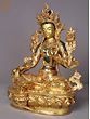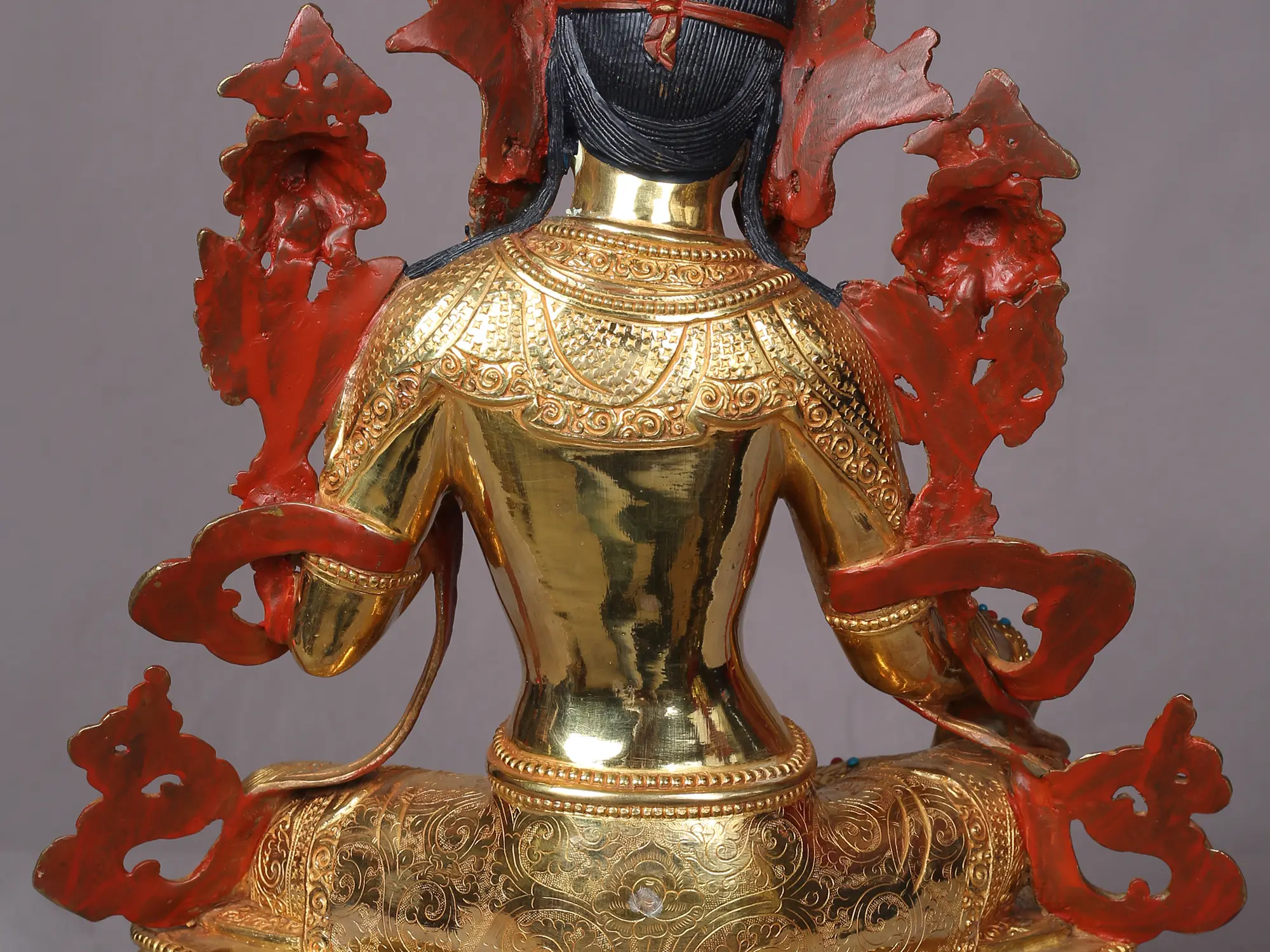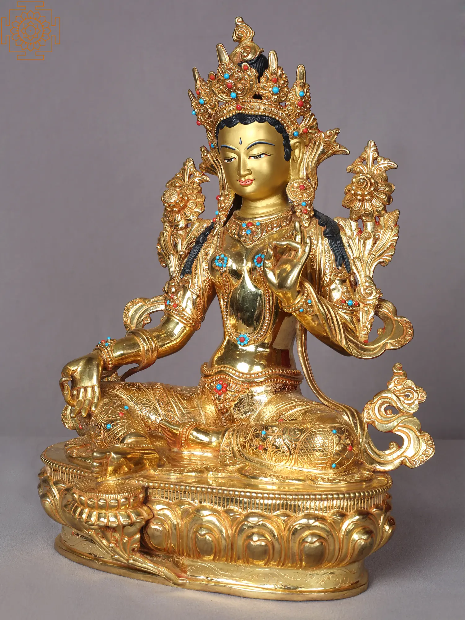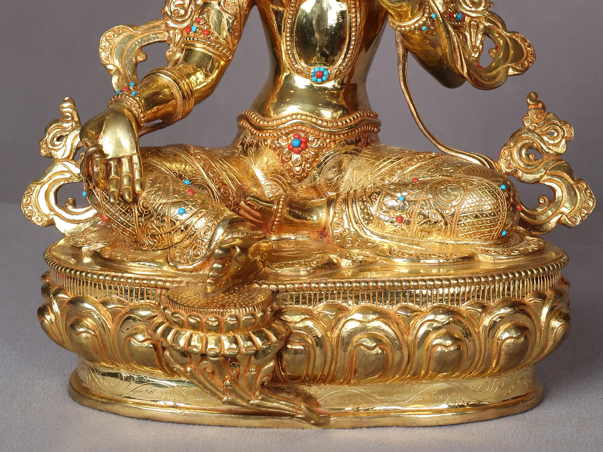 In Vajrayana Buddhism, Green Tara ceremonial meditation entails picturing the compassionate goddess in her most intriguing form and imagining oneness with her lovely form. The majestic statue of Green Tara made of gilded copper that is being displayed here comes from Nepal and is ideal for Bodhisattva worshippers. With her foot stretched on a tiny lotus flower, Tara is perched on a lotus, and two blooms are crowded together with her lean body. Both the delicateness of her clothing and the complexity of her jewels are realistically depicted.