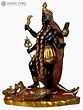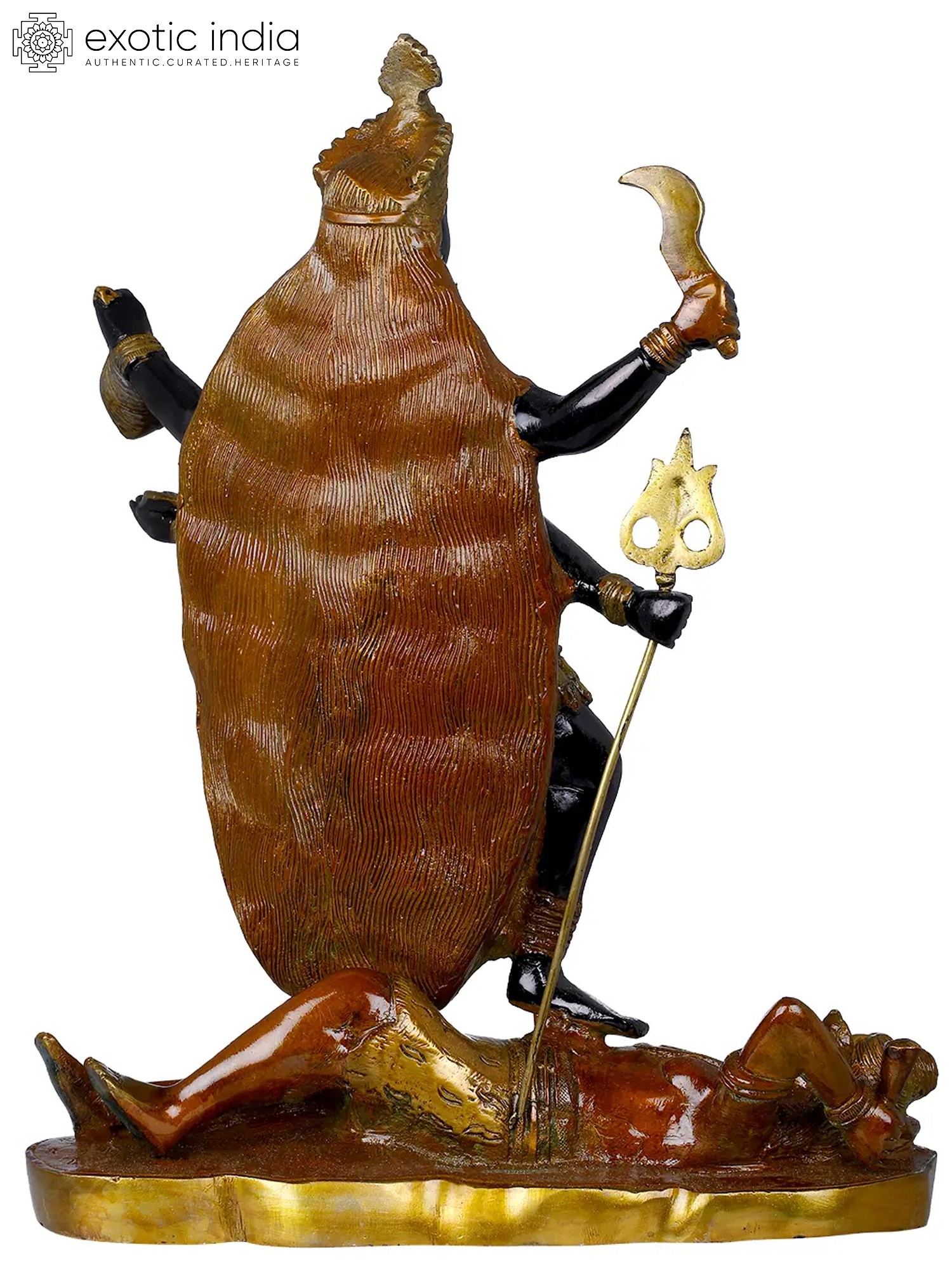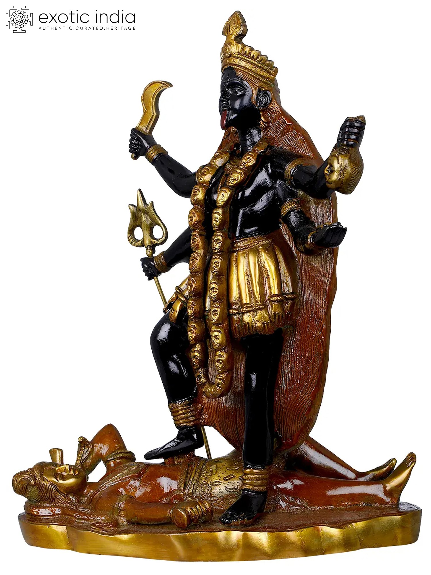 The warrior mother goddess is depicted in this brass idol wearing a gold crown, a crescent moon on her forehead, earrings, a beautiful necklace, armlets, bangles, and Kada on her feet. The femininity of her jewellery is starkly contrasted by the garland of skulls of her enemies as well as the girdle of their hands. In her four hands, Kali Mata holds Khadag (sickle), Trishul (trident), Khappar (cup made of a skull), and the head of a demon whose blood drops fill the cup from which the great goddess drinks. Under her feet is Shiva, identifiable through the snakes in his ornamentation and his damru. In imagery as well as in ritual theory, Shiva is seen as subordinate to the goddess in her form as Mahakali. Framed stunningly by her open tresses, goddess Kali looks serene and powerful in this brass statue.
