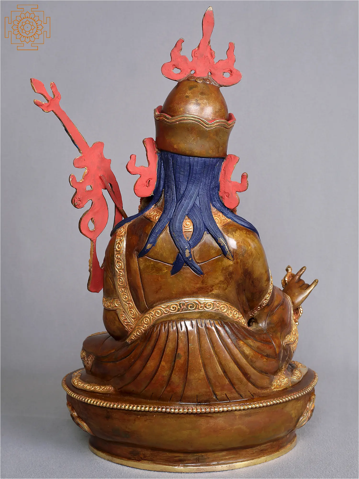 Padmasambhava or “he who is born from the Padma or lotus” is a potent master of Vajrayana or Tantric Buddhism, revered in Tibet and Nepal as the guru or teacher who brought ideas of Tantra to the regions. Traveling the snow-capped mountains, gathering students and learned men, and compiling the ideas of Buddhism, Padmasambhava represents the pinnacle of a person’s quest for enlightened wisdom. This beautiful copper statue from Nepal with gilding work is dedicated to the great master Padmasambhava, who is attired in traditional garments, with a skull cap worn in the Himalayas, and ornaments to mark his sacred status.