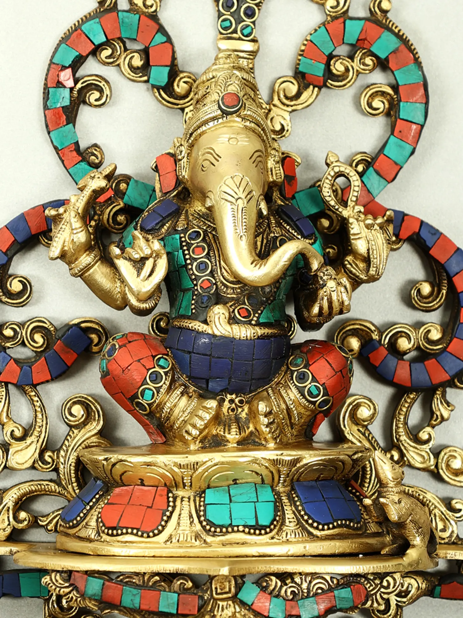 Invite the benevolent presence of Lord Ganesha into your home with this exquisite brass wall hanging. Standing at an impressive fourteen inches, this piece is more than just a decorative item; it is a testament to intricate craftsmanship and deep spiritual significance. Lord Ganesha, revered as the god of wisdom, intellect, and prosperity, is depicted here in a seated posture, radiating an aura of calm authority. His elephantine form, symbolizing strength and intellect, is rendered with meticulous detail, capturing his divine grace. The brass itself, a metal associated with divinity and auspiciousness in many traditions, gleams with a warm, inviting sheen. This is further enhanced by the stunning inlay work that adorns the entire piece. Vibrant chips of coral red and turquoise blue are meticulously set into ornate patterns, creating a visual spectacle that draws the eye and speaks of ancient artistry. These stones, often imbued with protective qualities and symbolic meanings in various cultures, add layers of depth and beauty to the divine form of Ganesha. The rich blue can represent the vastness of the cosmos or the serene depth of wisdom, while the fiery red symbolizes energy, passion, and the overcoming of obstacles.