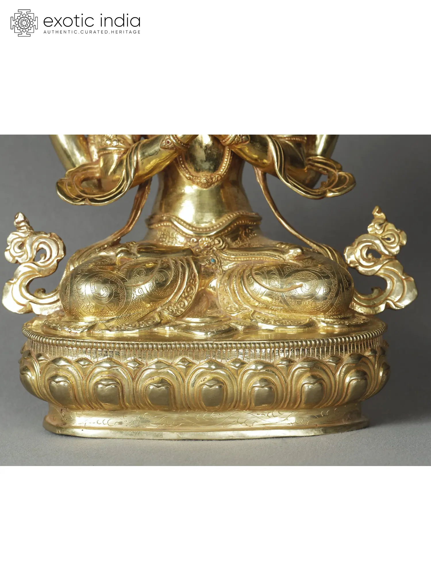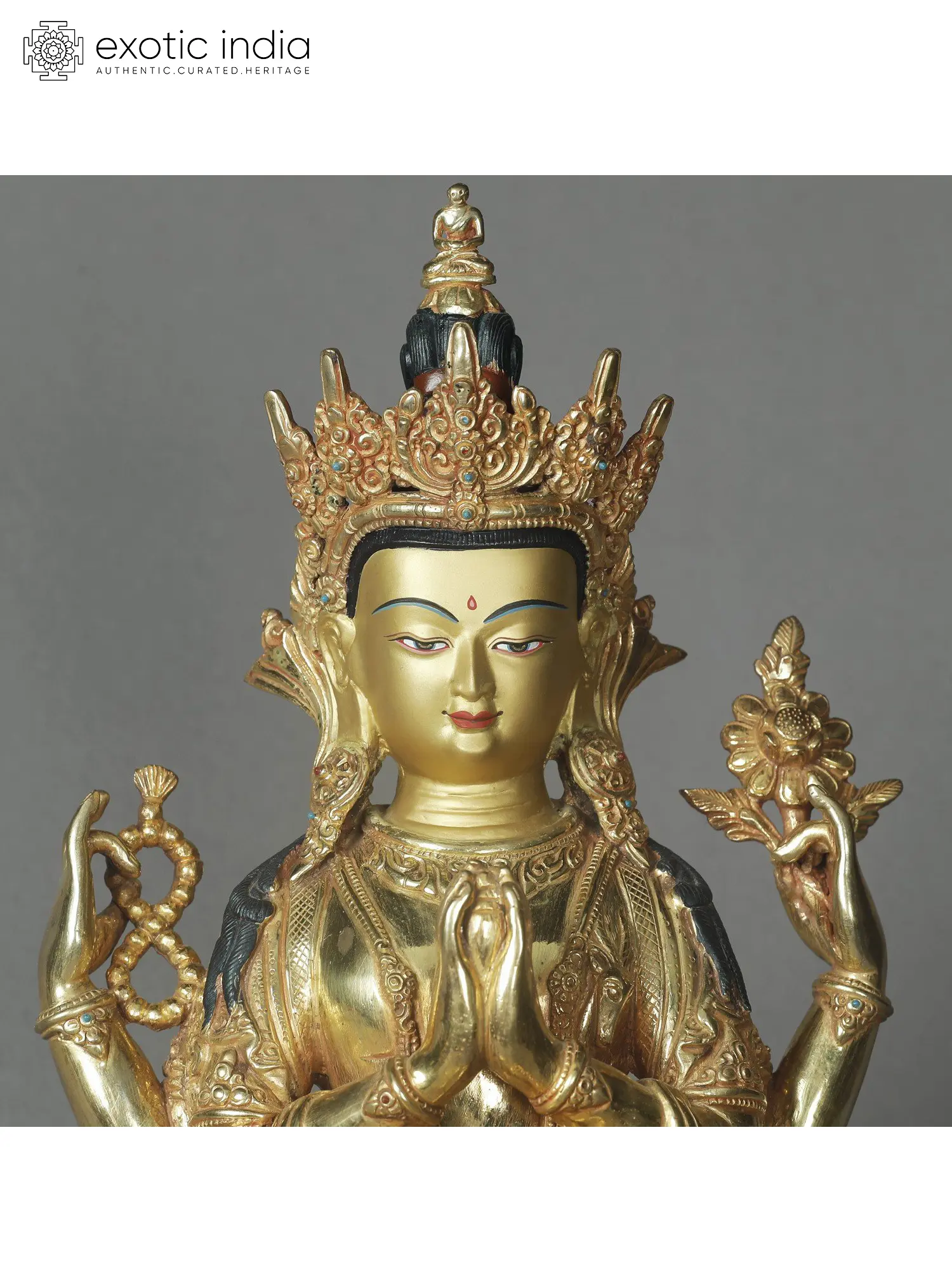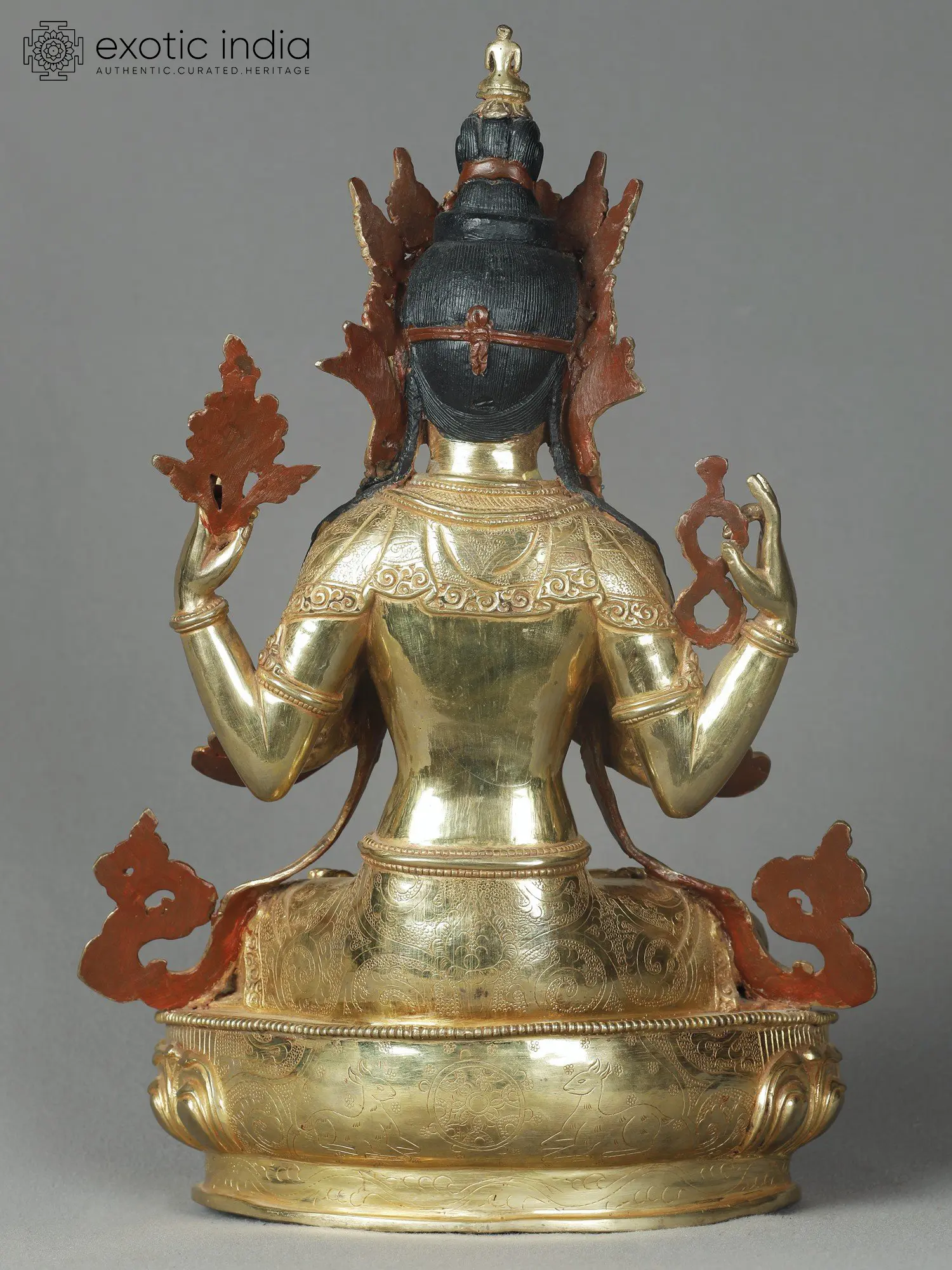 Seated in the padmasana (lotus posture), his dual legs symbolize the path of a Bodhisattva—the choice to defer nirvana in favor of alleviating others' suffering. His initial two hands are clasped over his heart, symbolizing his commitment to safeguard all beings in the presence of Buddhas. Nestled within those hands rests a wish-fulfilling jewel, a testament to his compassionate Bodhichitta.