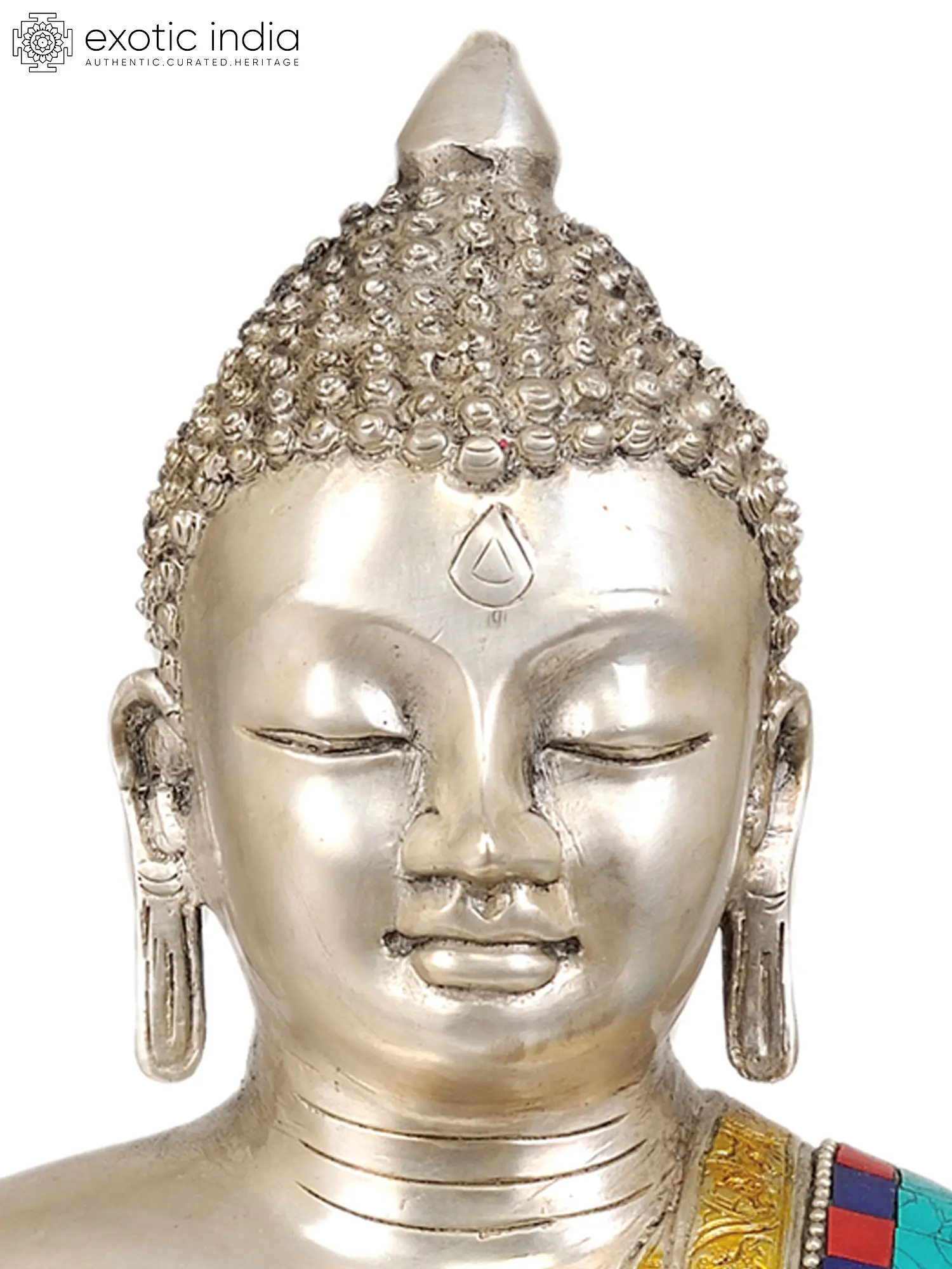 Each element of this magnificent statue speaks of dedication and artistry. The gleaming brass, polished to a mirror-like finish, provides a luminous backdrop to the richly colored stones. The fine detailing on the Buddha's ushnisha (the cranial protuberance signifying his wisdom) and the serene folds of his robes demonstrate the skill of the artisan. This piece is not merely a decorative object but a conduit for spiritual contemplation. It is a testament to the enduring legacy of Indian craftsmanship, where sacred art is infused with deep cultural and religious significance. Possessing this statue is like holding a piece of ancient wisdom and a fragment of divine tranquility, brought to life by skilled hands.