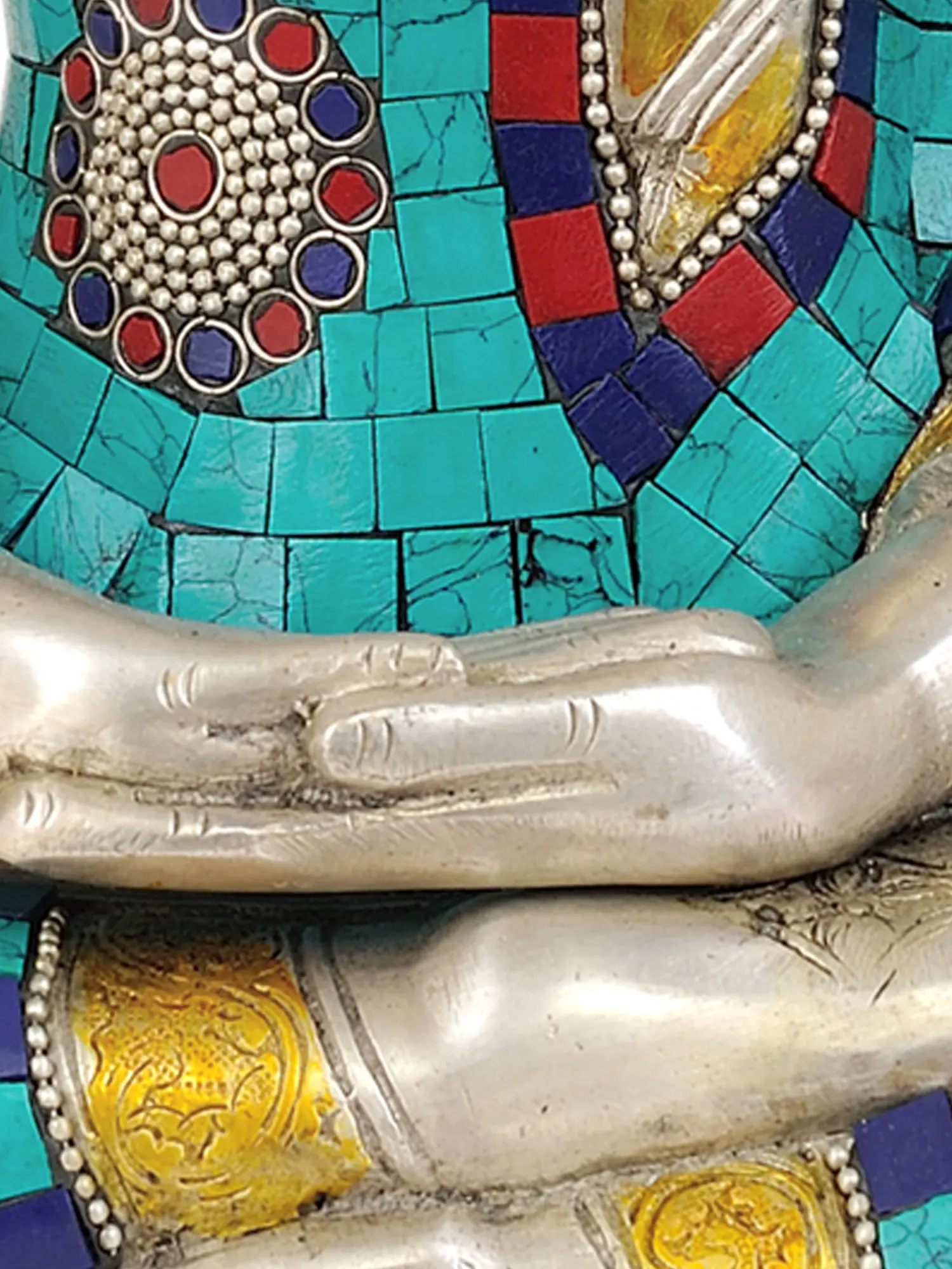 What truly sets this statue apart is the breathtaking inlay work that adorns the Buddha's robes. The traditional saffron and maroon hues are replaced by a vibrant tapestry of turquoise and red, each stone meticulously cut and set into the brass. The robes are patterned with geometric precision, creating a visual rhythm that is both soothing and stimulating. Interspersed within the mosaic are intricate circular motifs, embellished with small, sparkling stones, adding an opulent touch. This decorative style draws inspiration from the rich artistic heritage of India, where inlay work has been a celebrated craft for centuries, often seen in royal palaces and religious artifacts. The choice of turquoise and red also carries symbolic weight; turquoise is often associated with healing and protection, while red symbolizes energy and vitality.