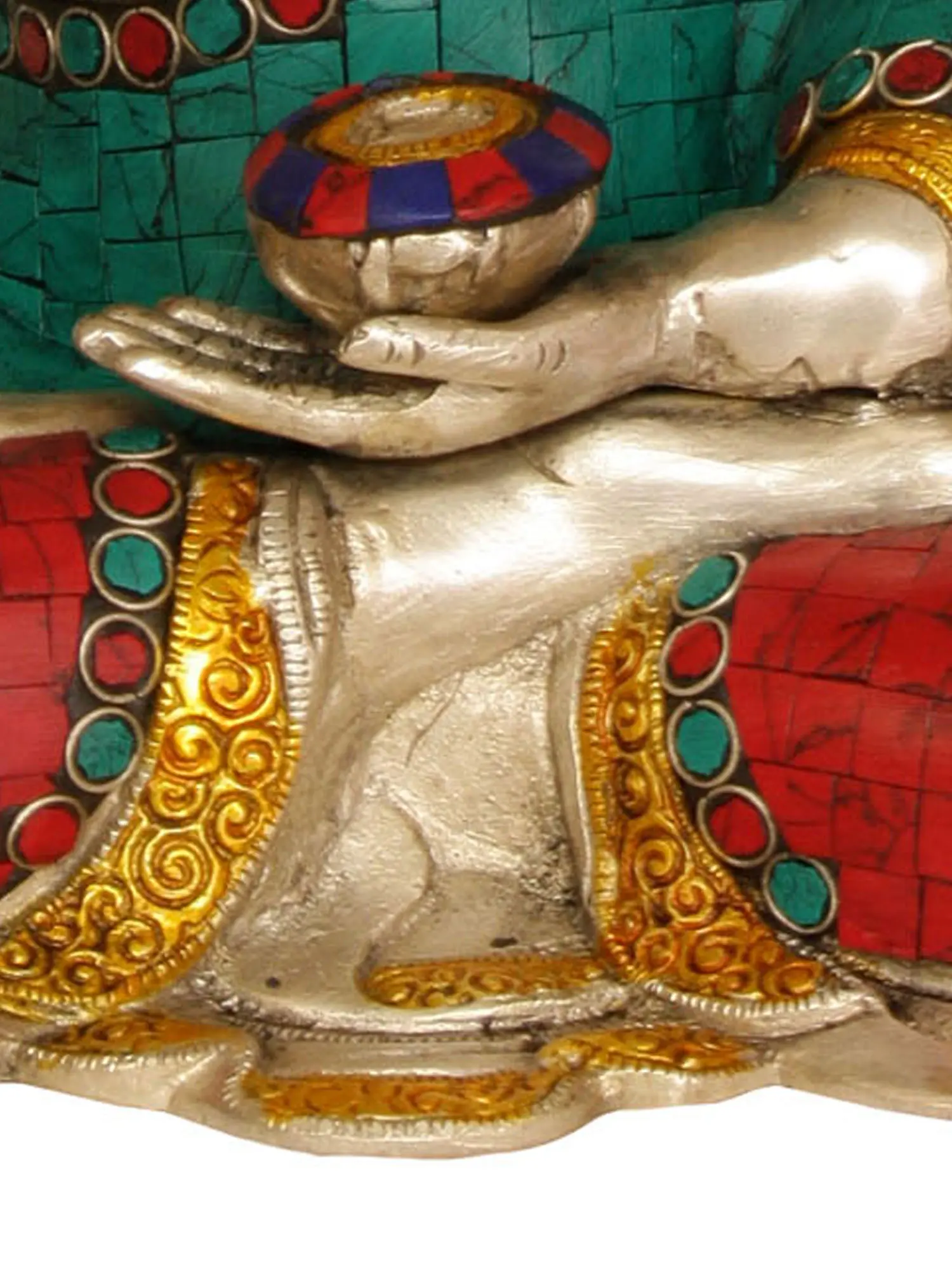 This exquisite brass sculpture captures the serene essence of Lord Buddha at the moment of his profound realization, interpreting and disseminating the sacred Law of Dharma. Seated in a meditative posture, the figure emanates an aura of unparalleled tranquility and wisdom, a testament to the spiritual heights attained by the Awakened One. The meticulous craftsmanship, a hallmark of traditional Indian artistry, is evident in every detail, from the gentle curve of the lips to the perfectly rendered urna on his forehead. The robe, rendered in a vibrant turquoise hue, is adorned with a rich mosaic of inlaid stones. Interspersed with floral motifs of crimson and emerald, these precious stones create a visual symphony, echoing the beauty and complexity of the Dharma itself. The intricate gold work that borders the robe adds a layer of opulence and sacredness, suggesting the divine nature of the teachings being conveyed. The lower garment, a striking crimson, is similarly embellished, creating a harmonious interplay of colors and textures that draws the eye and invites contemplation. In his left hand, Buddha cradles a bowl, often interpreted as an alms bowl, symbolizing his renunciation of worldly possessions and his commitment to a life of service and compassion. His right hand is raised in the Abhaya Mudra, the gesture of fearlessness, offering reassurance and protection to all beings.