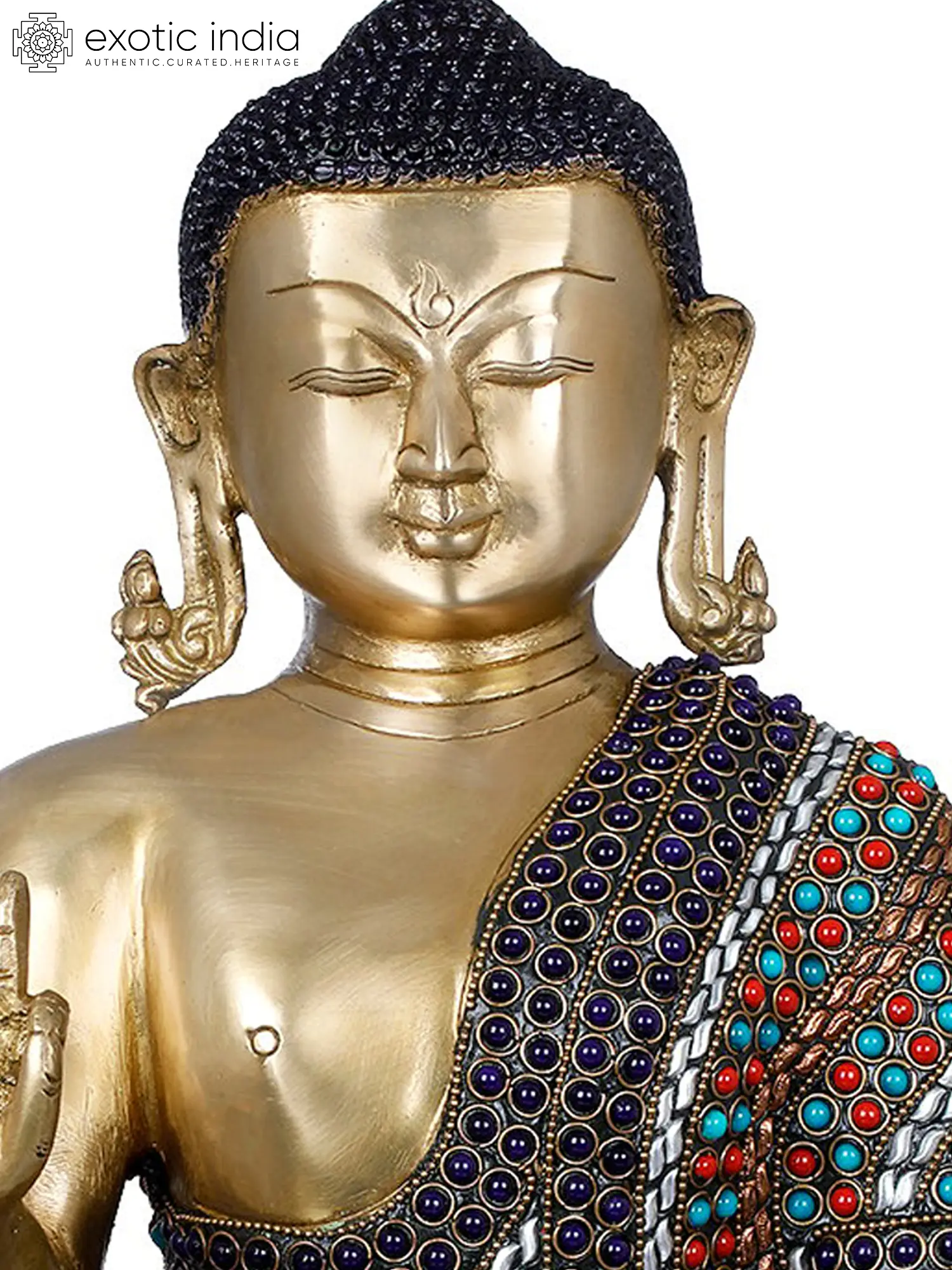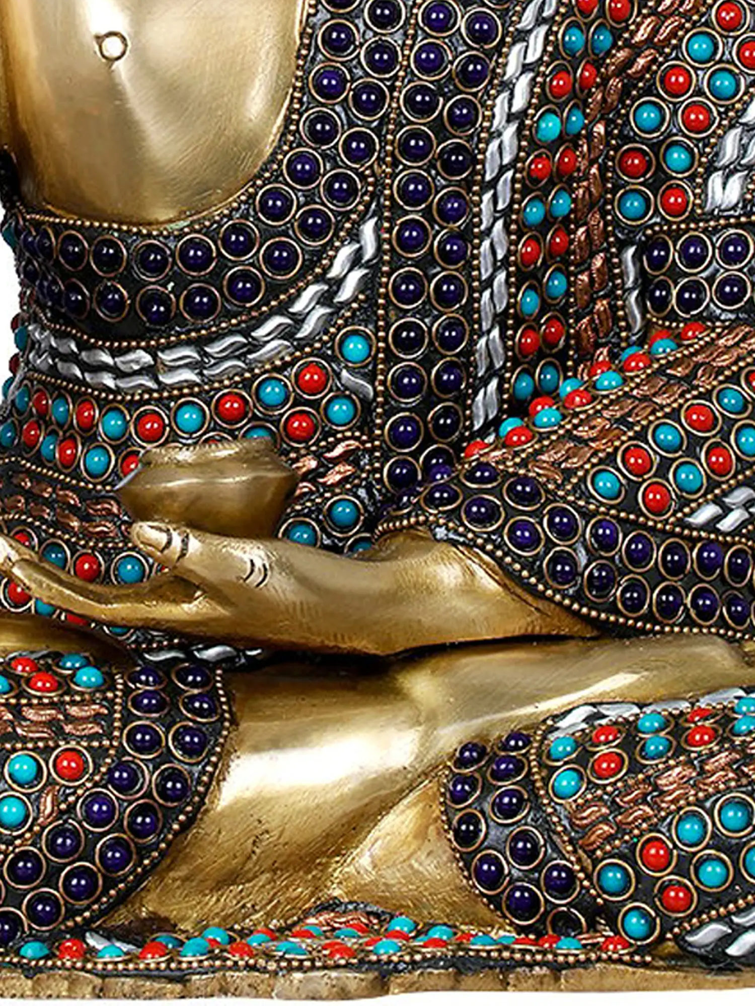 This magnificent brass sculpture captures the serene countenance of Lord Buddha in the act of preaching his profound Dharma, his teachings that illuminate the path to enlightenment. Seated in a meditative posture, the figure emanates an aura of deep wisdom and boundless compassion. The meticulous craftsmanship, a testament to generations of Indian artisans, brings this sacred image to life with an unparalleled level of detail and devotion. The Buddha's face is a study in tranquility. His eyes are gently closed, suggesting an inward gaze into the profound truths of existence. A subtle smile graces his lips, hinting at the joy and peace that accompany true understanding. The urna, a small bump or dot between the eyebrows, symbolizes his third eye, a mystical organ capable of seeing beyond the material world. His ushnisha, the cranial protuberance, is adorned with a dark, textured finish, representing his attainment of ultimate knowledge. The flowing robes are intricately adorned with a mosaic of colorful beads, including deep purples, vibrant reds, and calming turquoises, interspersed with circular brass elements. These embellishments not only add to the visual splendor but also symbolize the multifaceted nature of the Dharma, which caters to diverse understandings and experiences.