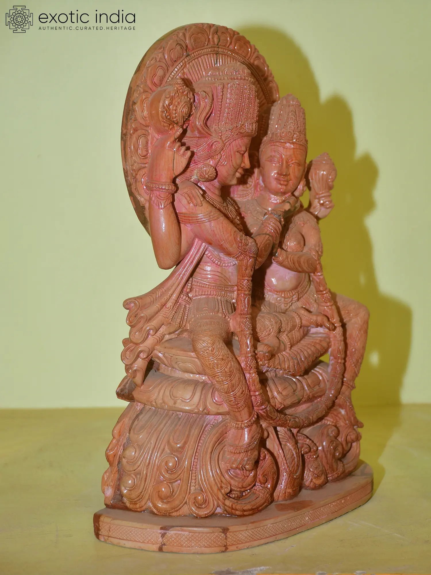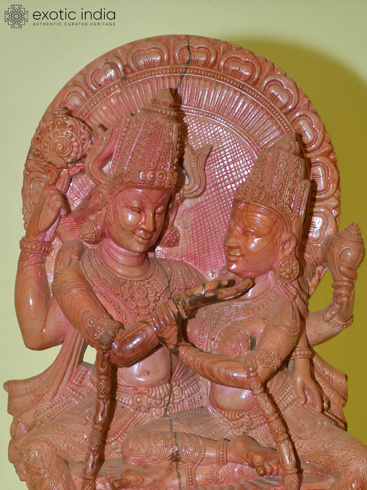 This exquisite hand-carved statue captures the sacred union of Lord Vishnu and Goddess Lakshmi, the divine embodiment of preservation and prosperity respectively. Crafted from rich, red stone native to Odisha, a region renowned for its millennia-old sculptural traditions, this artwork is a testament to the skill of its artisans and the deep spiritual currents it represents. The stone itself, with its subtle variations in hue and texture, lends a natural warmth and gravitas to the figures, inviting contemplation and reverence. Lord Vishnu, the preserver of the universe in Hindu cosmology, is depicted with his characteristic serene yet powerful demeanor. He is often described as resting on the cosmic serpent Shesha, overseeing the cycles of creation, sustenance, and destruction. Here, he is shown seated, his presence exuding a calming aura. The intricate detailing on his crown and attire speaks to the opulence and divine nature attributed to him. Beside him sits Goddess Lakshmi, the radiant consort of Vishnu and the bestower of wealth, fortune, and beauty. Her gentle posture and compassionate gaze reflect her role as the provider and nurturer. In Hindu traditions, Lakshmi is invoked for material as well as spiritual well-being, and her presence is believed to bring abundance and auspiciousness into homes and lives. The detailed carving of her ornaments and garments further accentuates her divine grace and majesty.