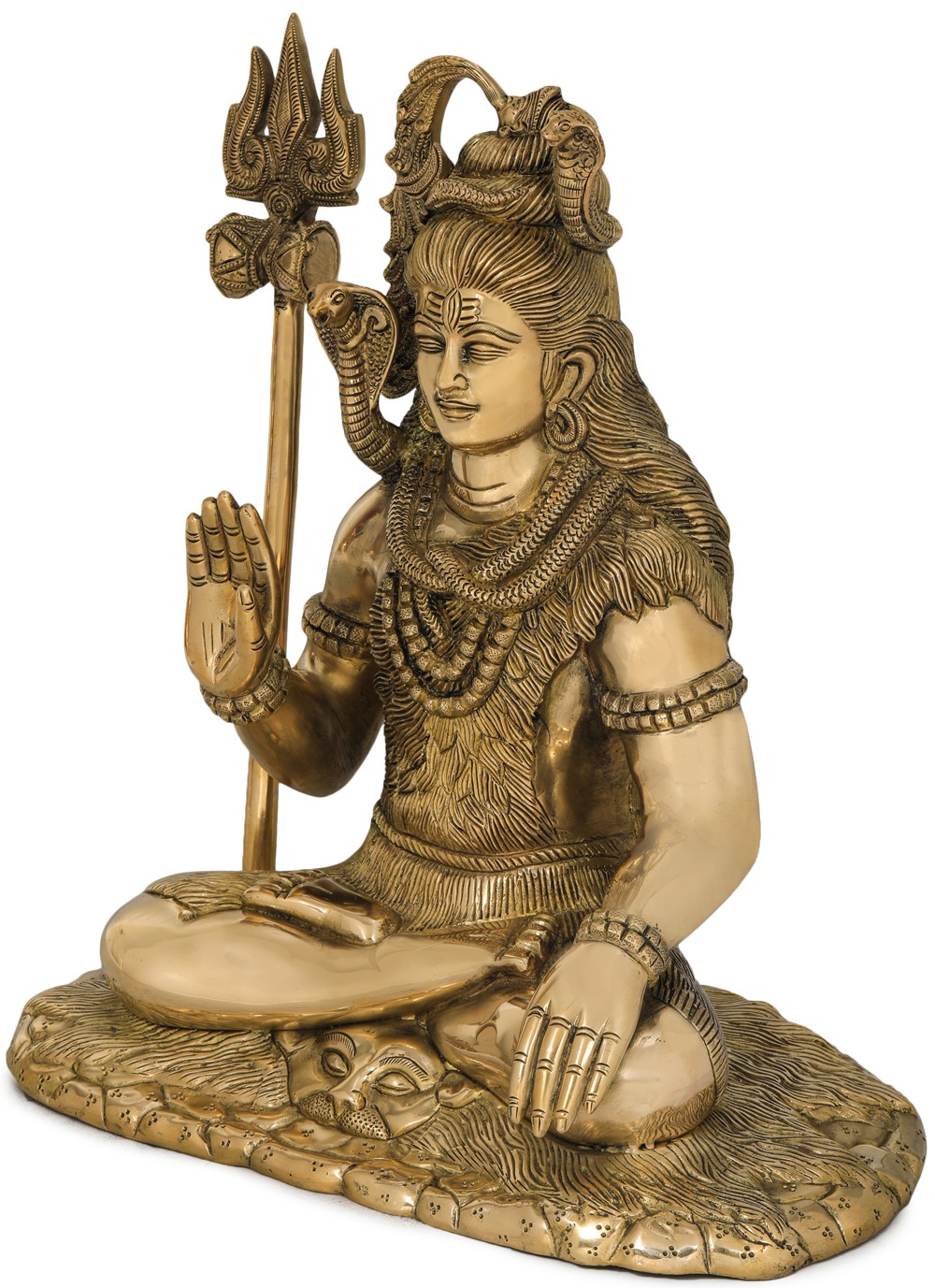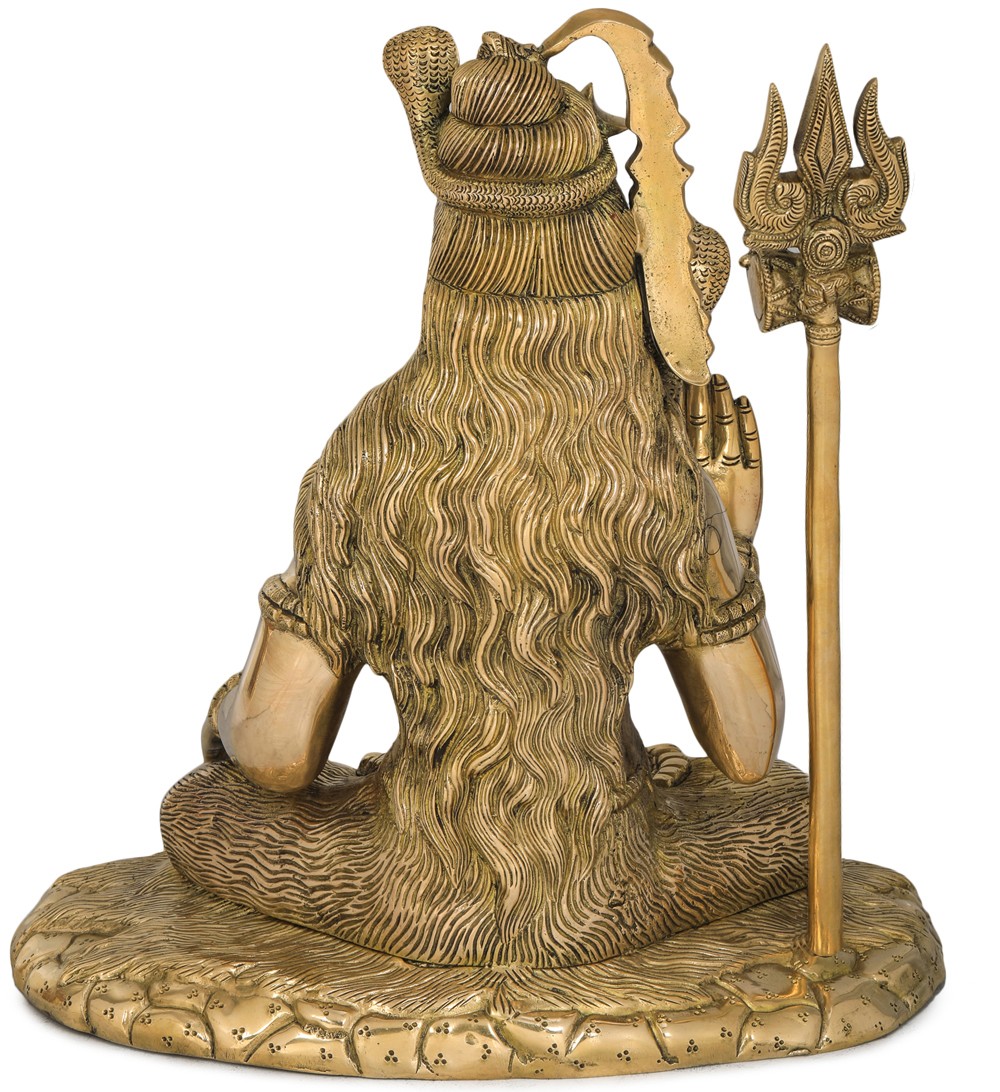 This brass sculpture represents Shiva settled on a tiger mat in a meditation posture; all adorned in a tiger skin symbolic of his mastery of the divine force over animal instincts. The sculptor has carved his tiger clothes and mat in deep and close realistic striations.