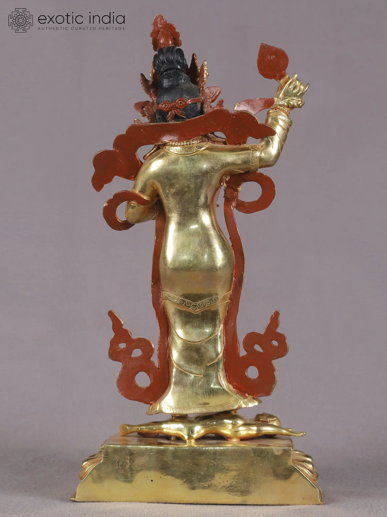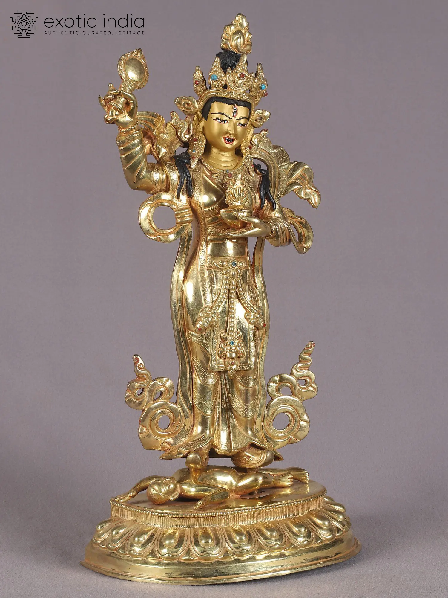 The symbol of supreme enlightenment and its powers, Mahakala is associated with the pinnacle of awakened clarity which is achieved through the fire of inner consciousness. Showing in a standing position his fiery expression, and composure of countenance that is decidedly wrathful characterizes this flawless, gold-gilded copper sculpture from Nepal. Mahakala is known as the great wrathful Dharmapala in Nepal whose image is installed in most of the Buddhist viharas and temples. His countenance is adorned with the unique feature of three eyes—an embodiment of his omniscient awareness that encompasses all beings and circumstances.