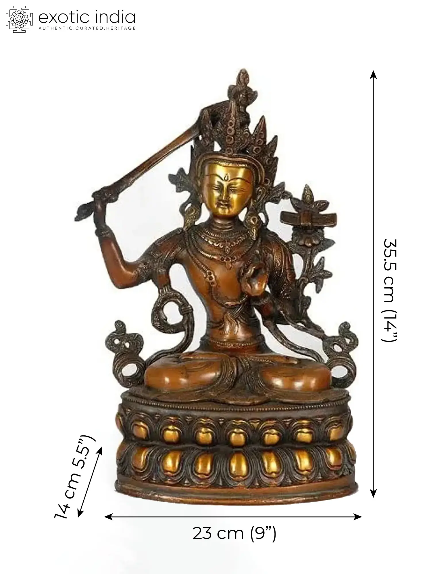 In his right hand, symbolizing the male aspect, he wields a flaming sword, a potent instrument that dispels ignorance. In his left hand, representing the female aspect, he holds the book of transcendental wisdom, often positioned on a lotus flower, symbolizing purity and enlightenment.