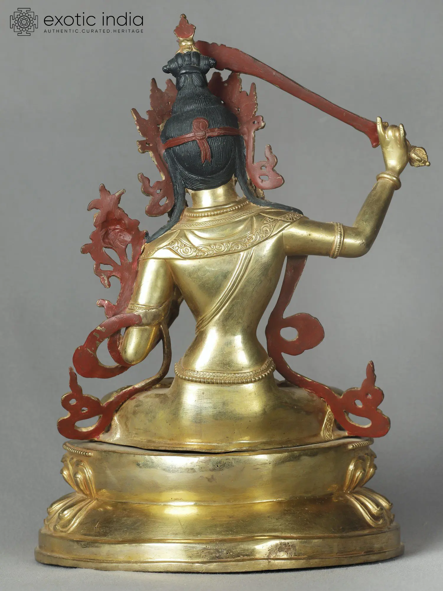 The sword clutched in his right hand epitomizes the knowledge that severs ignorance in those yet unenlightened. His left-hand cradles a sutra, representing the foundational conduit through which wisdom takes root, marking the inception of their journey towards omniscience.