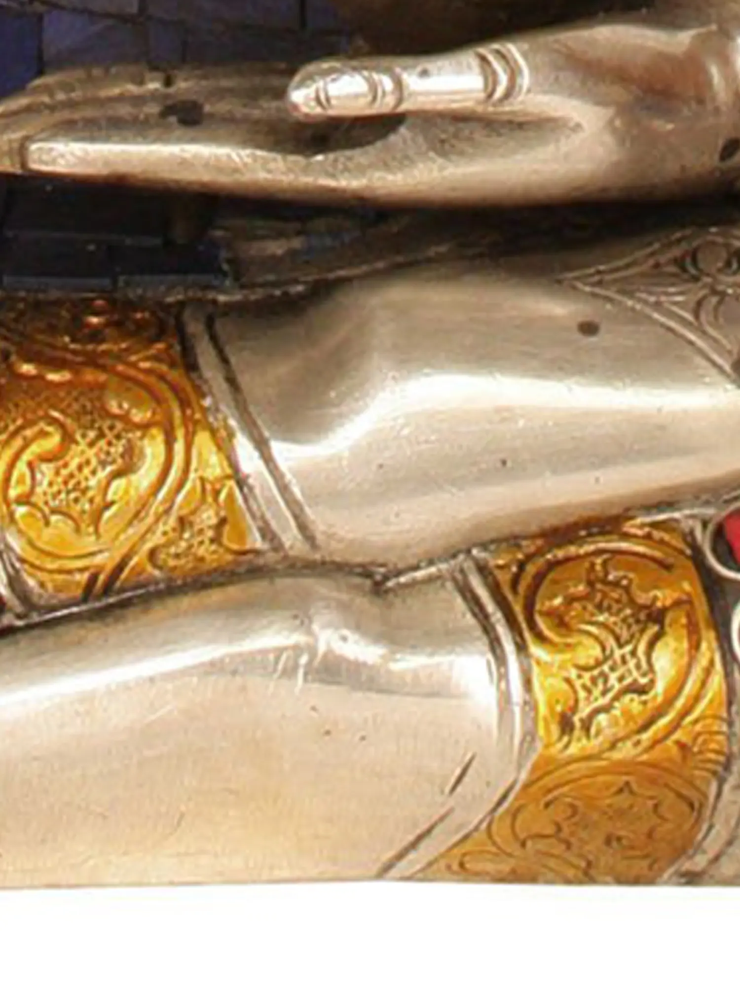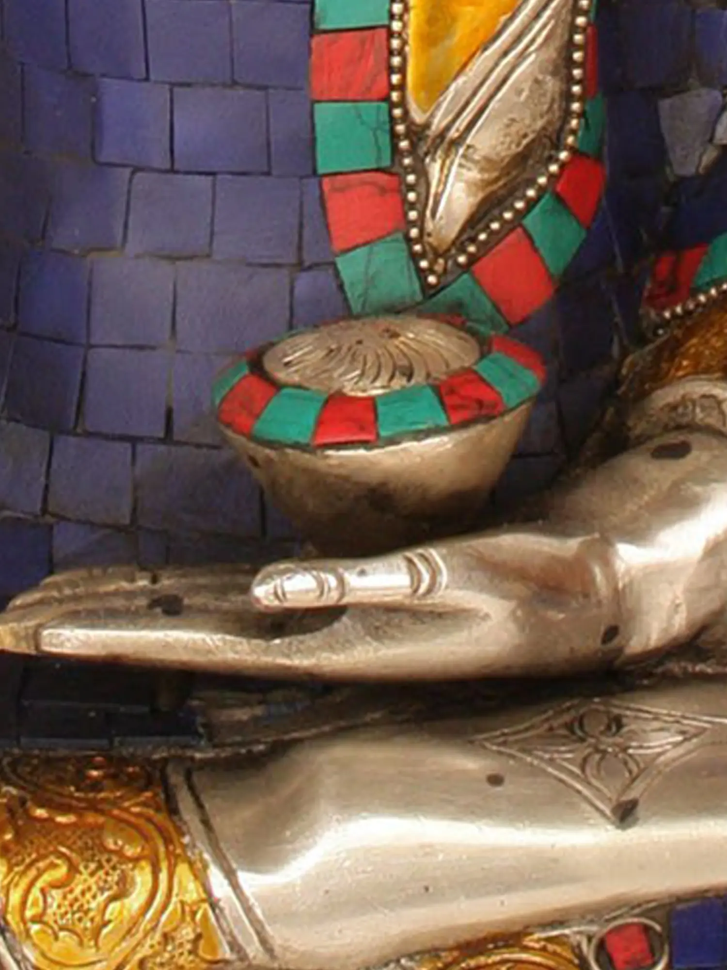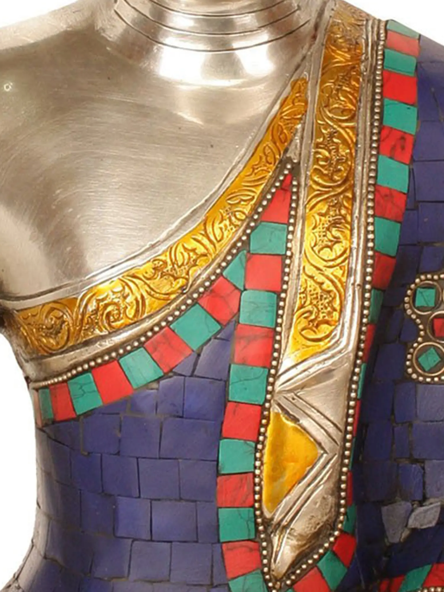 Handcrafted with meticulous attention to detail in India, this statue is a testament to the enduring traditions of Buddhist artistry. The figure is cast in high-quality brass, polished to a radiant sheen that evokes a sense of purity and divine light. The intricate inlay work, featuring vibrant lapis lazuli, coral, and turquoise stones, adds a profound depth and spiritual significance to the piece. The deep blue of the lapis lazuli represents the infinite sky and the primordial state of being, while the red coral symbolizes life force and protection, and the green turquoise signifies wisdom and overcoming obstacles. These precious stones are not merely decorative; they are believed to enhance the healing energies of the deity and imbue the space with their auspicious qualities. ––––––––––––––––––––