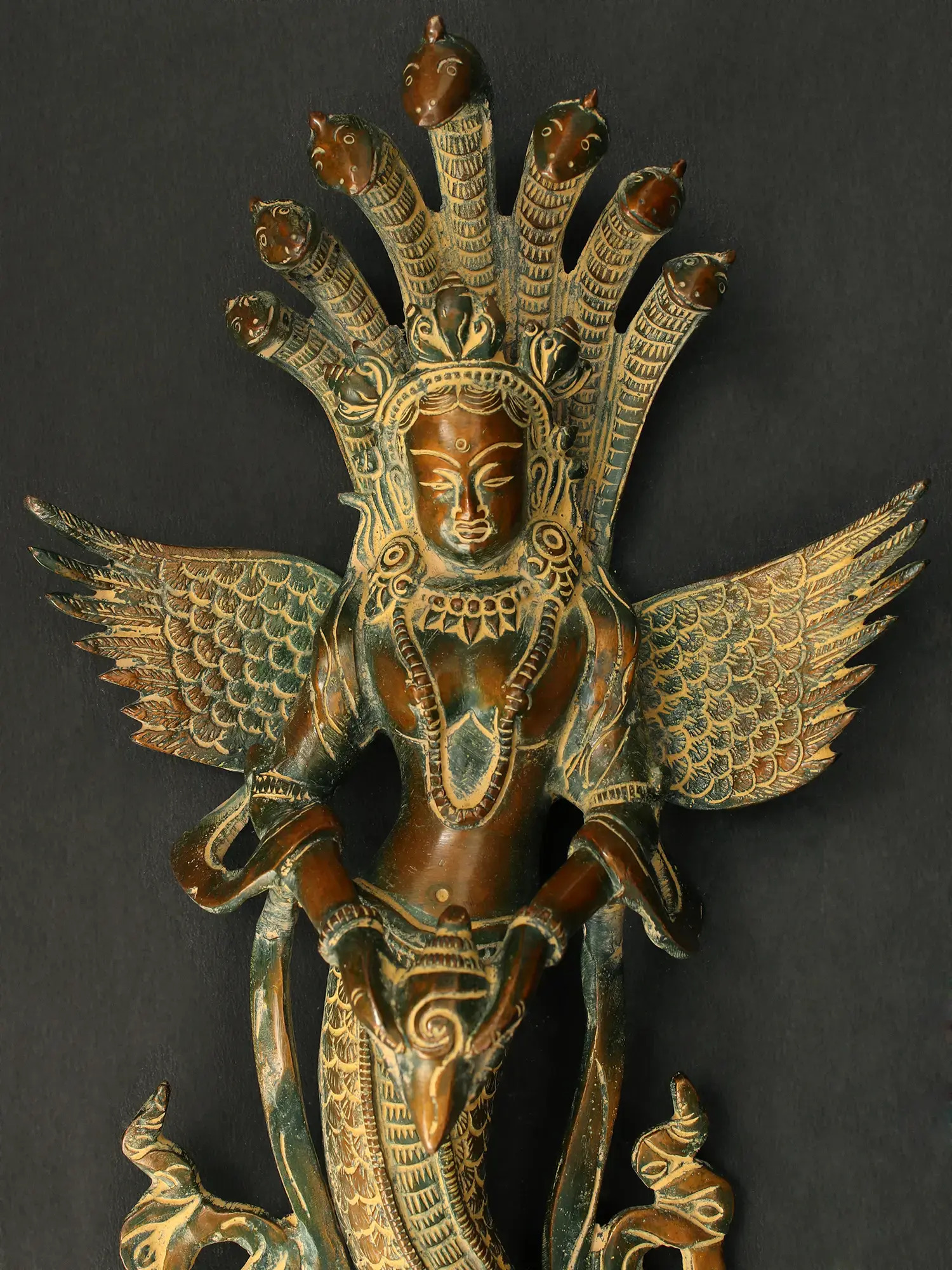 This brass wall hanging depicts the Naga Kanya with Garuda wings and a conch, symbolizing the awakening to a higher level of enlightenment.