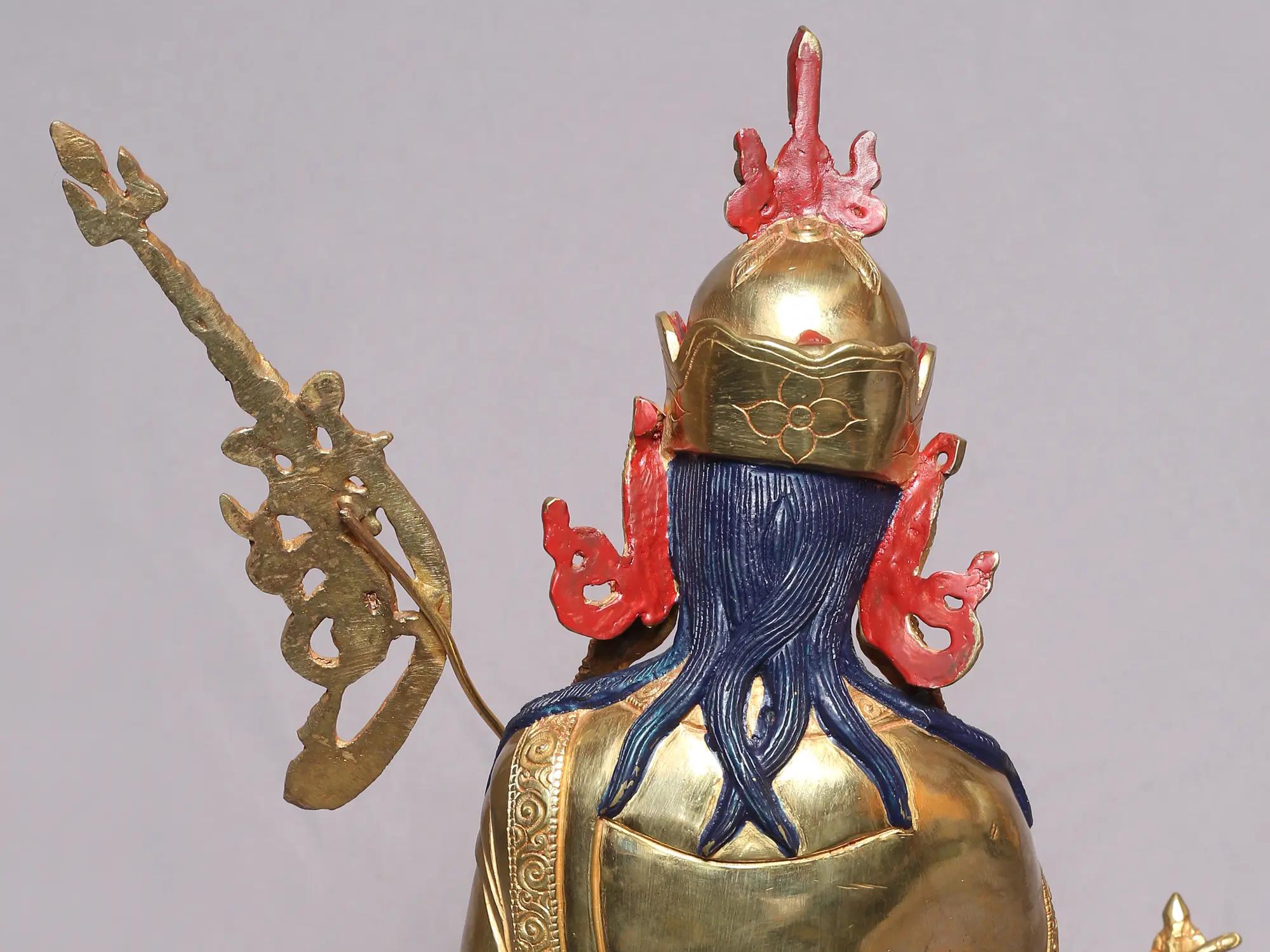 Additionally, he is grasping a tantric staff, or Khatcanga, which is a ceremonial tool kept in the bend of the left arm. The seven-jewel insignia, or seven principal possessions of Chakravartin, were displayed below him. These included a pair of elephant tusks, a unicorn or rhinoceros horn representing the precious horse, a round golden earring belonging to the precious Queen, a square golden earring belonging to the precious Minister, a coral branch, and eight-faceted flaming jewels arranged in a pyramid formation with six visible jewels.