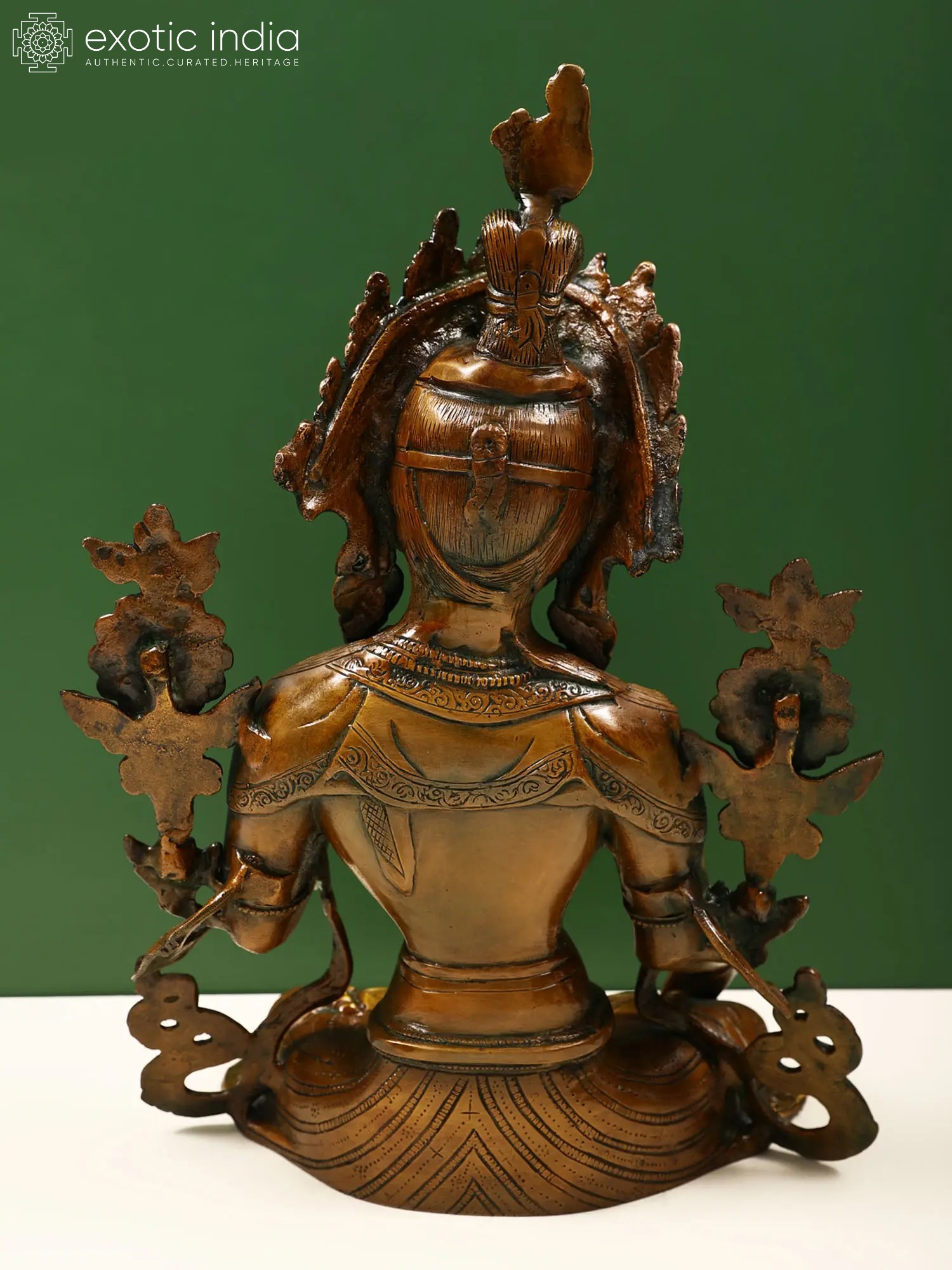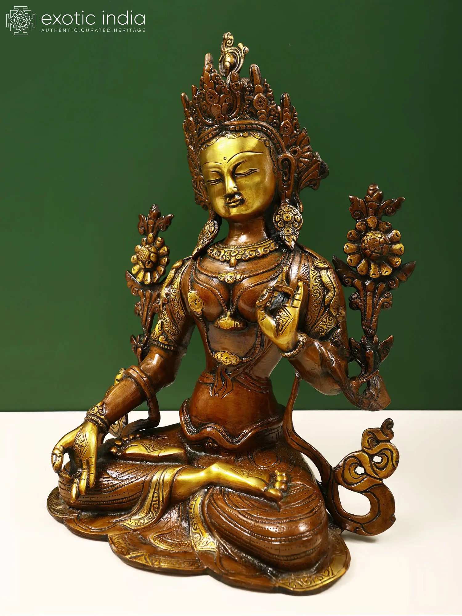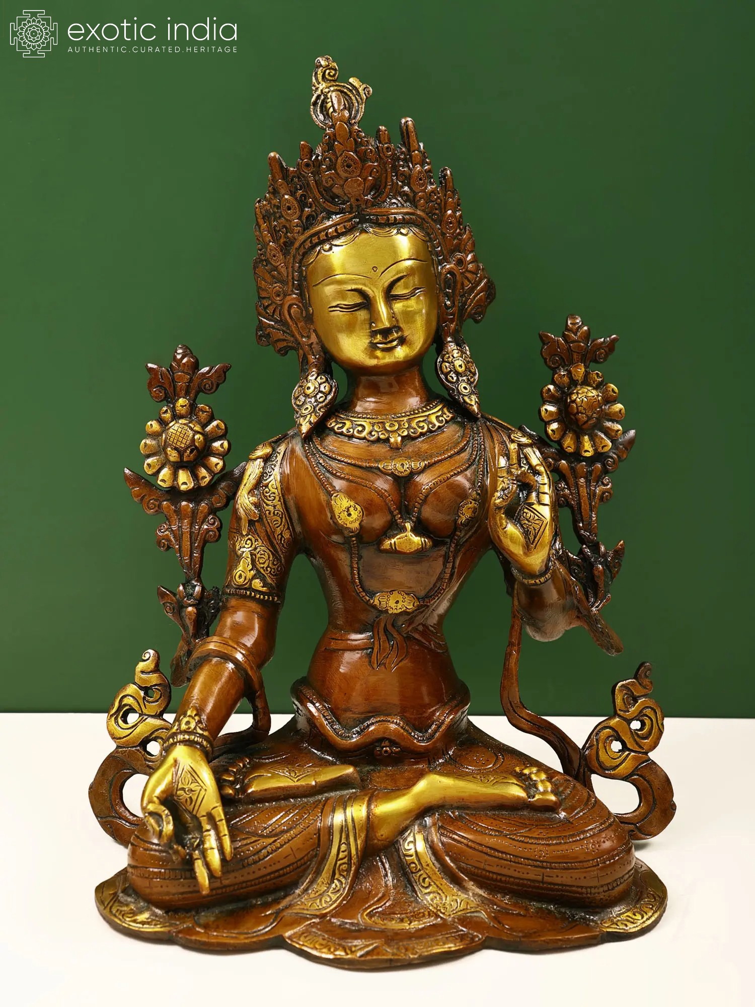 Devi Tara is in a flowing robe of gracious beige colour. From the vines clad around Her flawless limbs rises a flower on either side of Her, flanking Her bust. Glimmering karnakundalas rest upon Her clavicles as they dangle from Her wizened ears, and a cascade of traditional style necklaces grace Her uppser torso. Her legs are in padmasana, as is the norm with Buddhist iconography, and a crown of multiple spires and luxuriant engraving sits on Her brow.