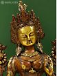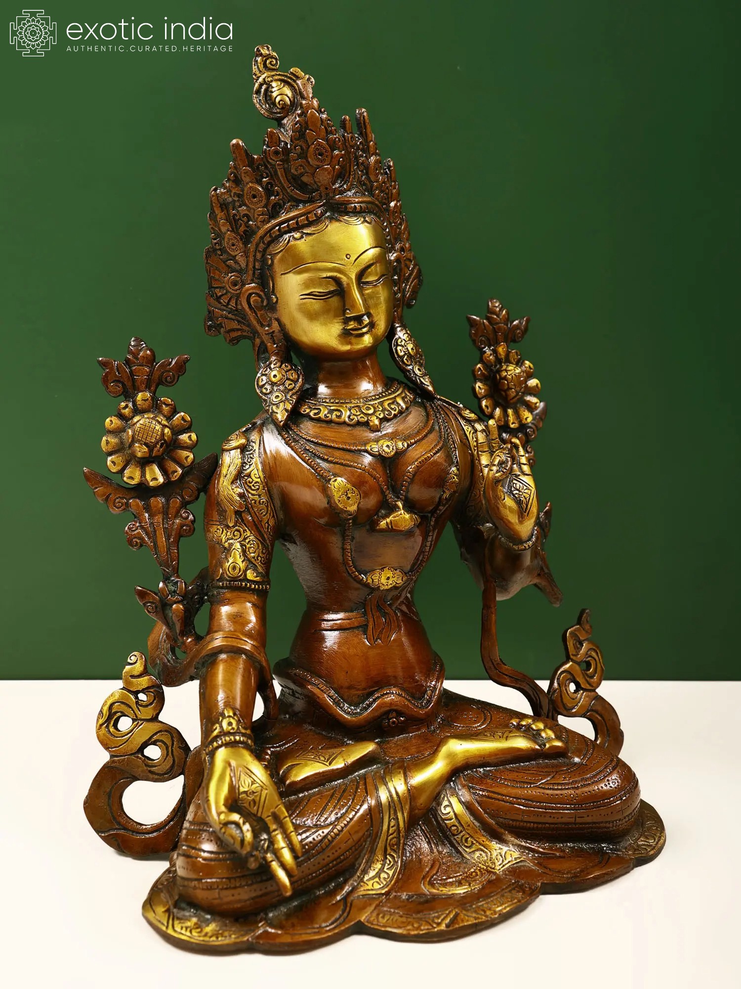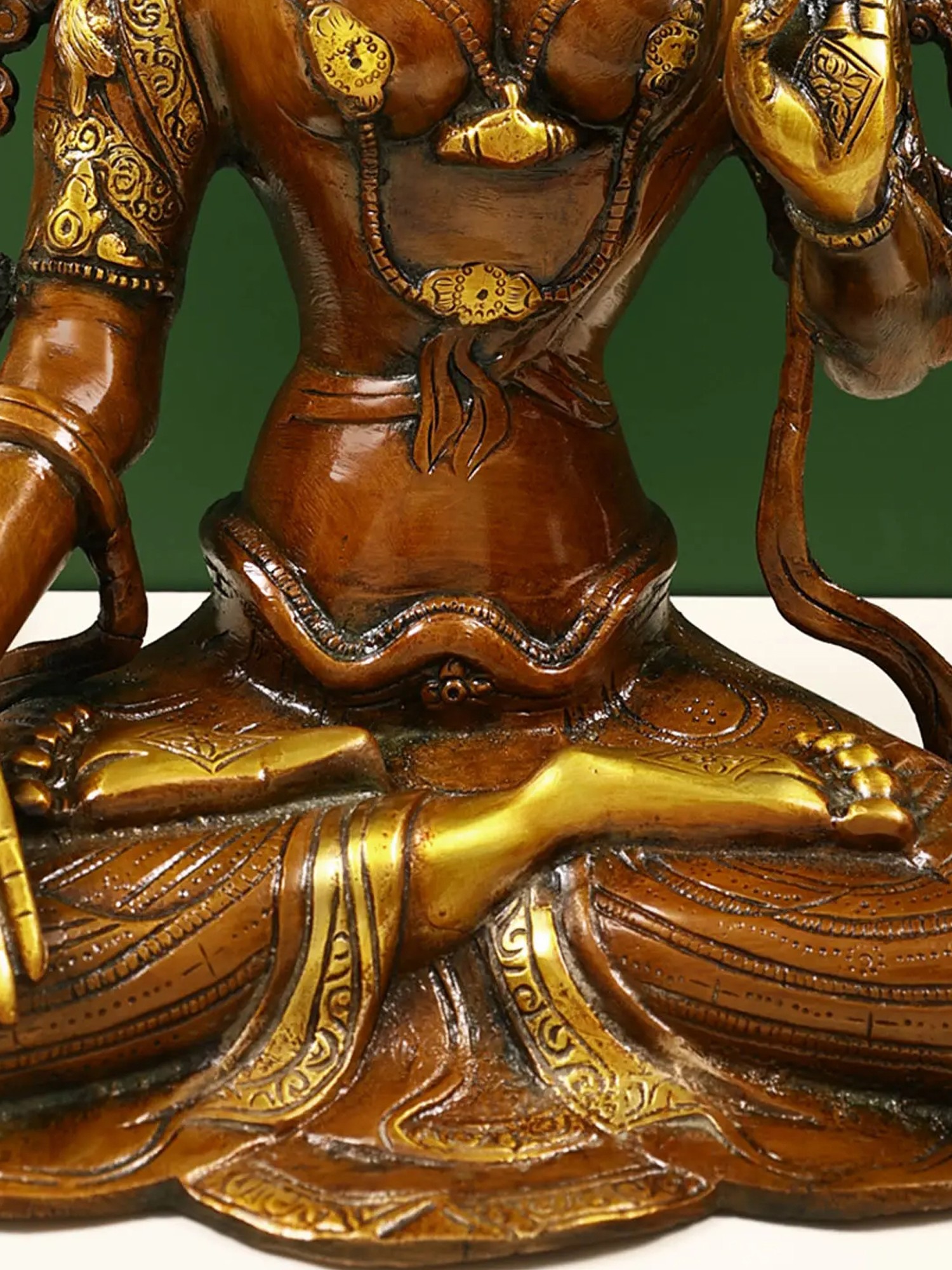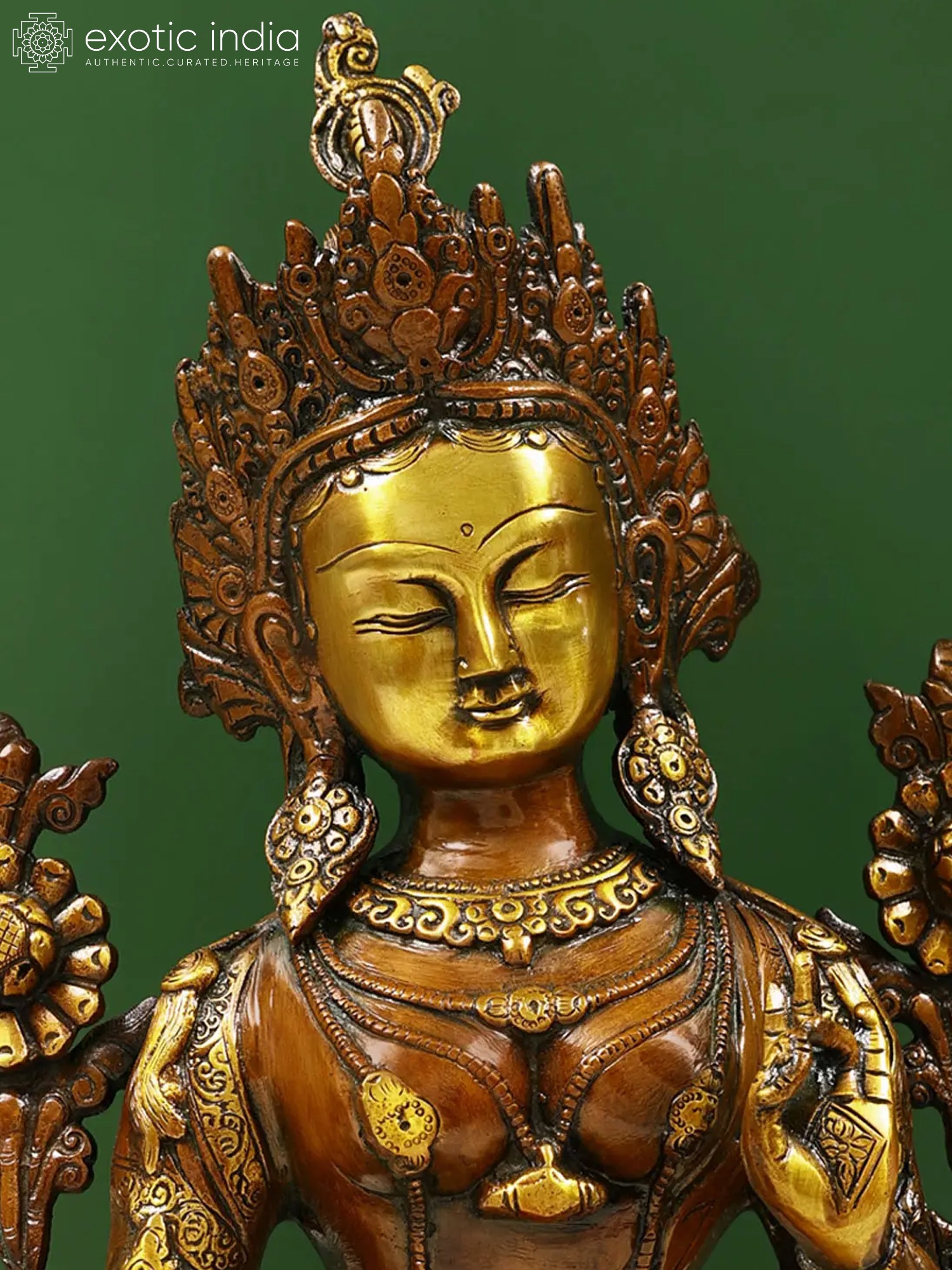 Given the compassion of Her personality, Devi Tara is arguably the most popular and devoutly sought after Bodhisattva of the Mahayana pantheon. Her stance is in keeping with this side of Her personality - the shoulders gently curved, half-shut eyes and a subtle tilt of the neck as if She is leaning in to listen to the fervent call of Her devotees in ihaloka (earthly realm). Indeed, She is born from the compassionate tears of Lord Avalokiteshvara and, as the deity Chenrezig, is His wife.