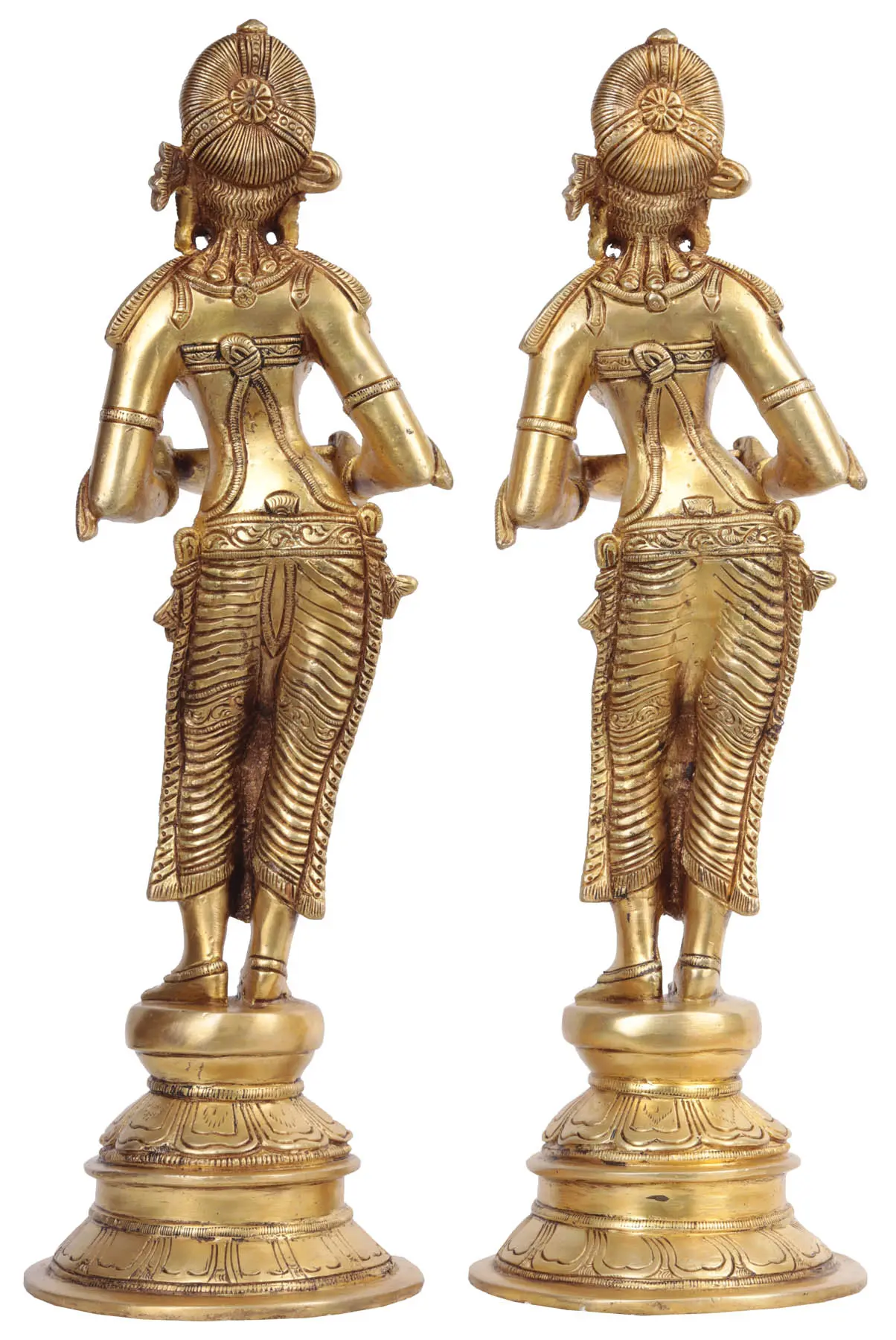 Deepalakshmis are the two celestially lovely deities Who are placed at entrances to make all who walk in feel welcome. Note the harmonious composure of countenance, their curvaceous beauty, and the welcoming arti in Their hands.