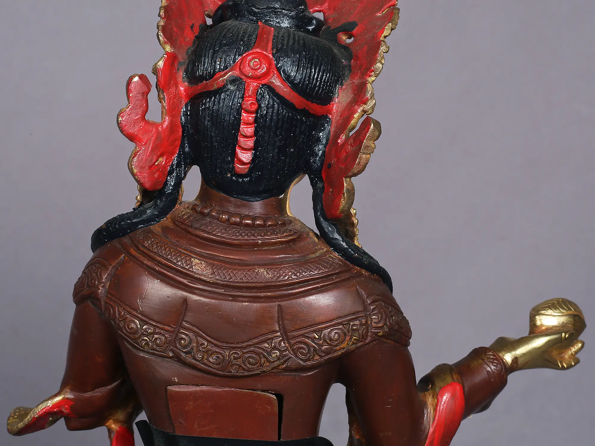Nepalese statues and sculptures have a high copper content and therefore develop a slightly reddish patina on the surface as they age. However, the most unique feature of Nepalese copper statues is their decorative detailing. The pieces are heavily gilded and sometimes inlaid with semi-precious stones. This embellishment protects them from getting tarnished. The traditional lost-wax method for casting Nepalese copper statues remains the most practiced technique in Nepal for many centuries. This process involves many steps and requires skilled artists.