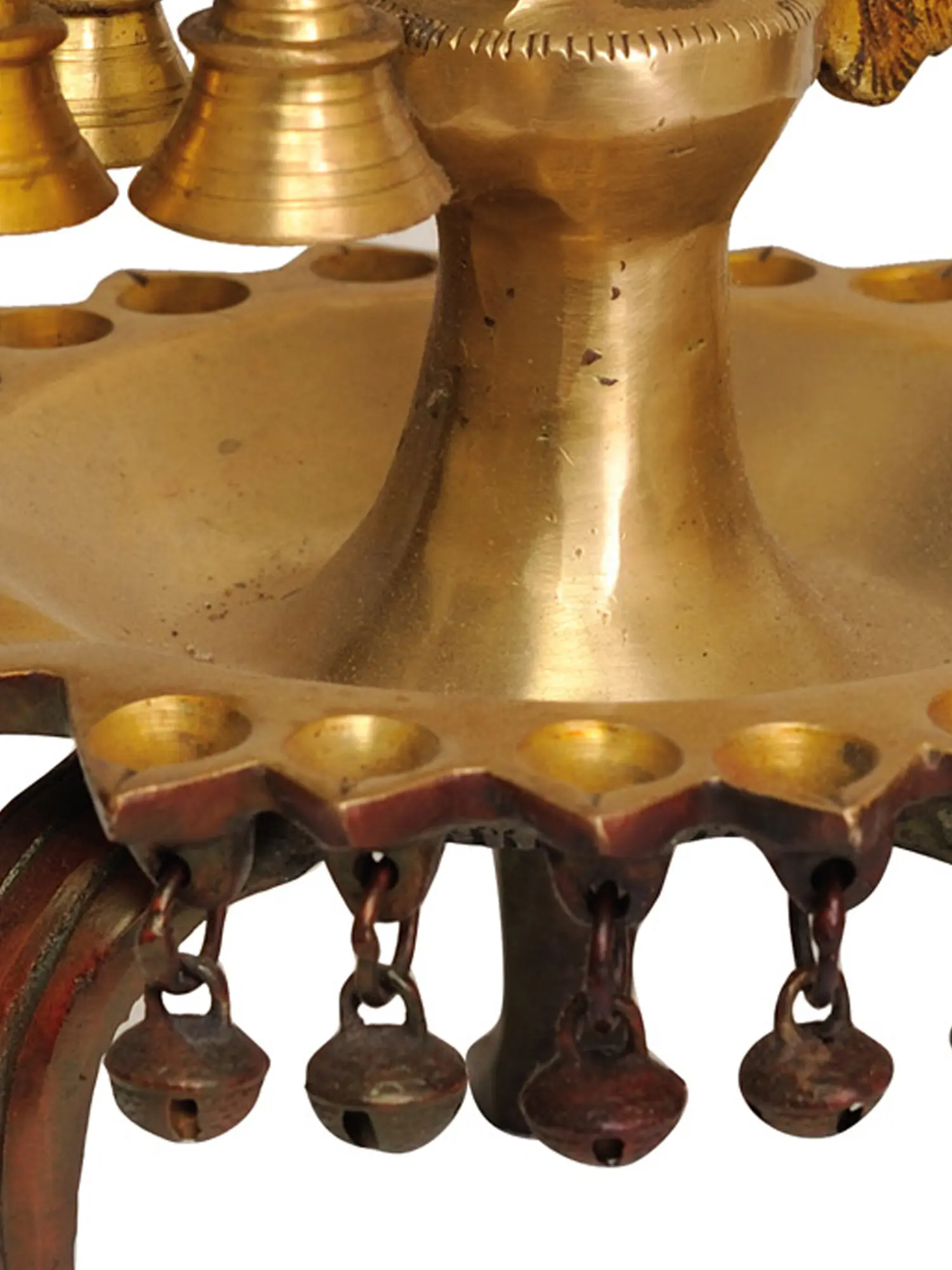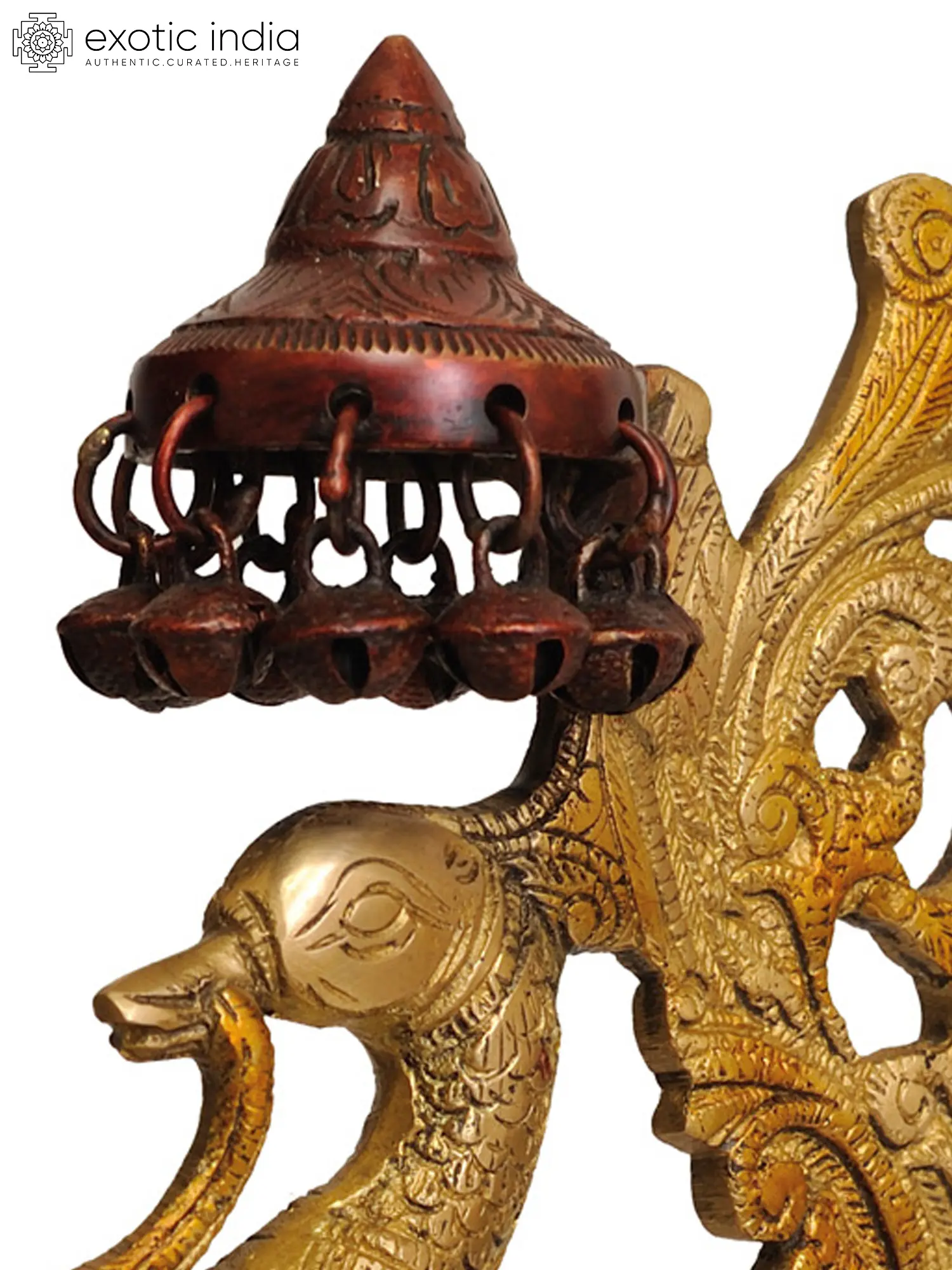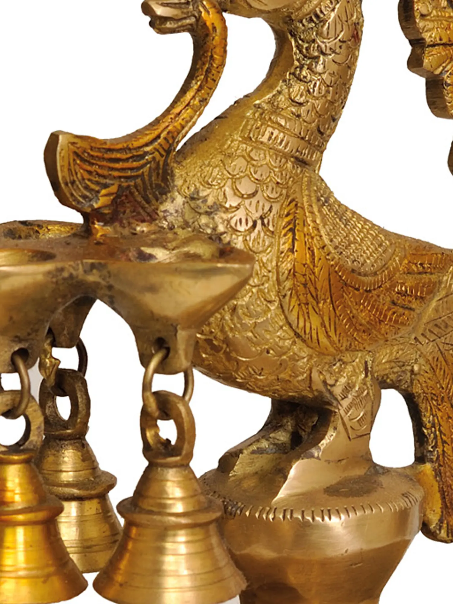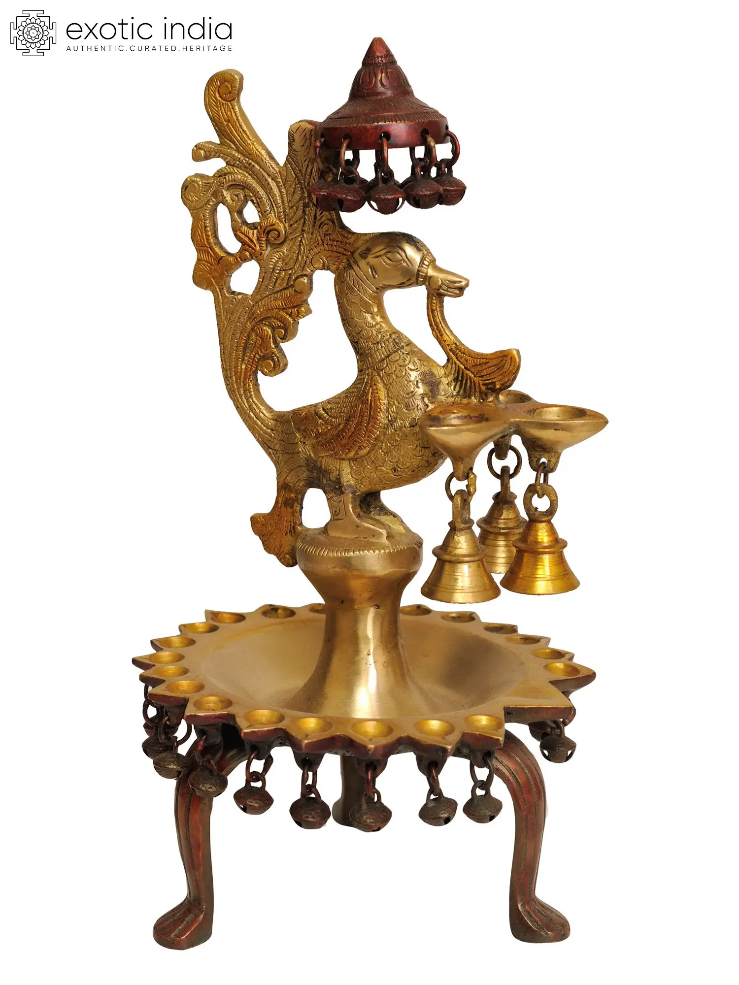 This handcrafted Brass Peacock Lamp from India is a stunning work of art with a beautiful lacquer finish. A gorgeous peacock perches gently on a multi-wick platform, sheltered by an exquisite parasol studded with melodic bells. The peacock holds a three-wick lamp in its mouth, with additional bells hanging below, creating a symphony of sound and light. This lamp emanates regal appeal and spiritual importance, resting on three majestic Singha or lion stands. The flourishing tail of the peacock represents development and wealth, making it a bright source of illumination and a strong sign of auspiciousness and abundance for any holy or living area.