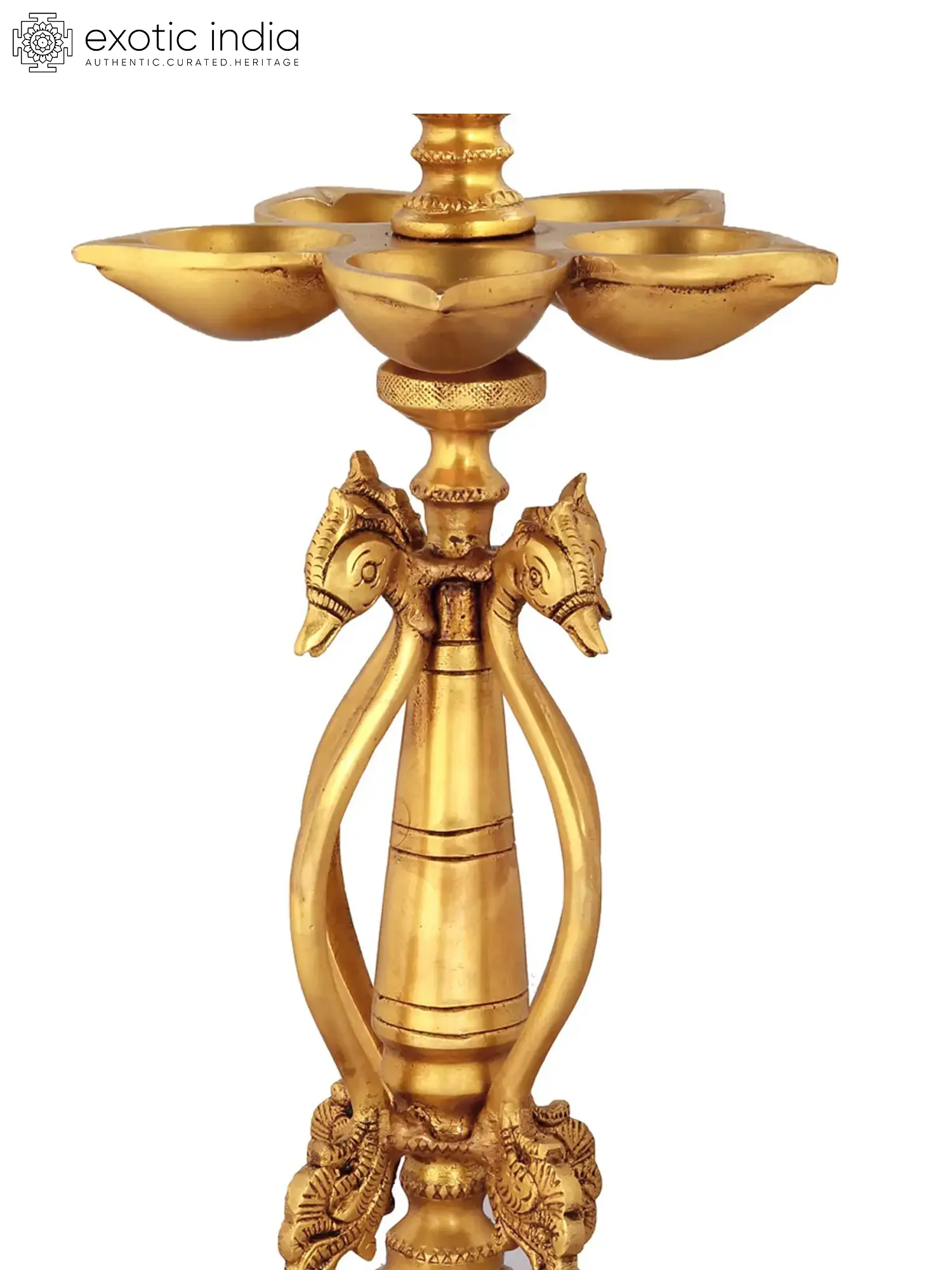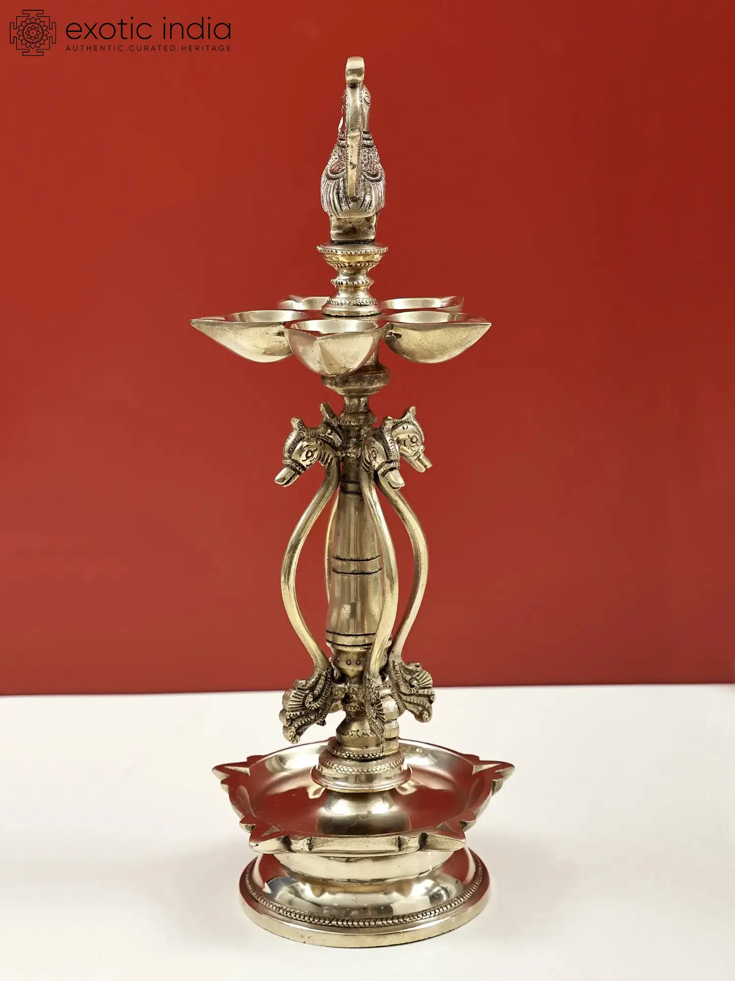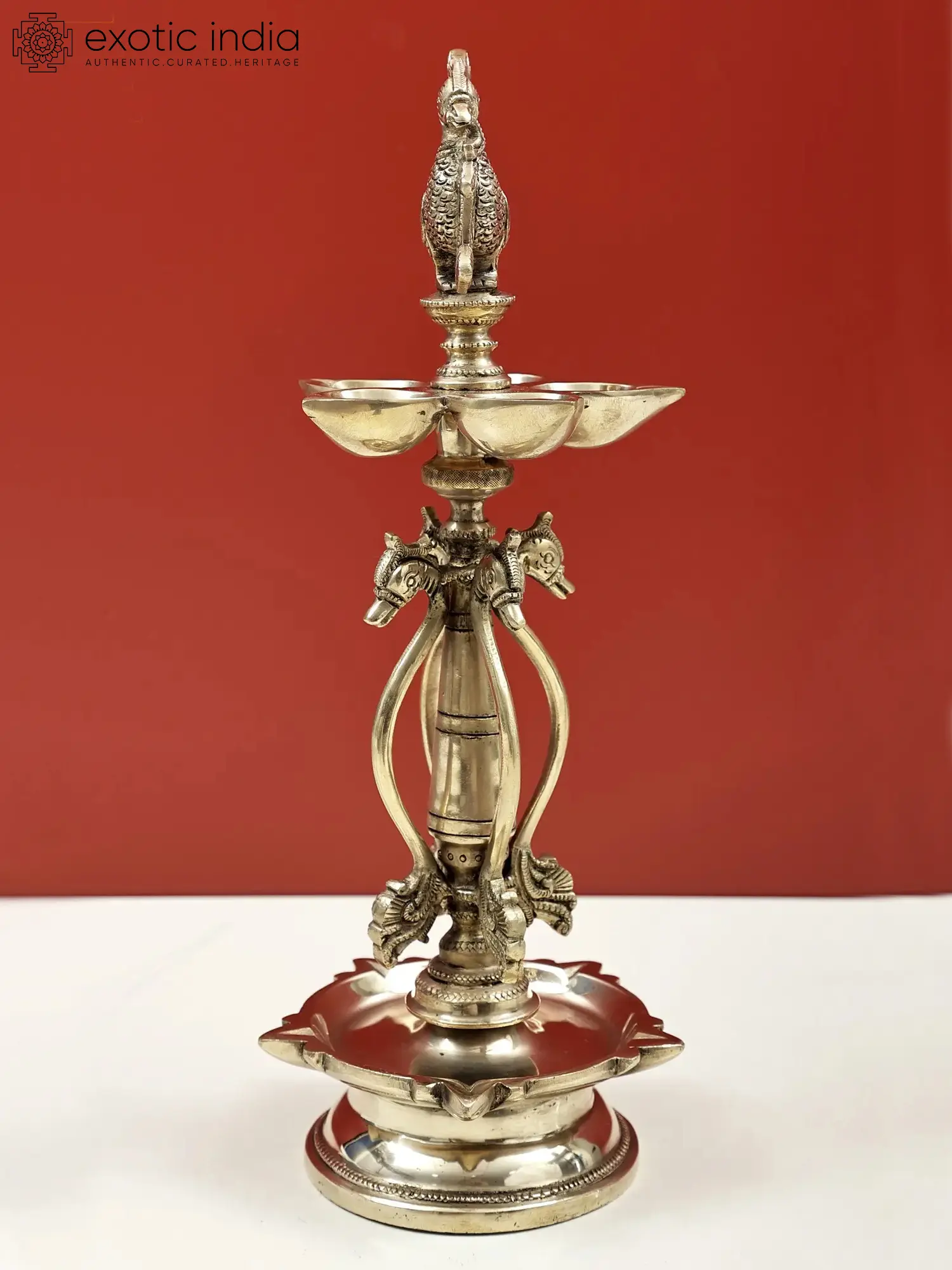 The peacock is a legendary bird associated with time regulation. It is believed to have originated from the feathers of Garuda. This particular bird is so powerful that it overcomes the boundaries of human life, and therefore, it is valued and appreciated by everyone, especially by the royal people. This has made the graceful bird one of the greatest sources of inspiration for an unusually high number of artworks in India. A respectful brass lamp with the holy peacock motif, a sacred bird that brings wealth and prosperity. This lamp consists of a central image of a peacock and two tiers of lamps. Parrots are placed on the lamp's stem, and the base is elevated. This lamp is a testament to the brilliant lamp craftsmanship of this country and qualifies to become an heirloom that stays with generations.