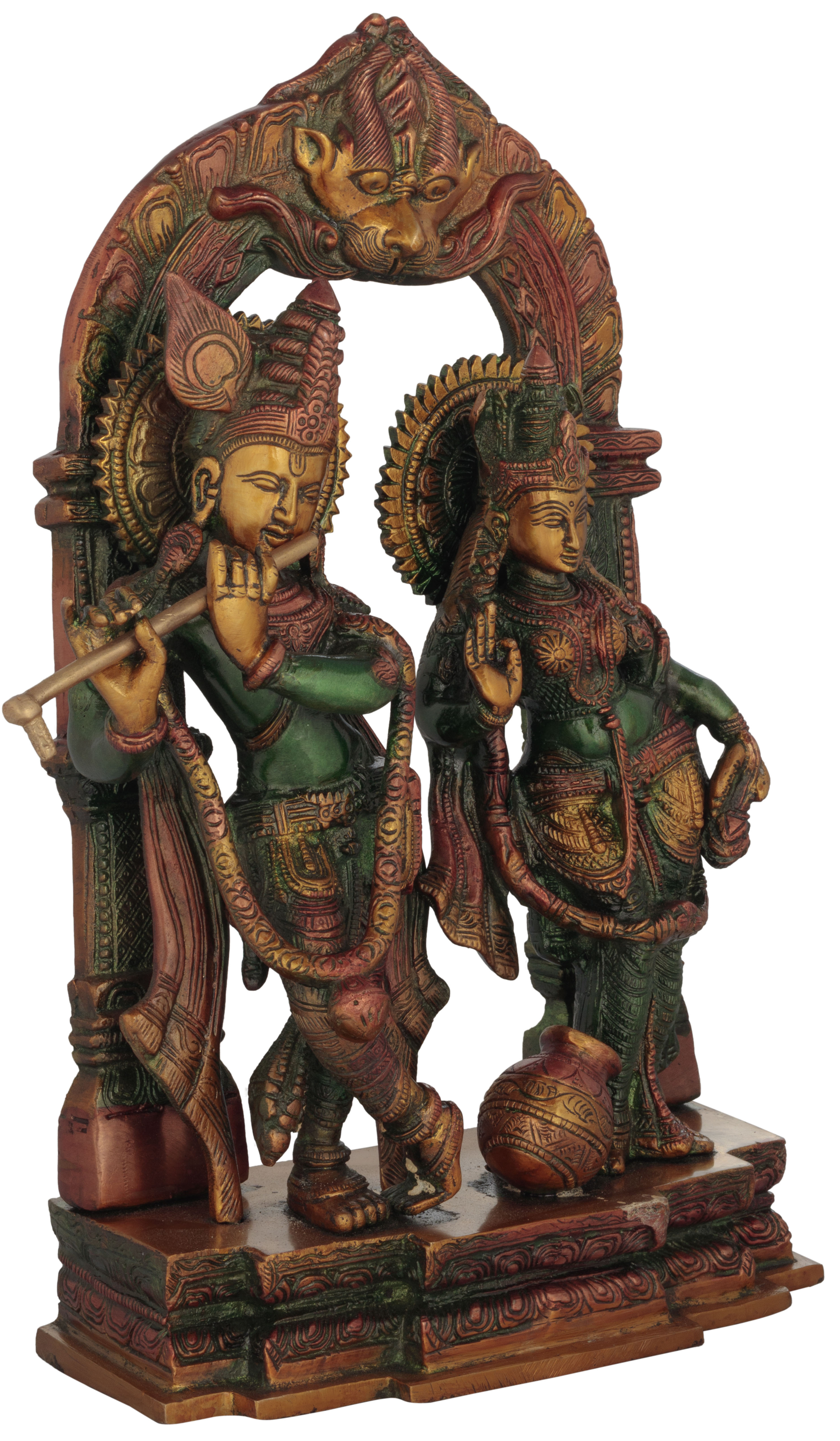 This exquisite brass sculpture captures the essence of one of the most beloved divine pairs in Hindu mythology: Radha and Krishna. Standing tall and resplendent, the figures are rendered with exceptional detail, reflecting the artistry and devotion poured into its creation. Crafted from high-quality brass, this piece is not merely an artifact but a testament to the rich cultural heritage of India, where such deities are venerated with profound love and reverence. Lord Krishna, the divine flautist, is depicted in his iconic pose, his fingers delicately poised on his flute, ready to conjure melodies that enchanted the Gopis and the very cosmos. The peacock feather adorning his crown is a signature emblem, symbolizing beauty, royalty, and divine awareness. His serene expression and graceful stance evoke a sense of divine playfulness and infinite charm. Beside him stands Radha, the eternal beloved, her gaze fixed upon Krishna, her posture radiating devotion and adoration. Her divine presence complements Krishna's, forming a harmonious tableau of spiritual love. The presence of the milk pot, or 'dahi handi,' at their feet, hints at Krishna's childhood escapades of butter theft and his divine love for milk and dairy products, a symbol of his relatable and endearing nature as the 'Makhan Chor.' ––––––––––