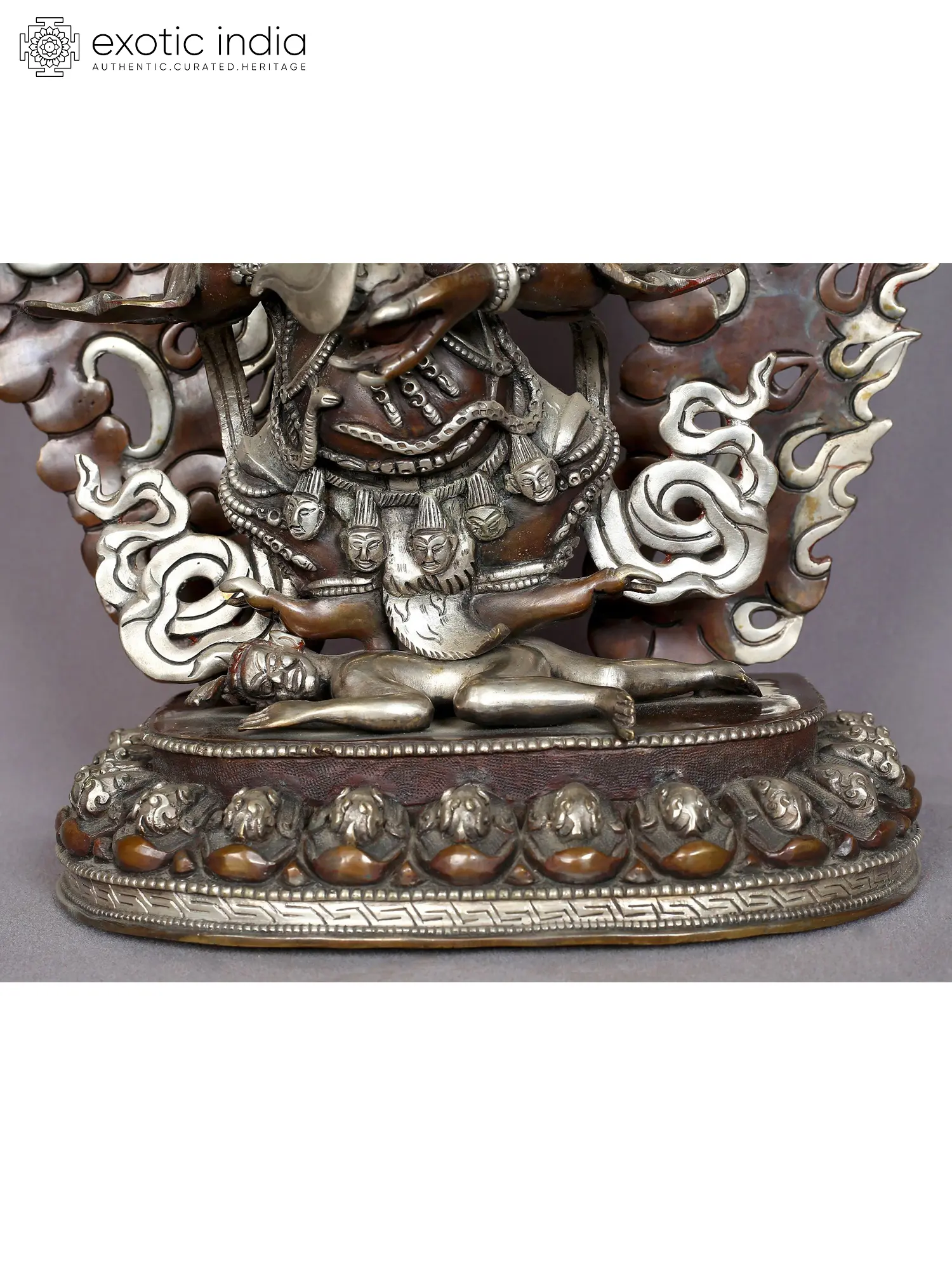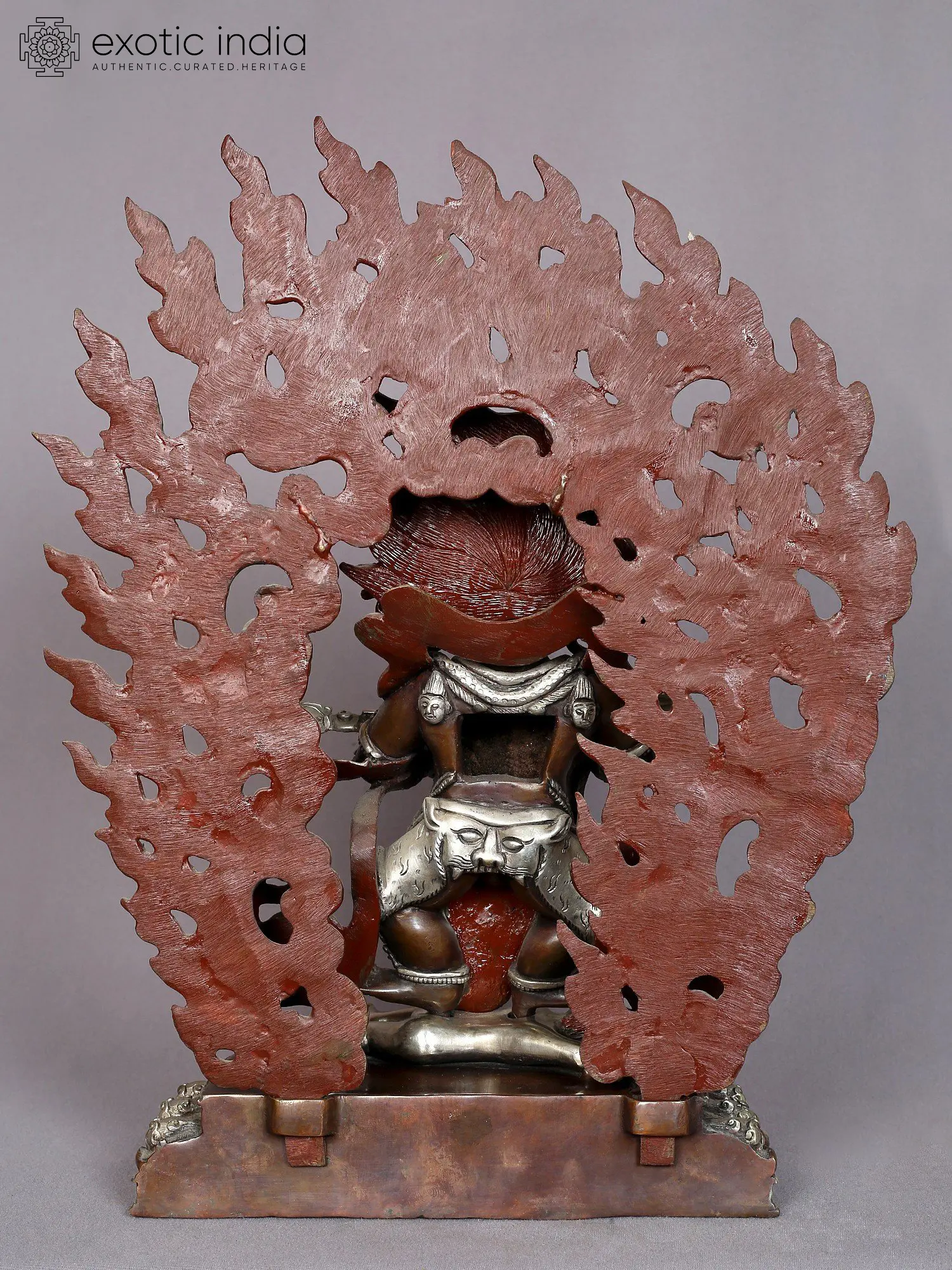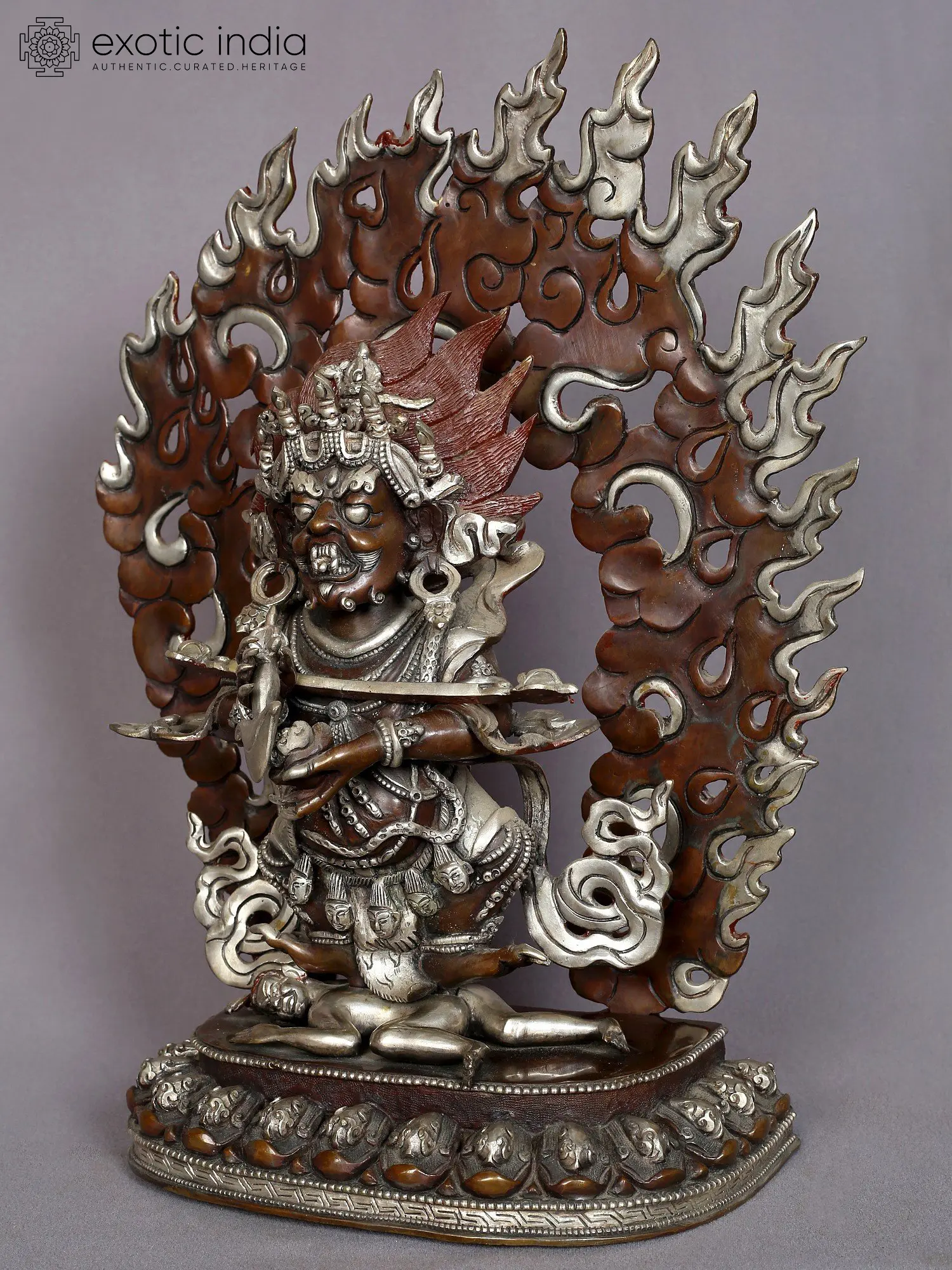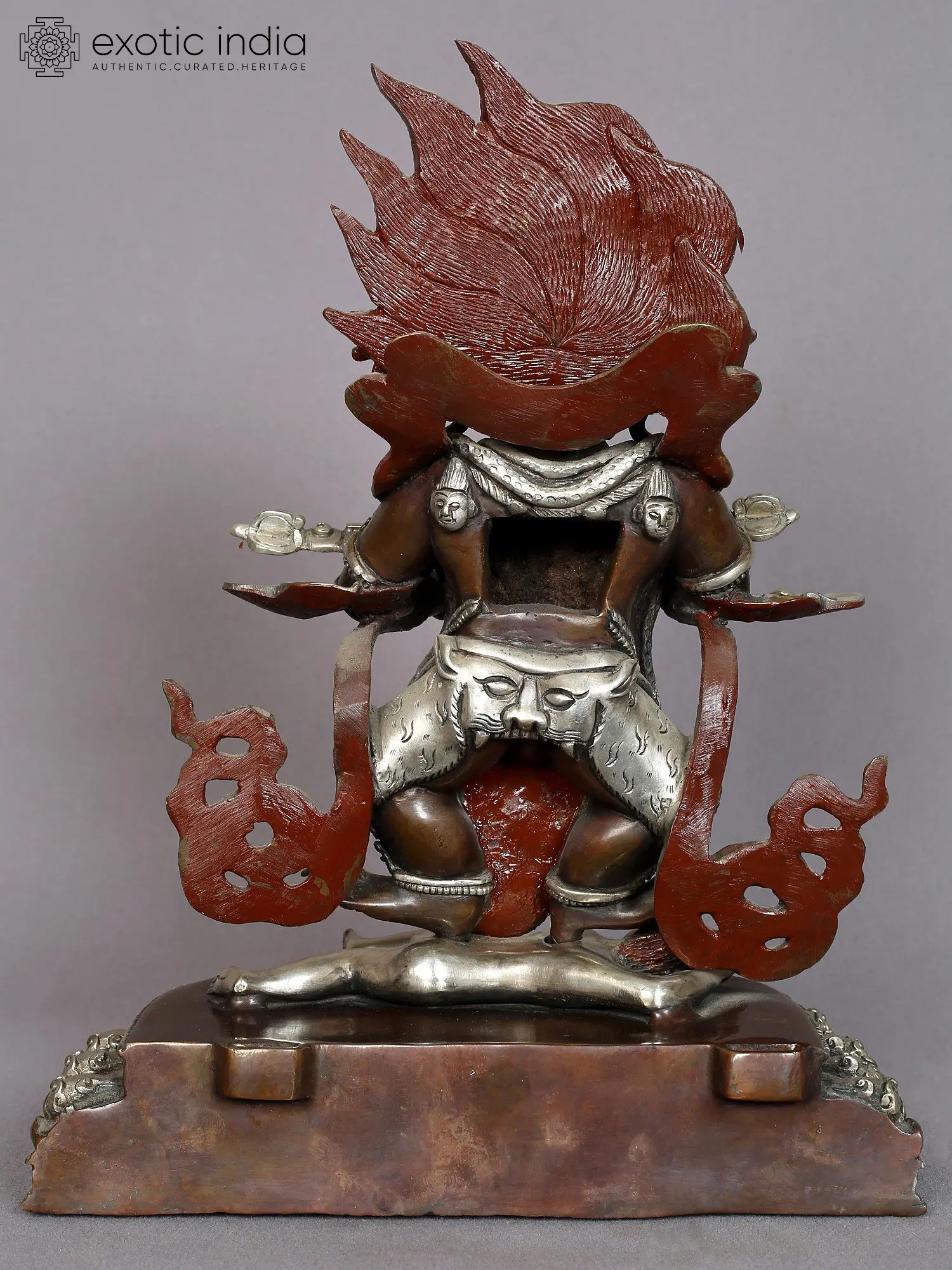 He represents the transformation of negative emotions—such as ignorance, attachment, aversion, pride, and jealousy—into wisdom, emphasizing his role in helping practitioners overcome obstacles and attain enlightenment. He is positioned upon a lotus base amid the flames of immaculate consciousness. These flames symbolize the profound potency of wisdom and the process of purifying and eliminating impurities.