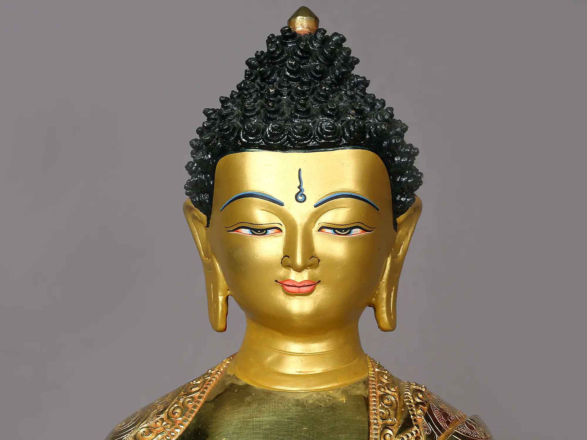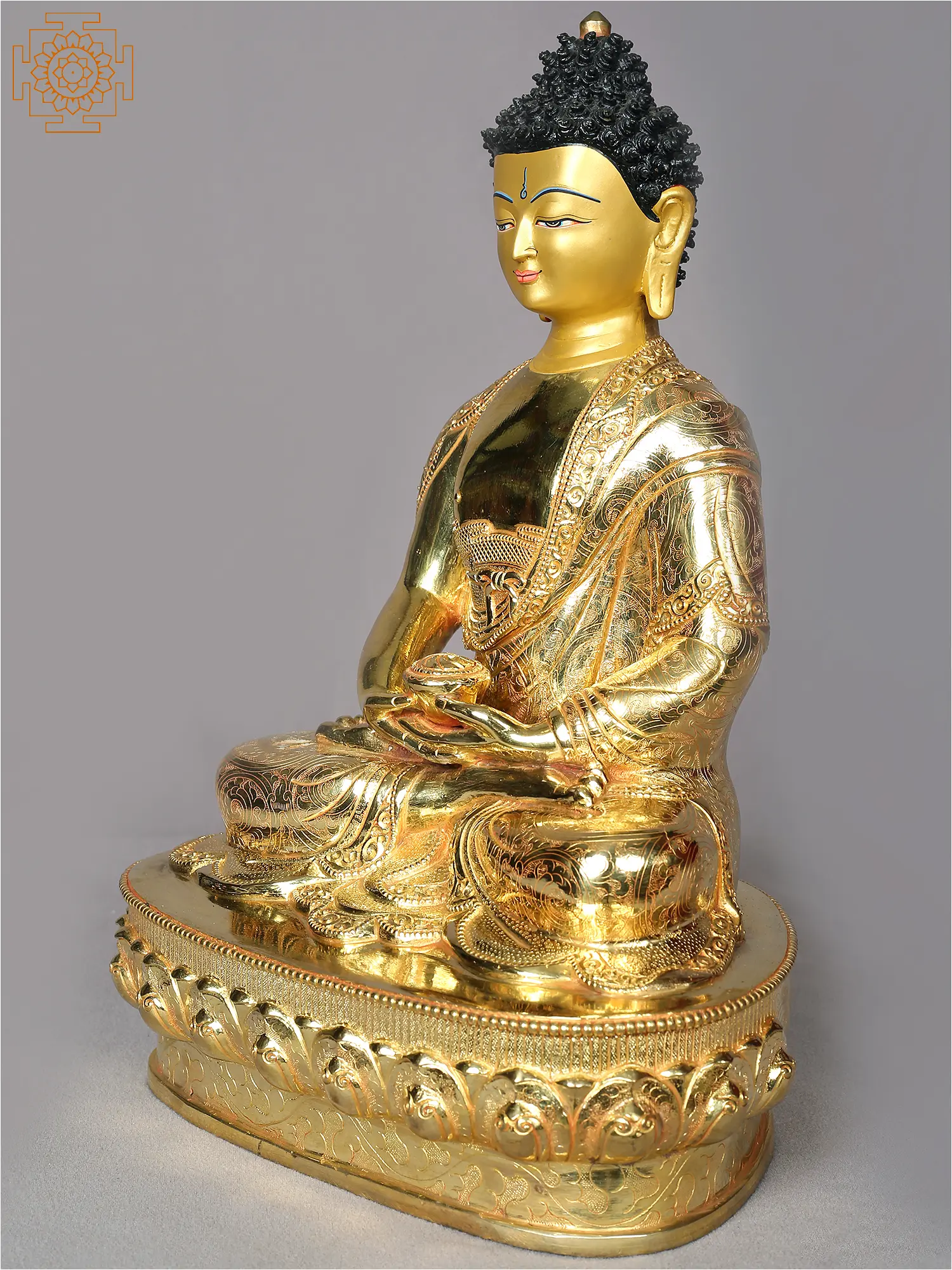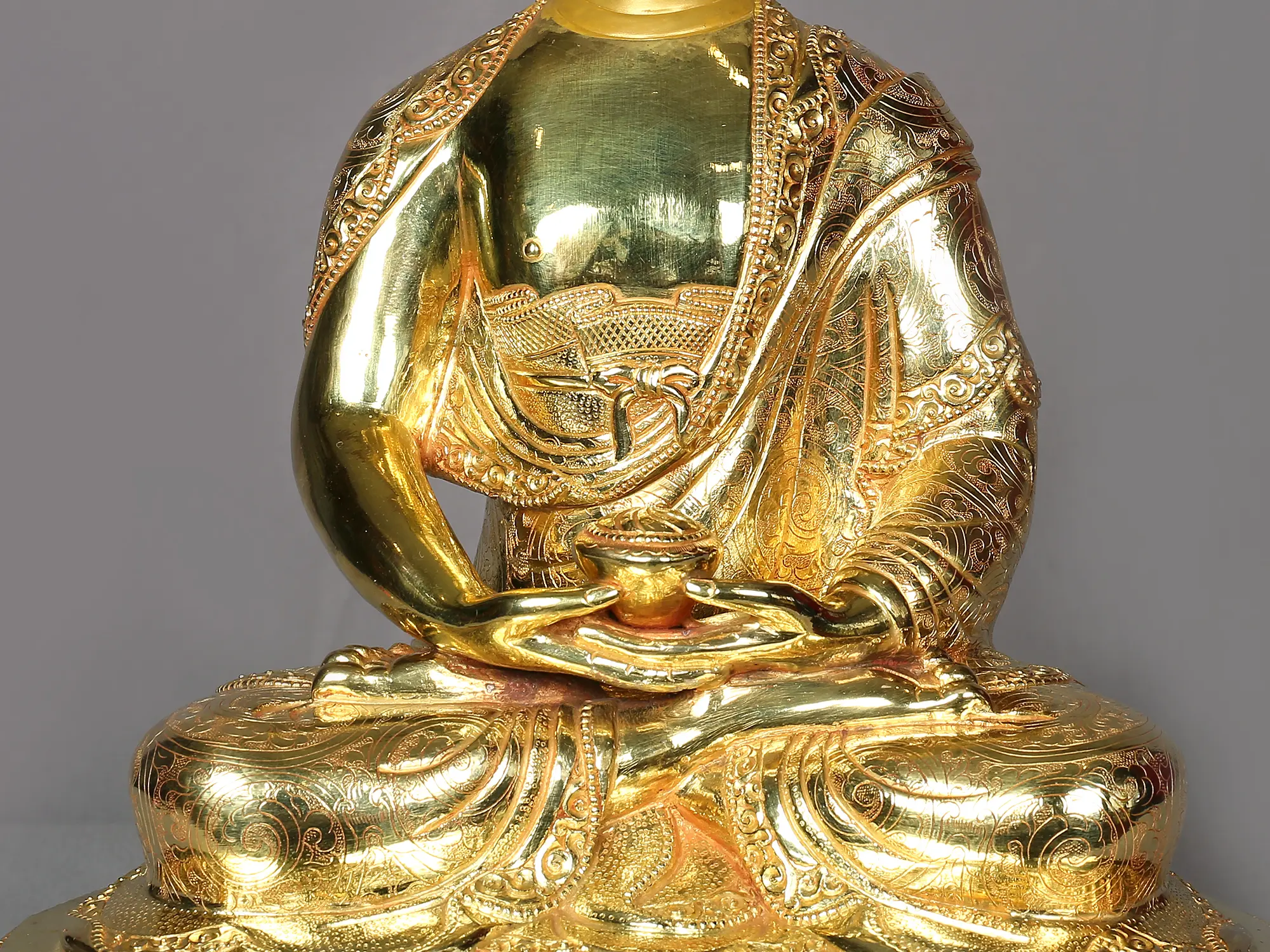 This exquisite statue captures the serene presence of Amitabha Buddha, the Buddha of Infinite Light and Life. Crafted from copper and meticulously gilded with pure gold, this piece radiates a profound sense of peace and spiritual enlightenment. Amitabha is a central figure in Mahayana Buddhism, revered as the celestial Buddha who presides over the Western Pure Land, a paradise where sentient beings can attain enlightenment with ease. It is said that those who call upon Amitabha with sincere devotion will be reborn in his Pure Land, free from suffering and the cycles of rebirth.