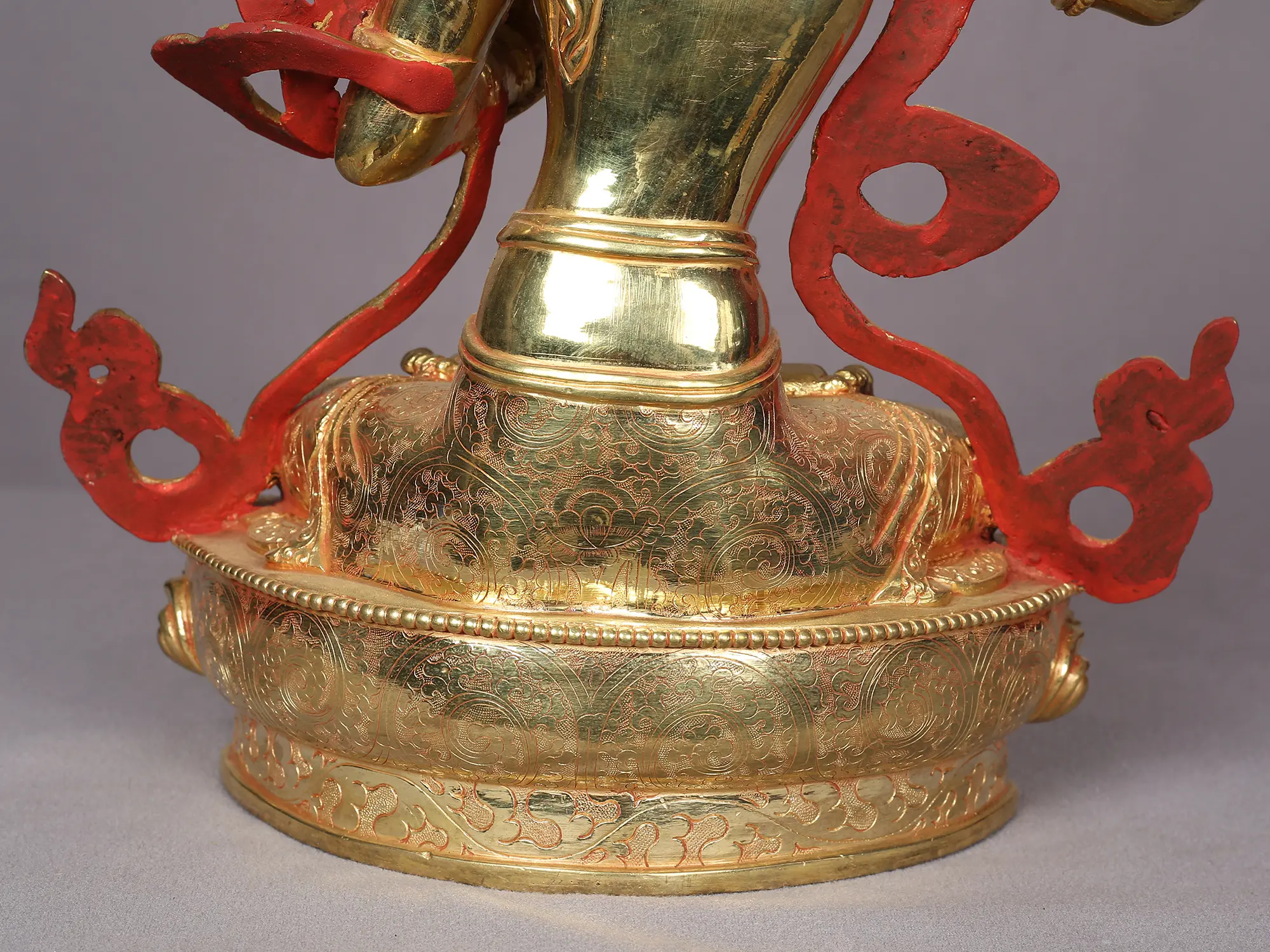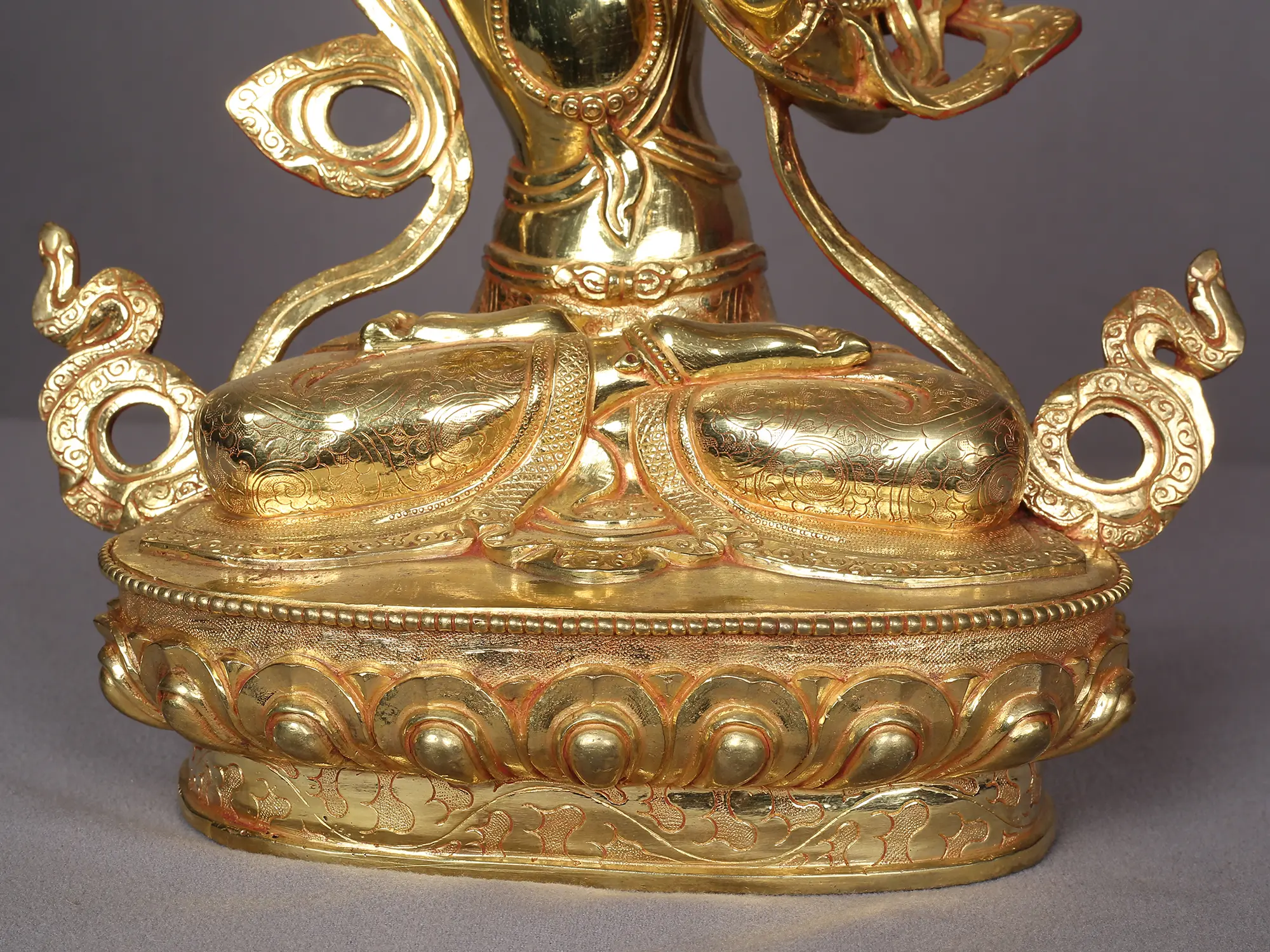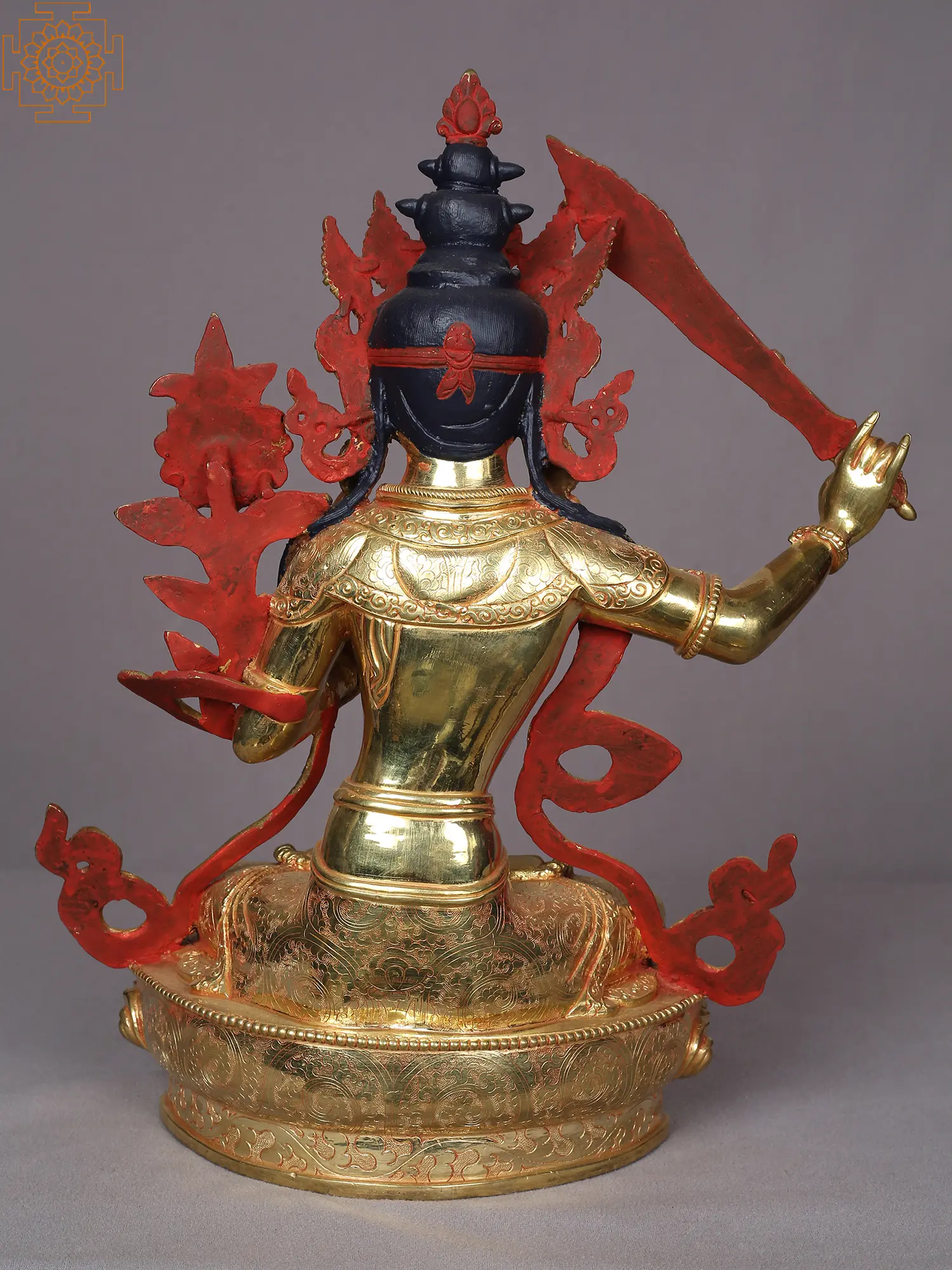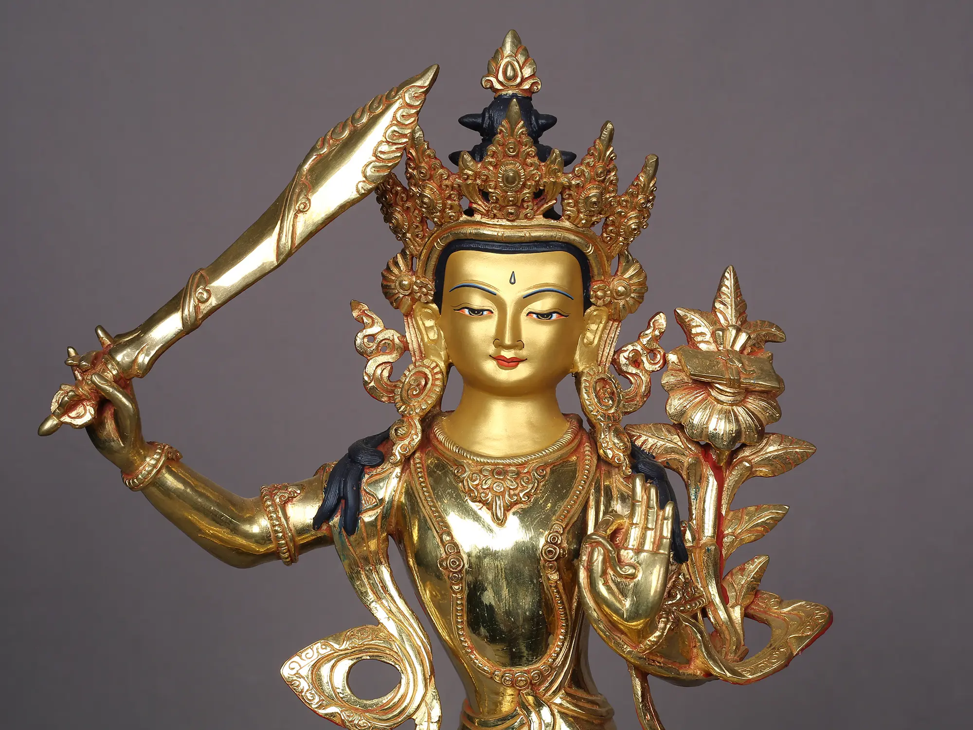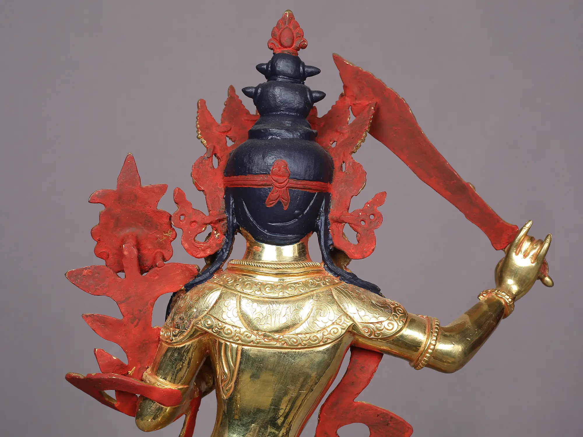 This Nepalese statue of the Bodhisattva Manjushri creates a lyrical balance between his goodness and his power, with a celestial grin on his face and a fiery sword ready to slay evil and darkness. Manjushri has a plump face, incredibly long eyes, and a rivetting smile on her mouth. His magnificent jewellery draws attention to the youthful form's flexibility, which is enhanced by the silken scarf's captivating waves. The statue's divine finish is achieved by the Nepalese master sculptors using priceless turquoise, lapis lazuli, and coral.
