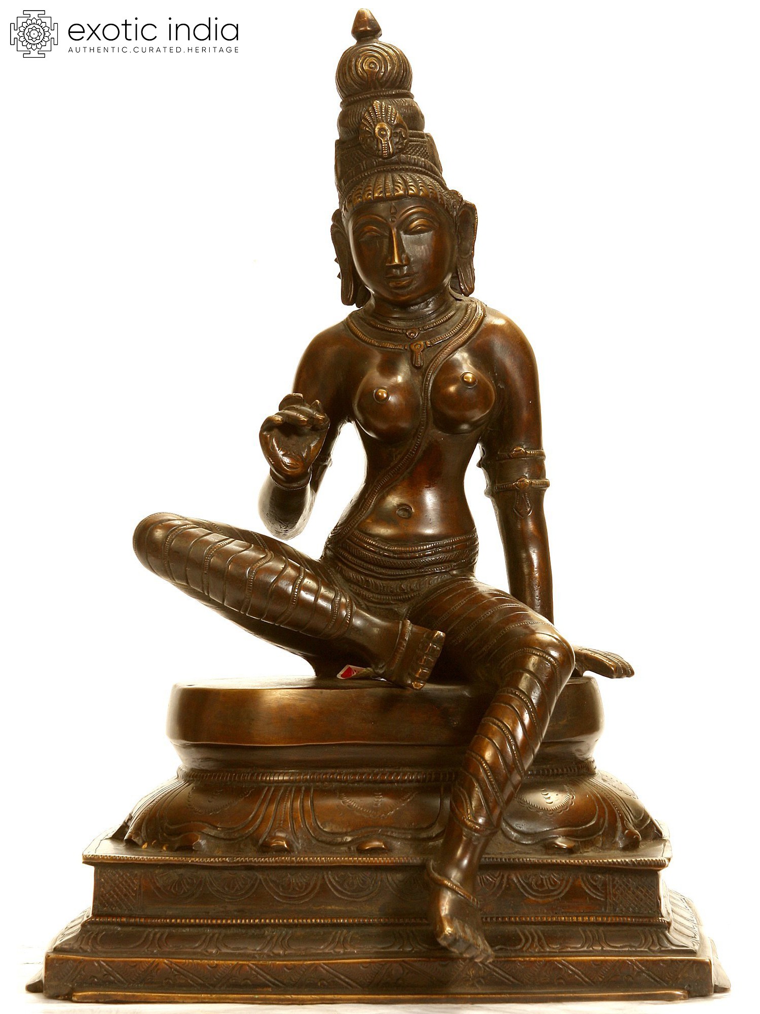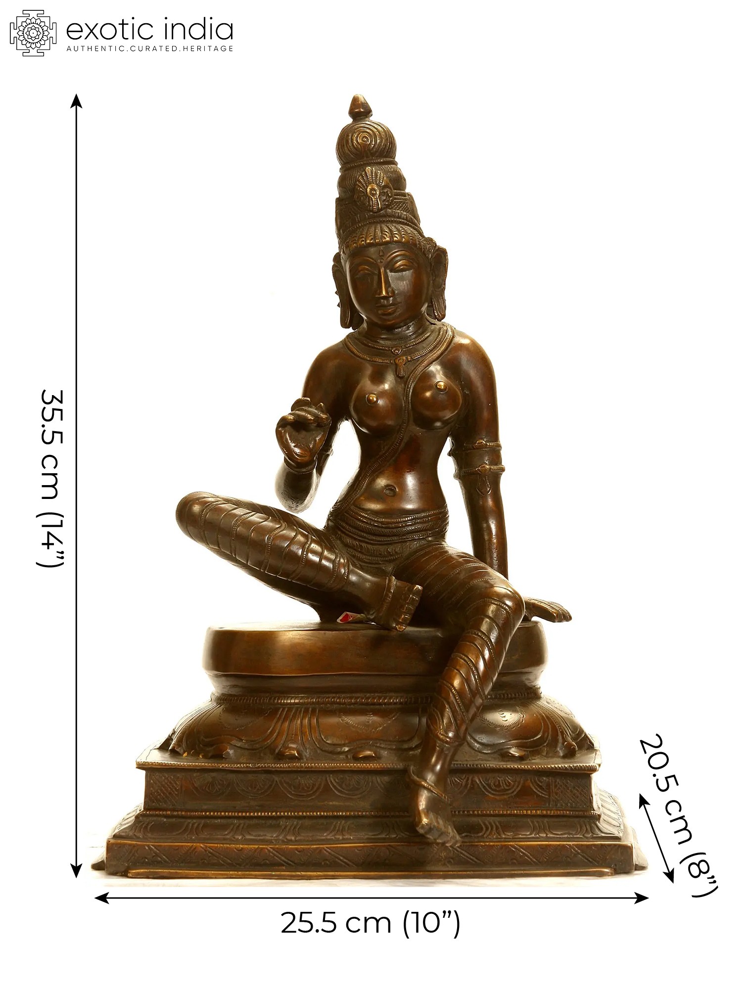 In this brass Uma statue, the goddess is placed on an upturned lotus pedestal which is kept on another square platform. With one leg folded and another dangling, the goddess is in the posture of royal ease, known as Lalitasana.