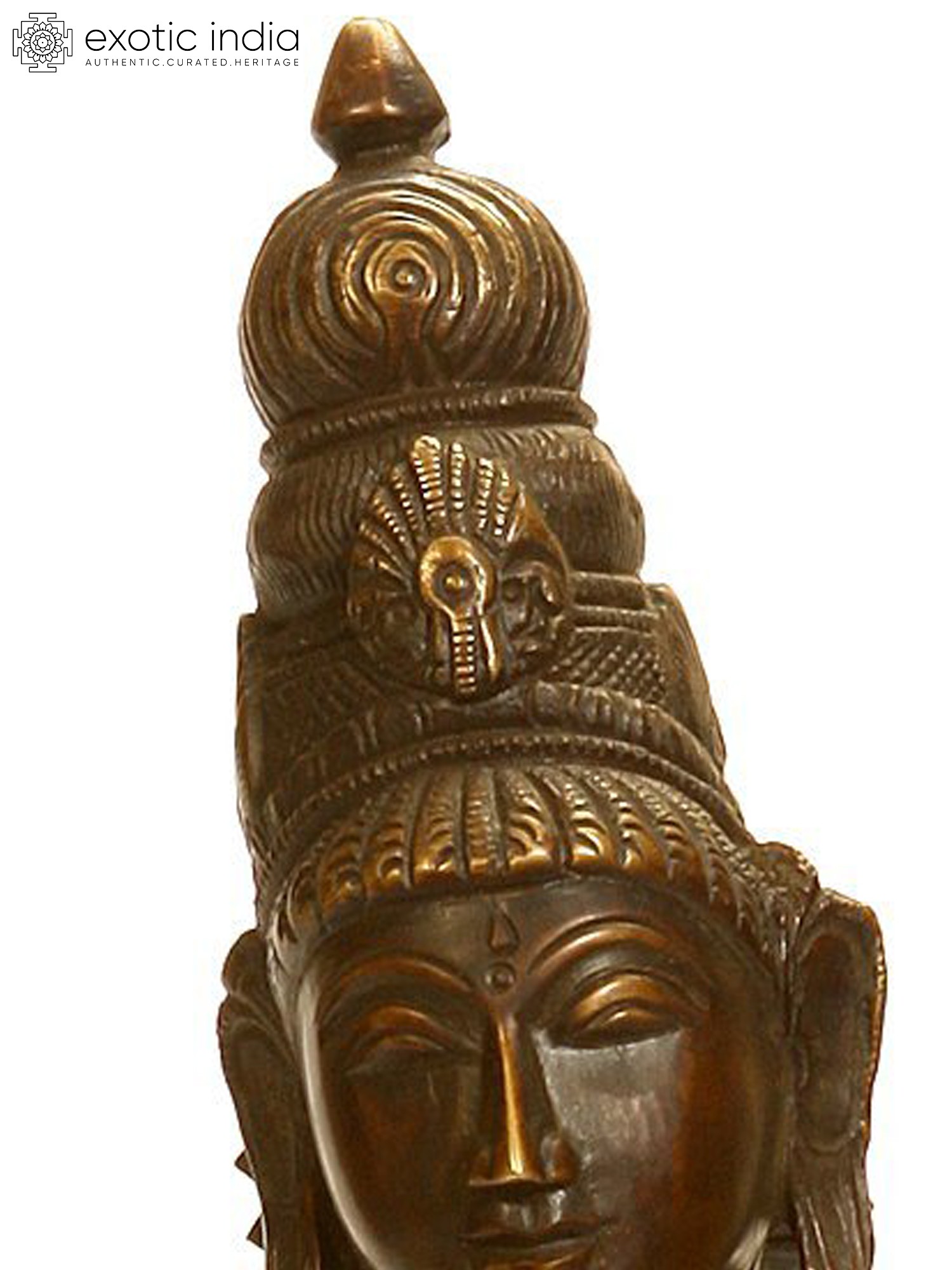 Her luxurious tresses are tied in a high raising knot, making a Jata-mukuta (crown formed out of locks of hair) with a Shirachakra (circular halo-like hair ornament) which gives her presence an imposing and deific feel.