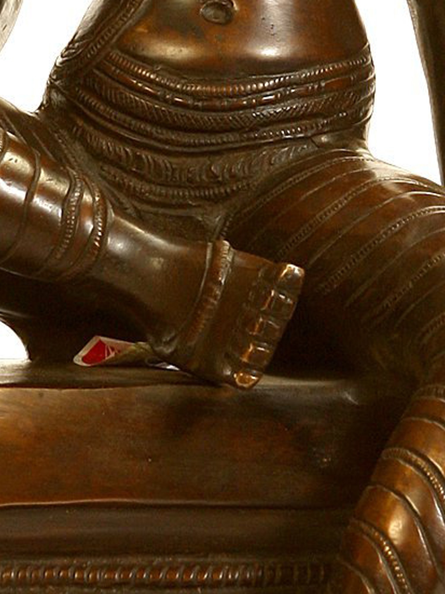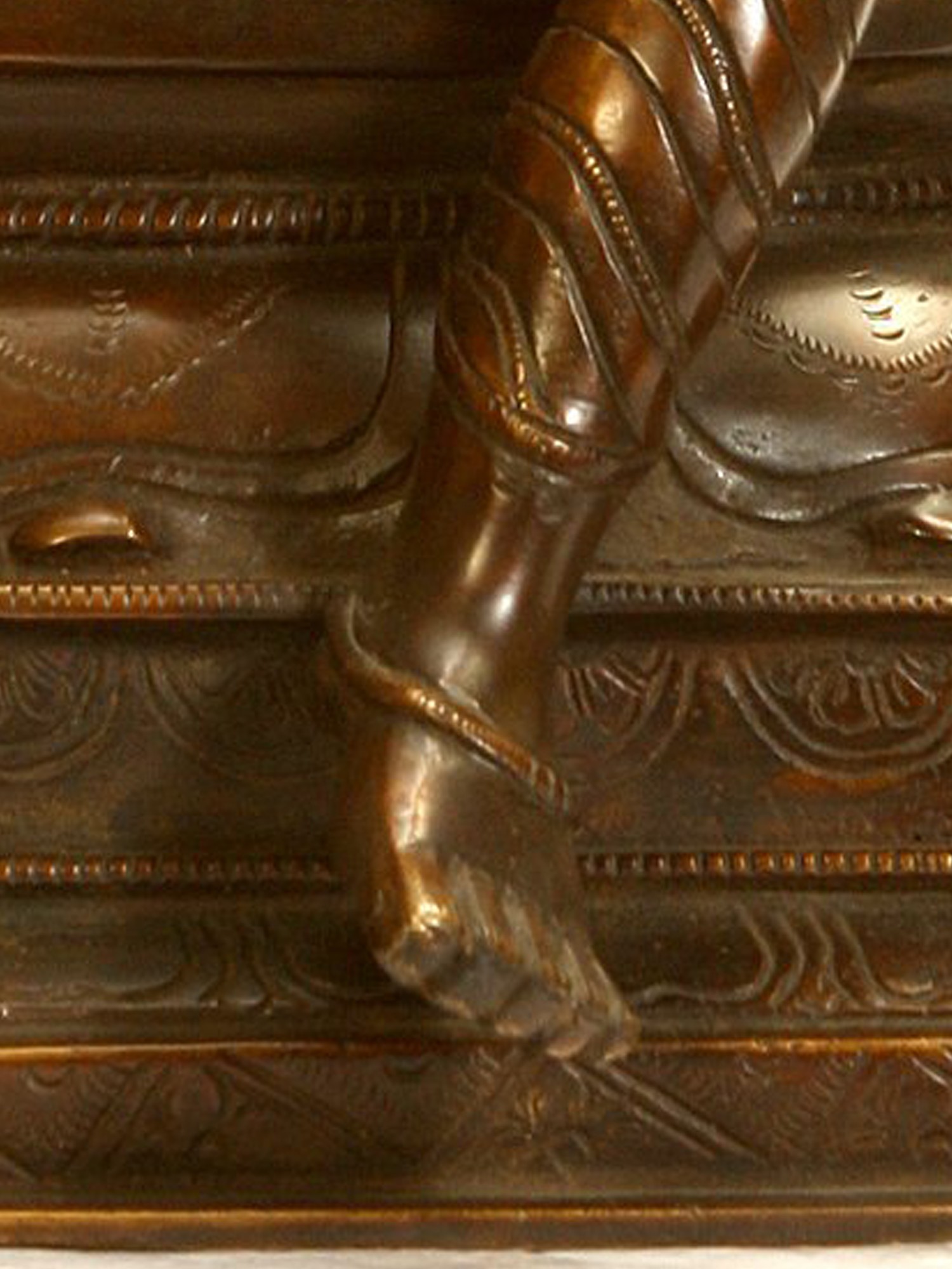 Goddess Uma’s divine form is sparsely decorated with fine ornaments and a Yajnopavita (sacred thread), an artistic trope used to keep the attention on the magnificence of Bhogashakti which needs no embellishments. The use of different patterns and carving on the legs of Uma-Parvati reveals her delicate and patterned dhoti (lower body garment) that clings to her legs.
