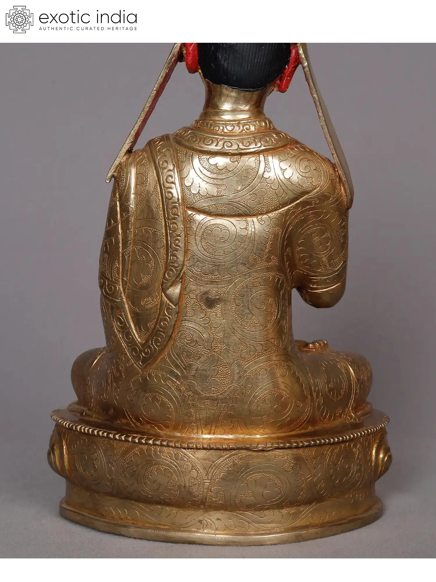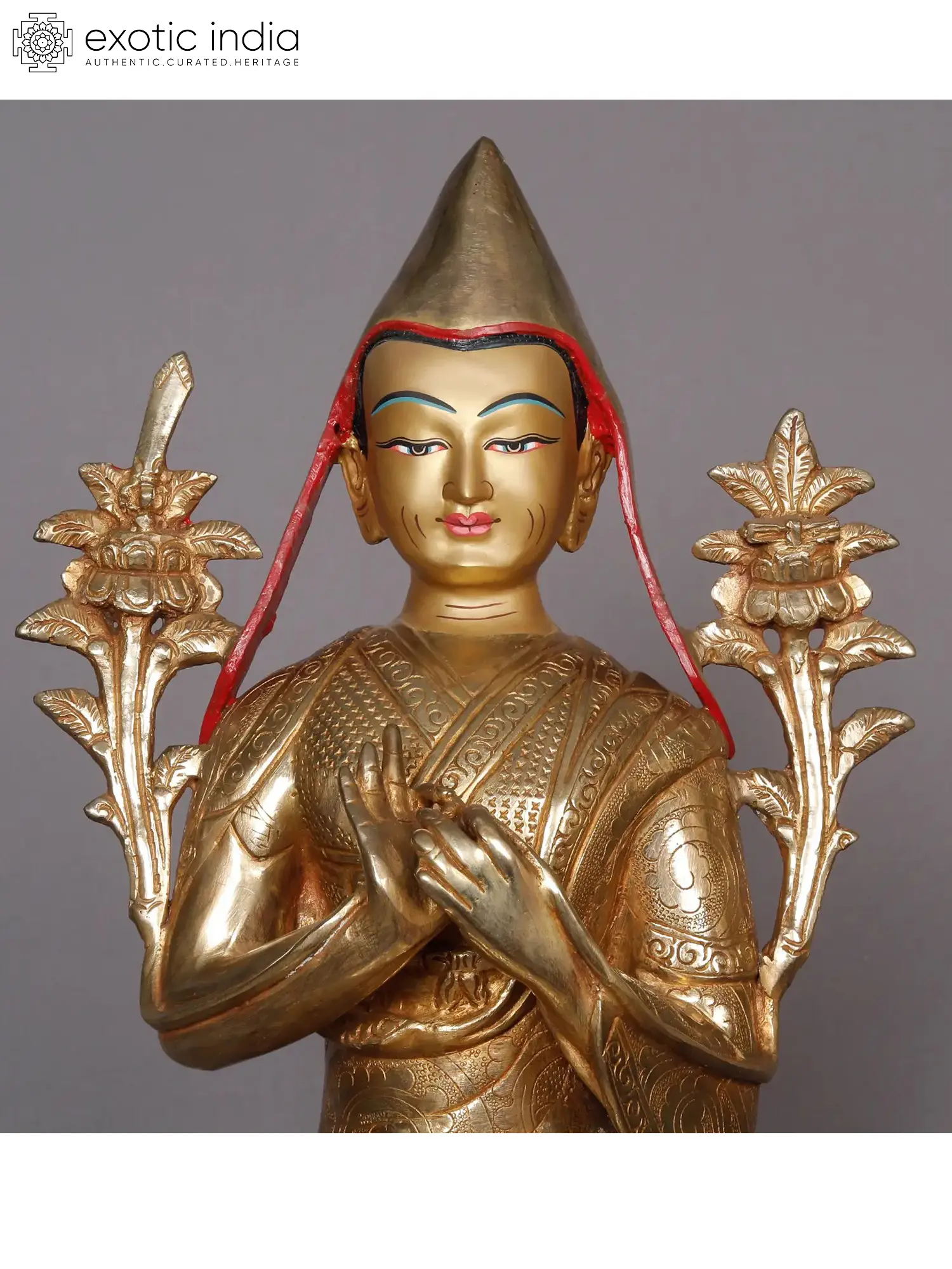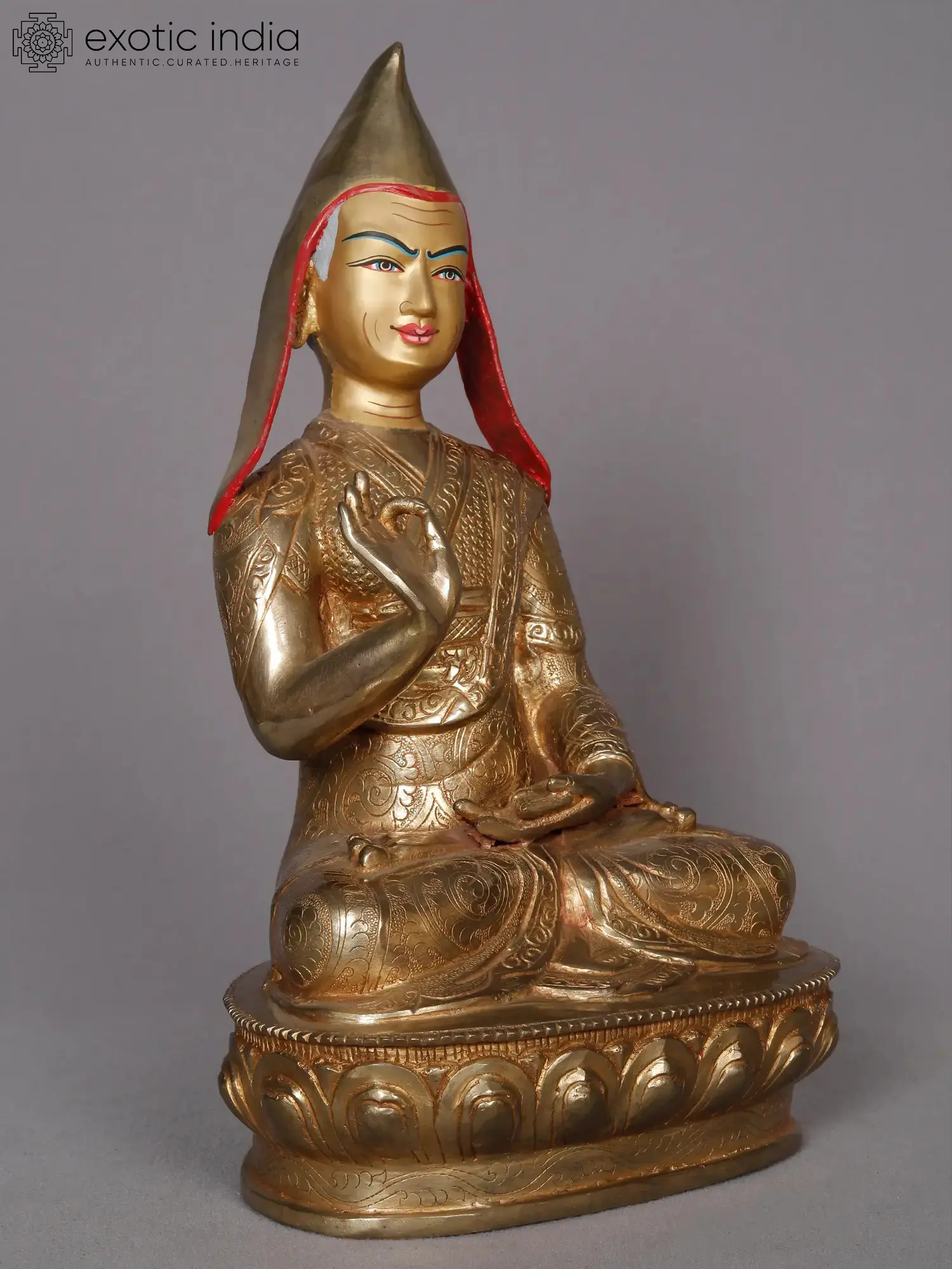 Tsongkhapa in Buddhist culture is the establisher of the Gelugpa sect, a prominent Vajrayana order to which belong the Dalai Lamas. The glistening golden cap of Tsongkhapa in these Nepalese gilded copper statues is symbolic of the order he founded, known as the Yellow Hats. The three statues from Nepal present the teacher in varied states of enlightened existence. One depicts him with the gesture of turning the wheel of Dhamma, while the other two show him teaching the Dhamma, with the Vitarka Mudra and a book.