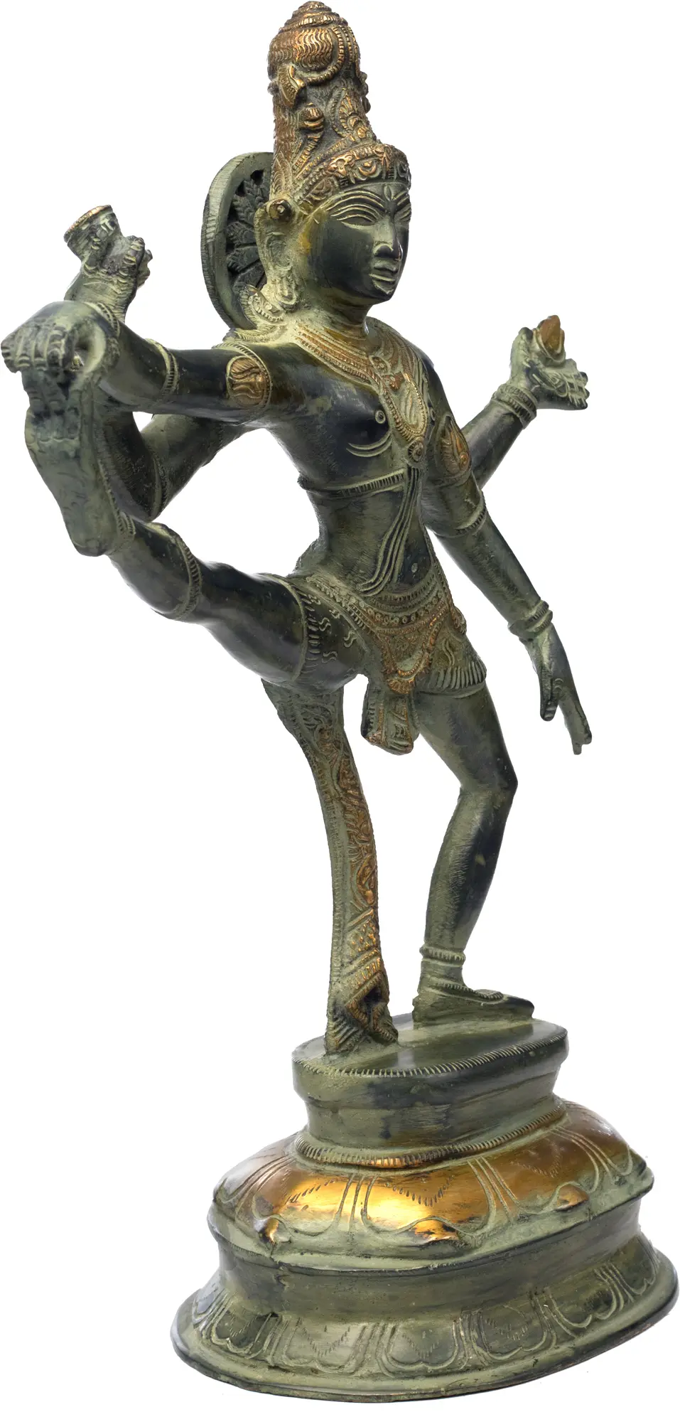 The 14 x 4.5 x 10-inch dimensions of this statue make it a striking centerpiece for your home or office. Whether placed on a mantle, shelf, or altar, it will command attention and inspire contemplation. The deep, rich bronze, highlighted by gilded accents, adds an element of sophisticated elegance to any setting. Its presence invokes a sense of peace and serenity, transforming your space into a sanctuary for reflection and meditation. Beyond its aesthetic appeal, this statue provides a tangible link to ancient spiritual traditions, serving as a constant reminder of the cyclical nature of life and the power of divine energy. It's a perfect gift for those seeking spiritual enrichment, those fascinated by Indian art and culture, or simply those who appreciate truly beautiful and handcrafted objects.