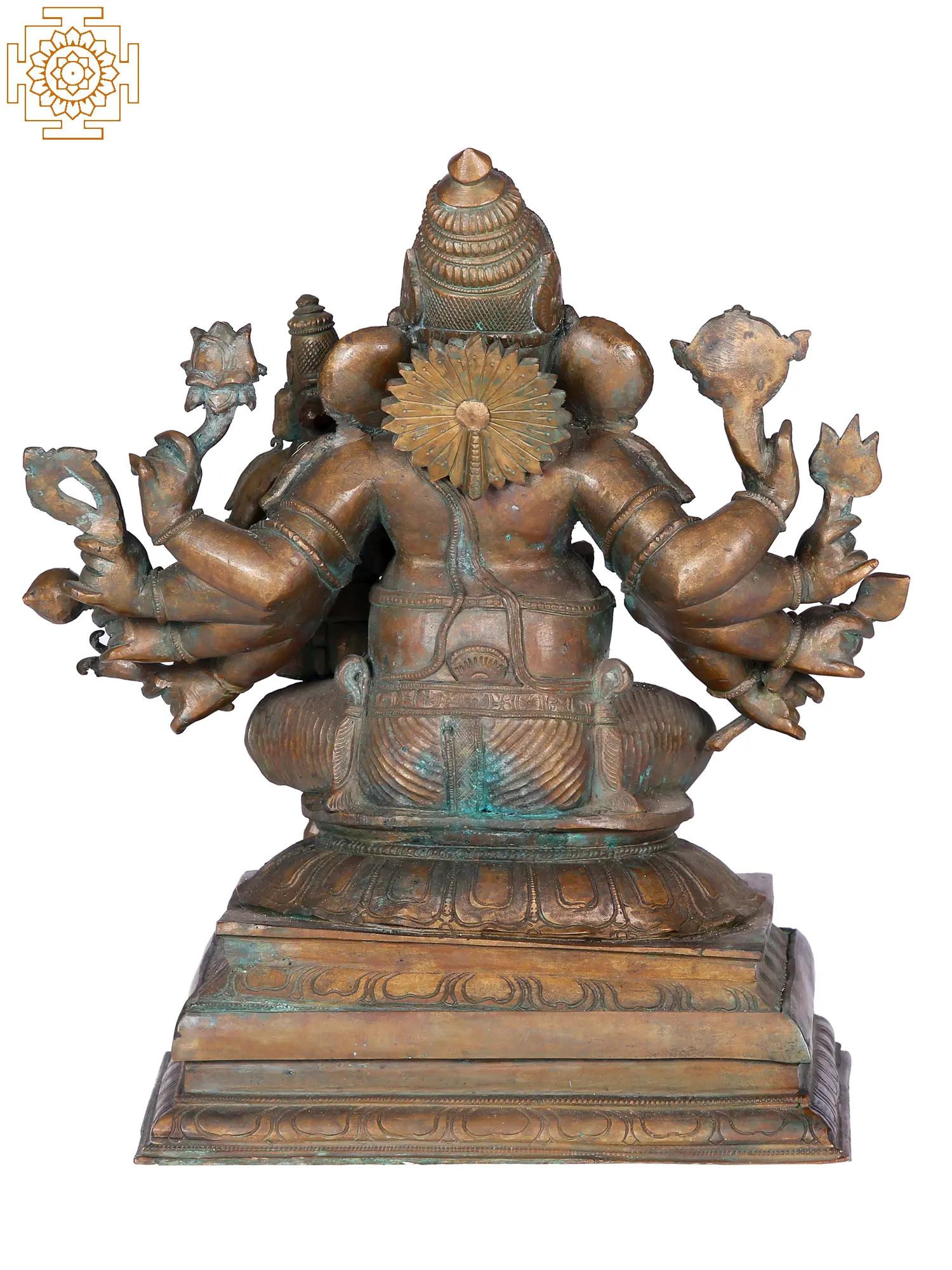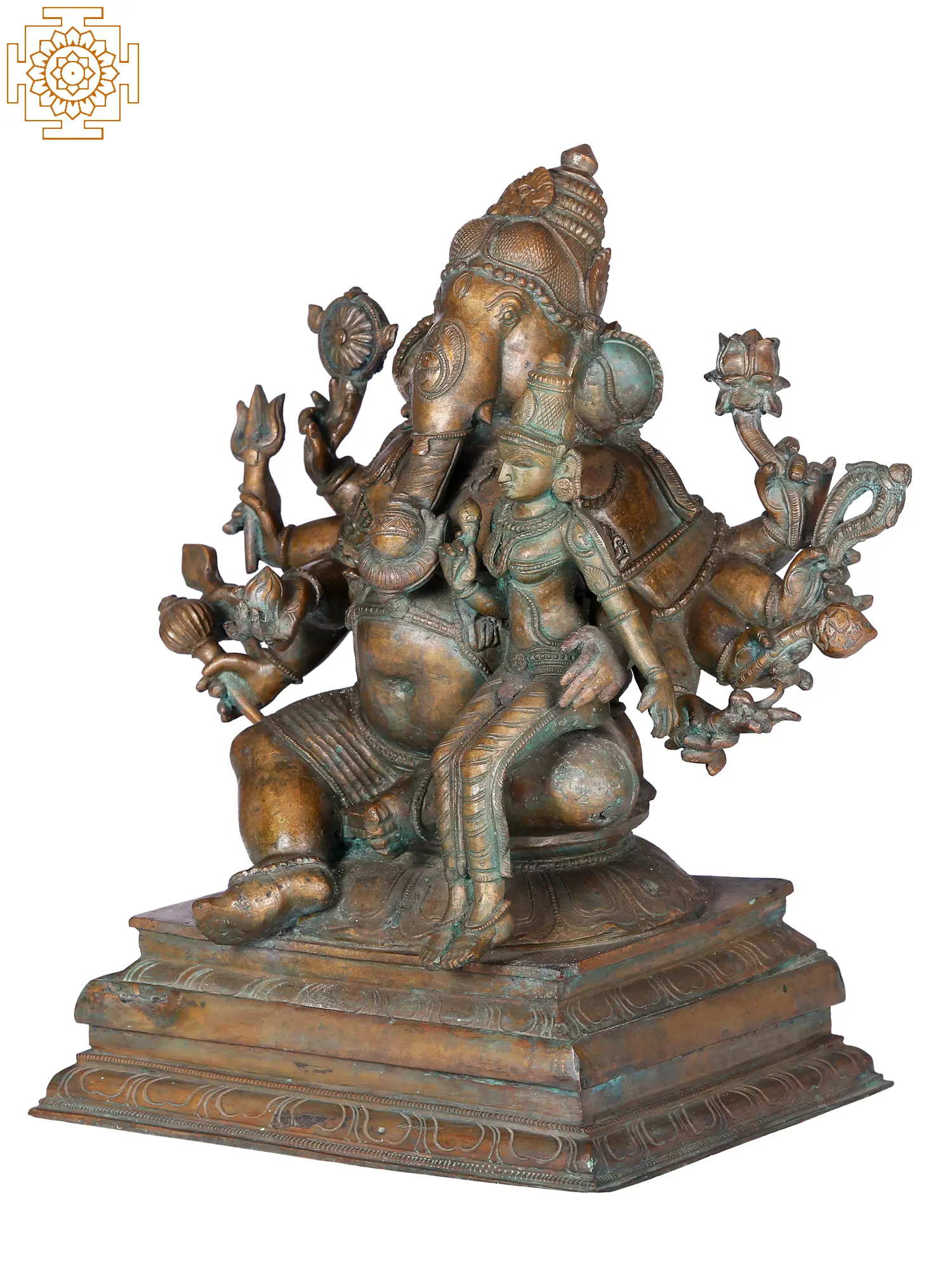 This magnificent bronze sculpture embodies the revered form of Sri Vallabha Ganapati, a depiction of Lord Ganesha as the beloved consort, representing his divine union and benevolent power. Crafted using the ancient Madhuchista Vidhana (lost-wax) technique, this statue is a testament to the enduring artistry and spiritual depth of Indian bronzework. The Panchaloha, a sacred alloy of five metals, lends a timeless patina and an aura of profound sanctity to this exquisite piece. Standing at fourteen inches tall, it is a commanding yet harmonious representation of the Remover of Obstacles and the bestower of wisdom and prosperity.
