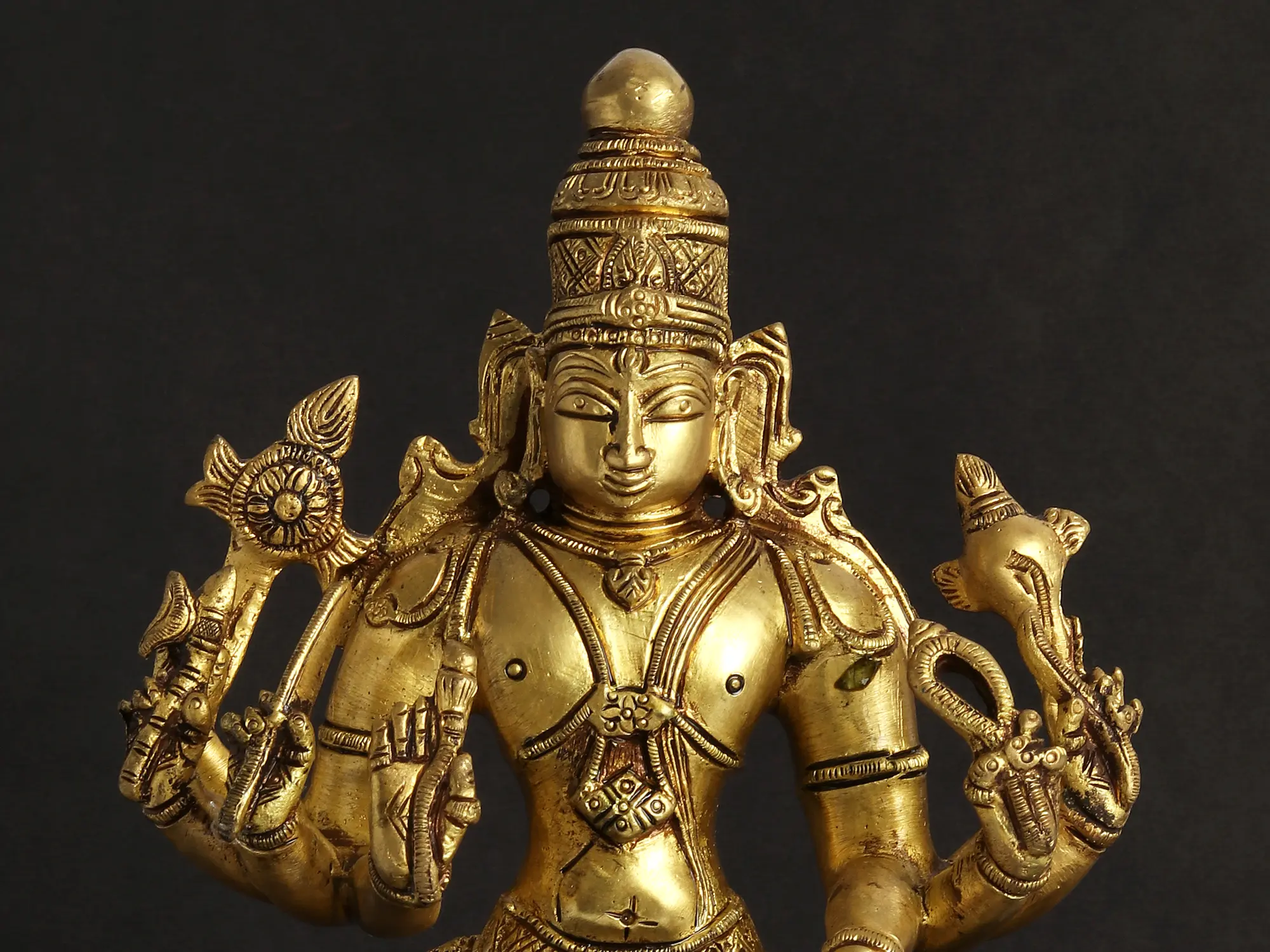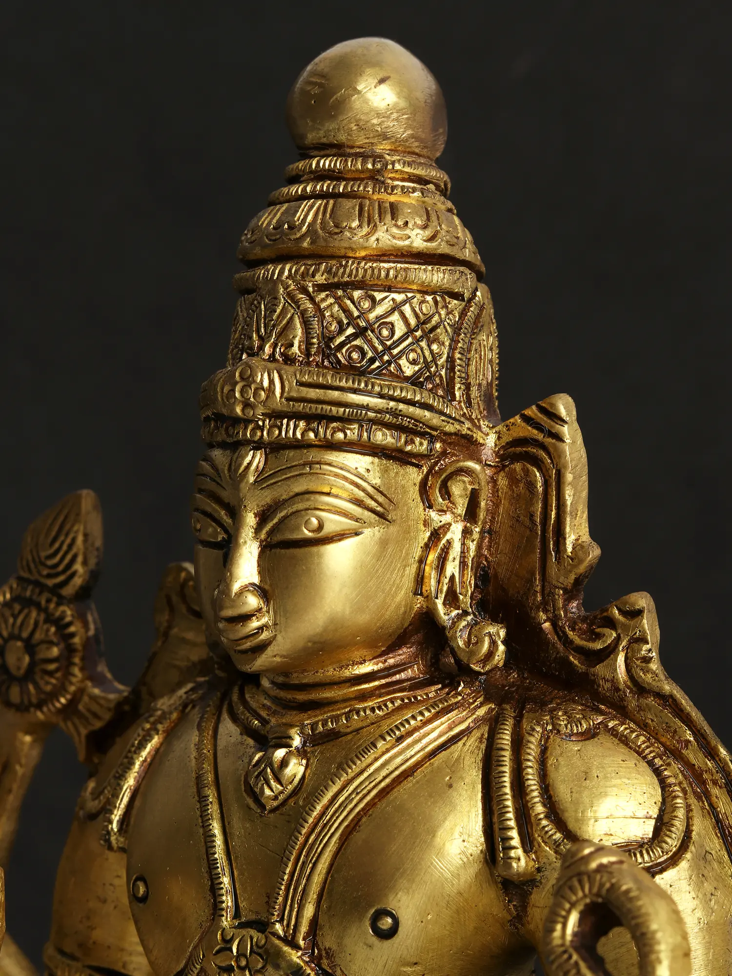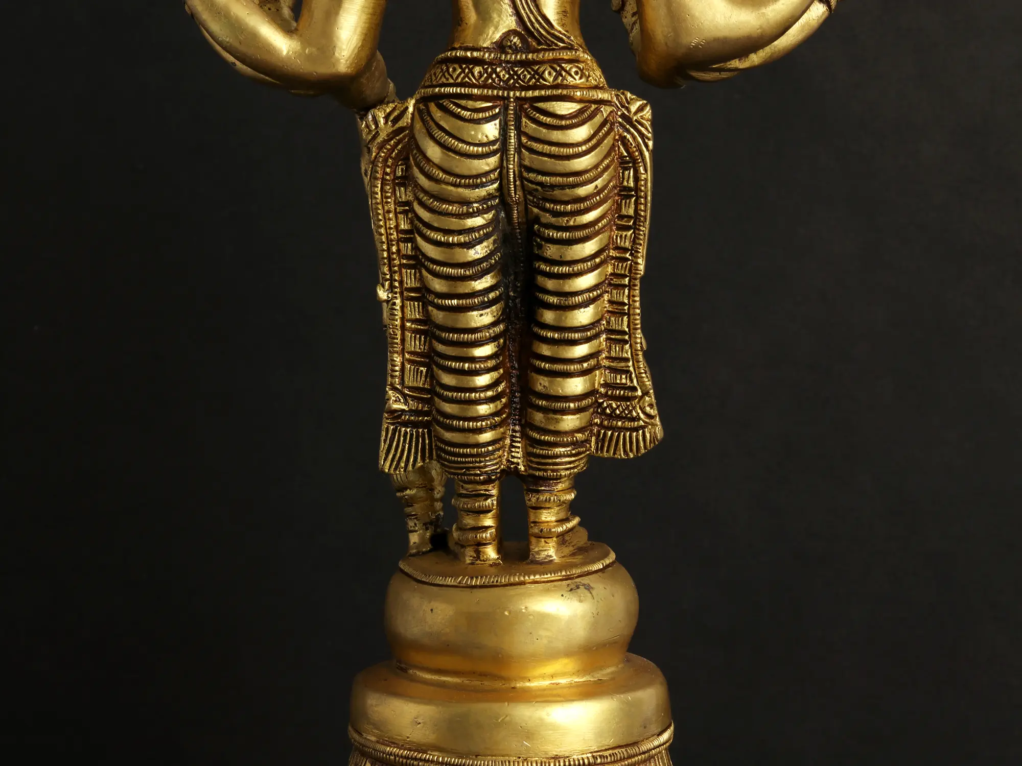 A rare, eight-armed roopa of Sri Vishnu is delineated in this exquisite brass statue, which is worshipped in the tradition of Tamil Vaishnava or Alvars as Ashtabhuja Perumal or Attabhuyakaram. This form of Vishnu is revered in the sanctum of the Perumal Temple at Kanchipuram and is associated with a valorous emanation of Vishnu, as a heavenly savior. The icon is placed on an imposing two-level pedestal, beautifully embellished, with Vishnu standing in the firm Sampadasthanaka posture, holding his eight mighty weapons in his eight arms. Smiling gently and infusing a divine aura, Ashtabhuja Perumal assures the devotee of his omnipresent benevolence.