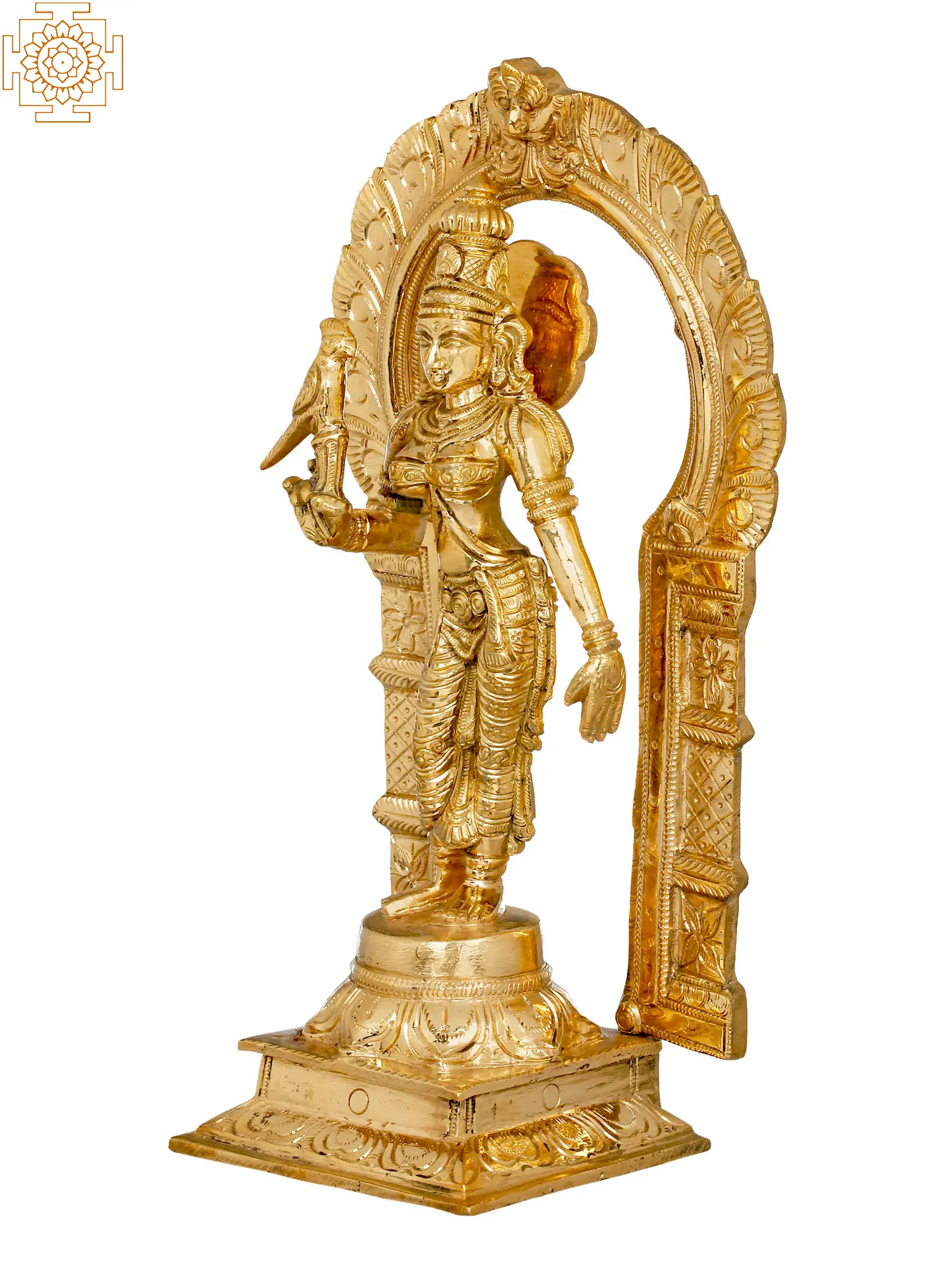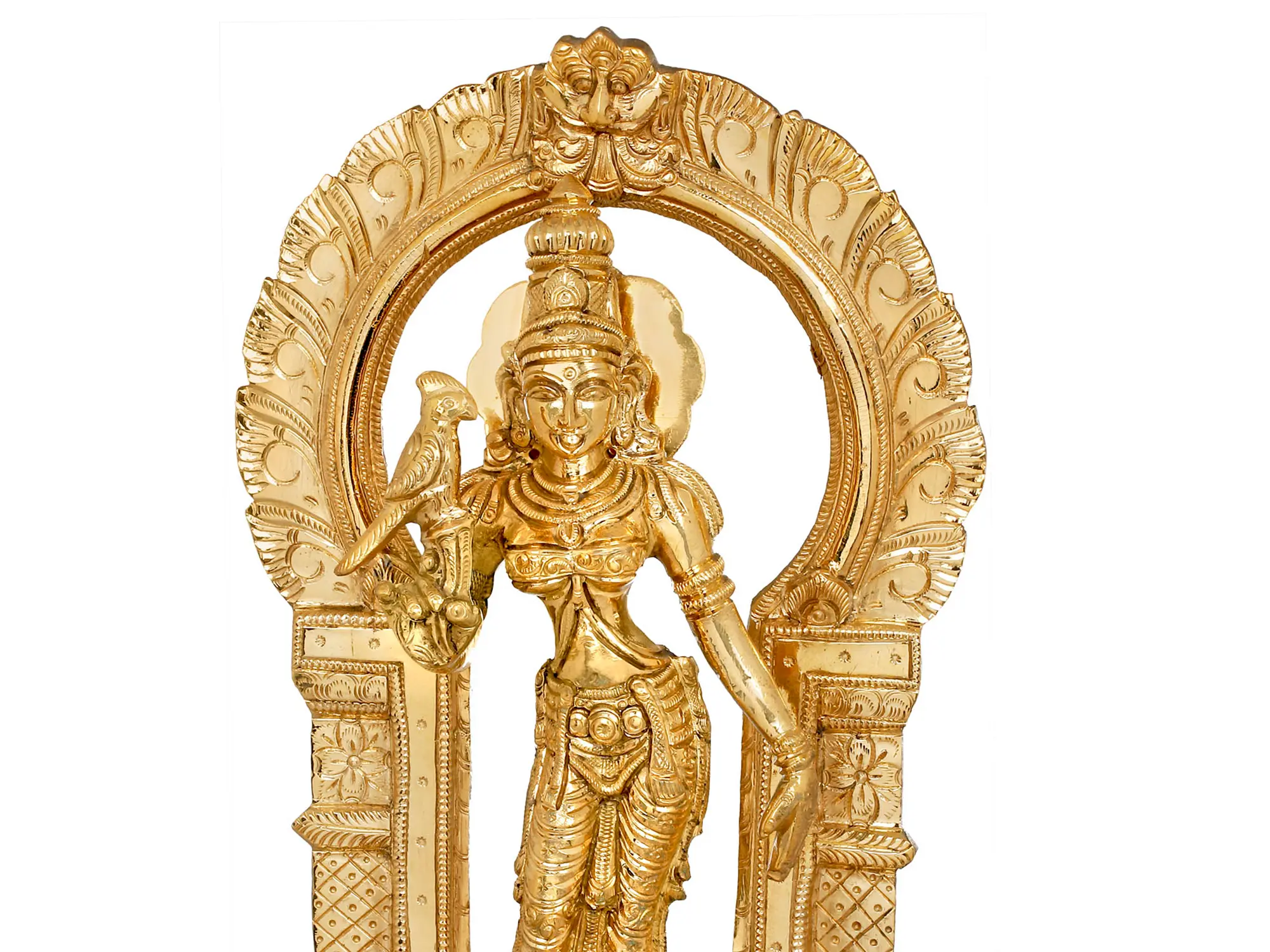 The artistry of this brass statue is truly remarkable. The sculptor has captured the divine essence of Meenakshi with incredible precision, from the serene expression on her face to the flowing drapery of her garments. The ornate arched prabhavali, or aureole, behind her, is richly decorated with symbolic motifs, framing the goddess in a celestial halo. The presence of a parrot in her hand is a significant detail, symbolizing communication, wisdom, and the ability to discern truth. This statue is not merely an object of worship but a cultural artifact, carrying within it centuries of devotion, storytelling, and artistic evolution from India. Each curve and detail has been shaped with generations of skill and dedication, ensuring an heirloom quality piece.