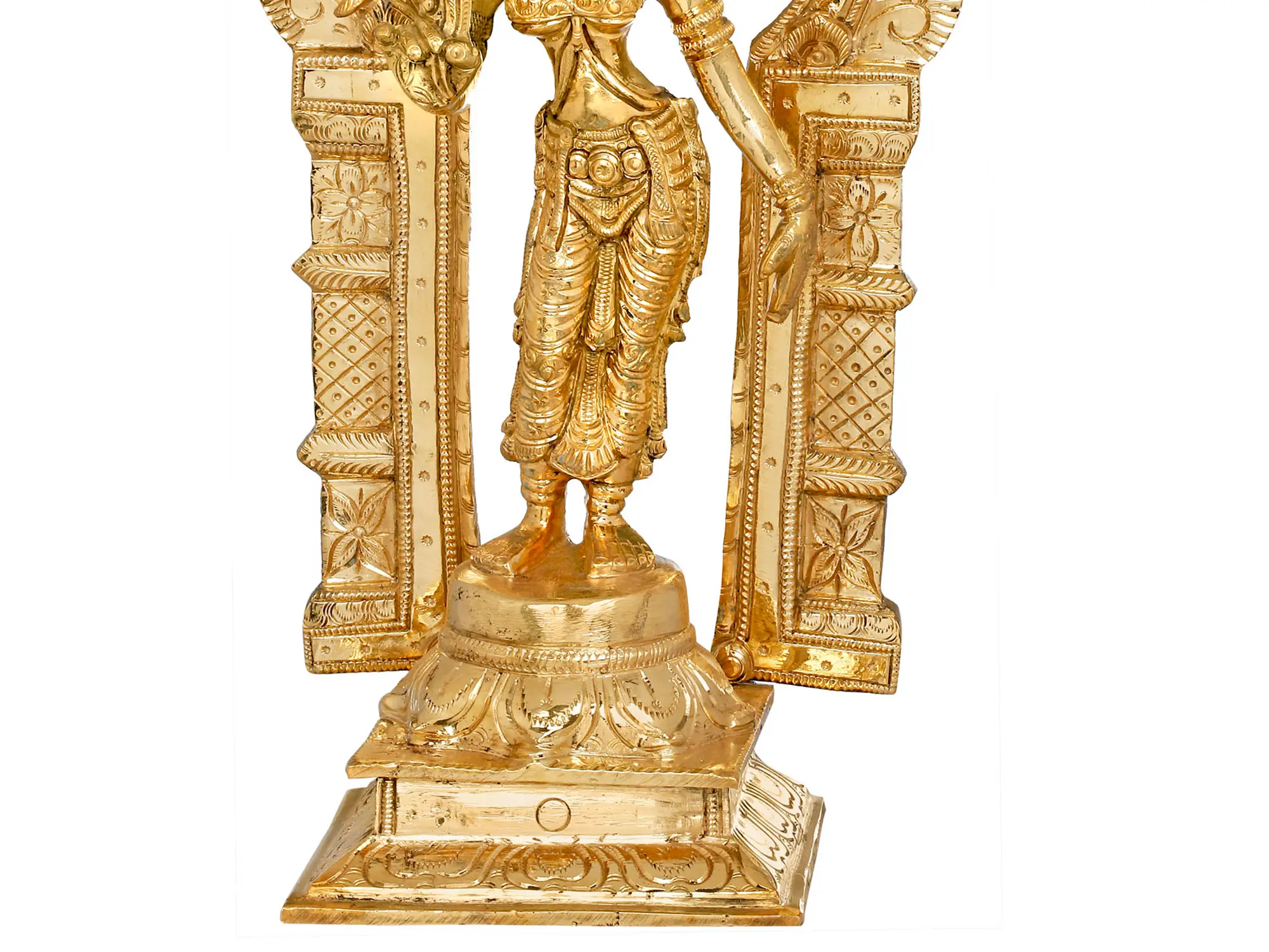 Invite the benevolent presence of Goddess Meenakshi into your home with this exquisitely crafted brass statue. Standing at fourteen inches tall, this masterpiece is a testament to the rich artistic heritage of South India, meticulously handmade by skilled artisans. The divine effigy is captured in a commanding yet graceful stance, adorned with intricate details that speak of ancient traditions and profound spirituality. The lustrous brass, polished to a brilliant sheen, reflects light beautifully, imbuing the statue with a radiant aura that commands reverence and admiration.