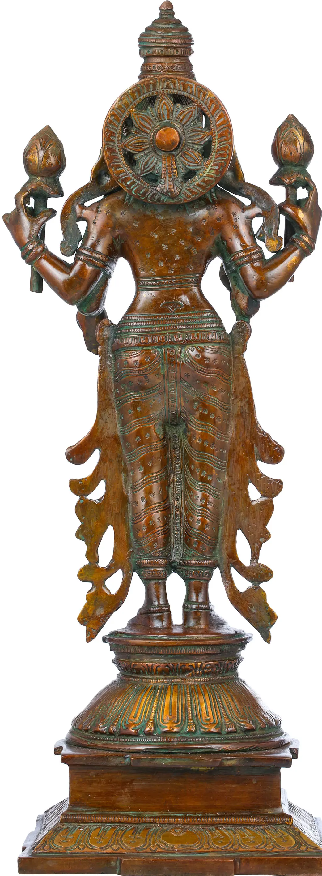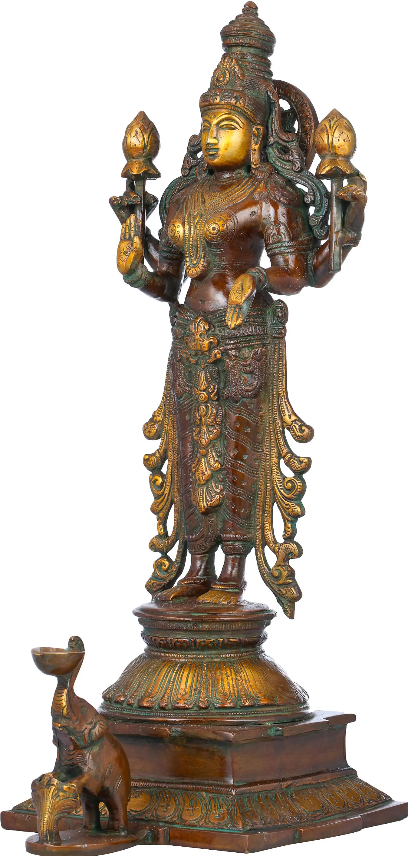 This brass sculpture embodies Goddess Lakshmi, the beacon of prosperity and wealth in Hindu tradition. This handmade Indian artifact reflects her as standing gracefully on a lotus, a symbol of purity and enlightenment amidst the murky waters of materialism. Adorned with intricate jewelry and fine garments, her four benevolent arms bear the sacred lotus, the pot of wealth, and bestow blessings of abundance. The craftsmanship captures her serene expression and the detailed carvings on her crown, symbolizing her exalted status. This representation of Lakshmi is not just a testament to artistic skill but also an invocation for fortune and well-being.