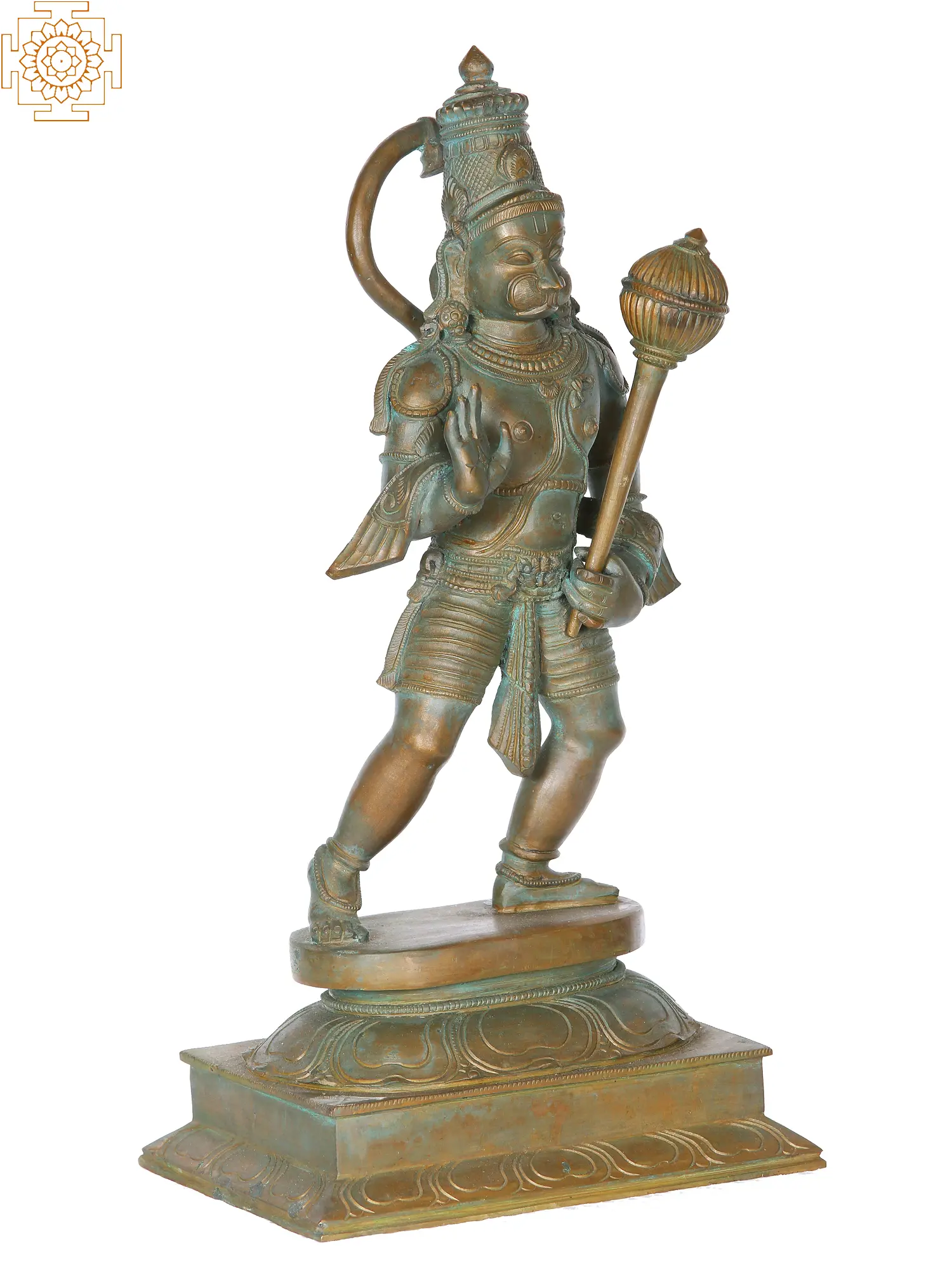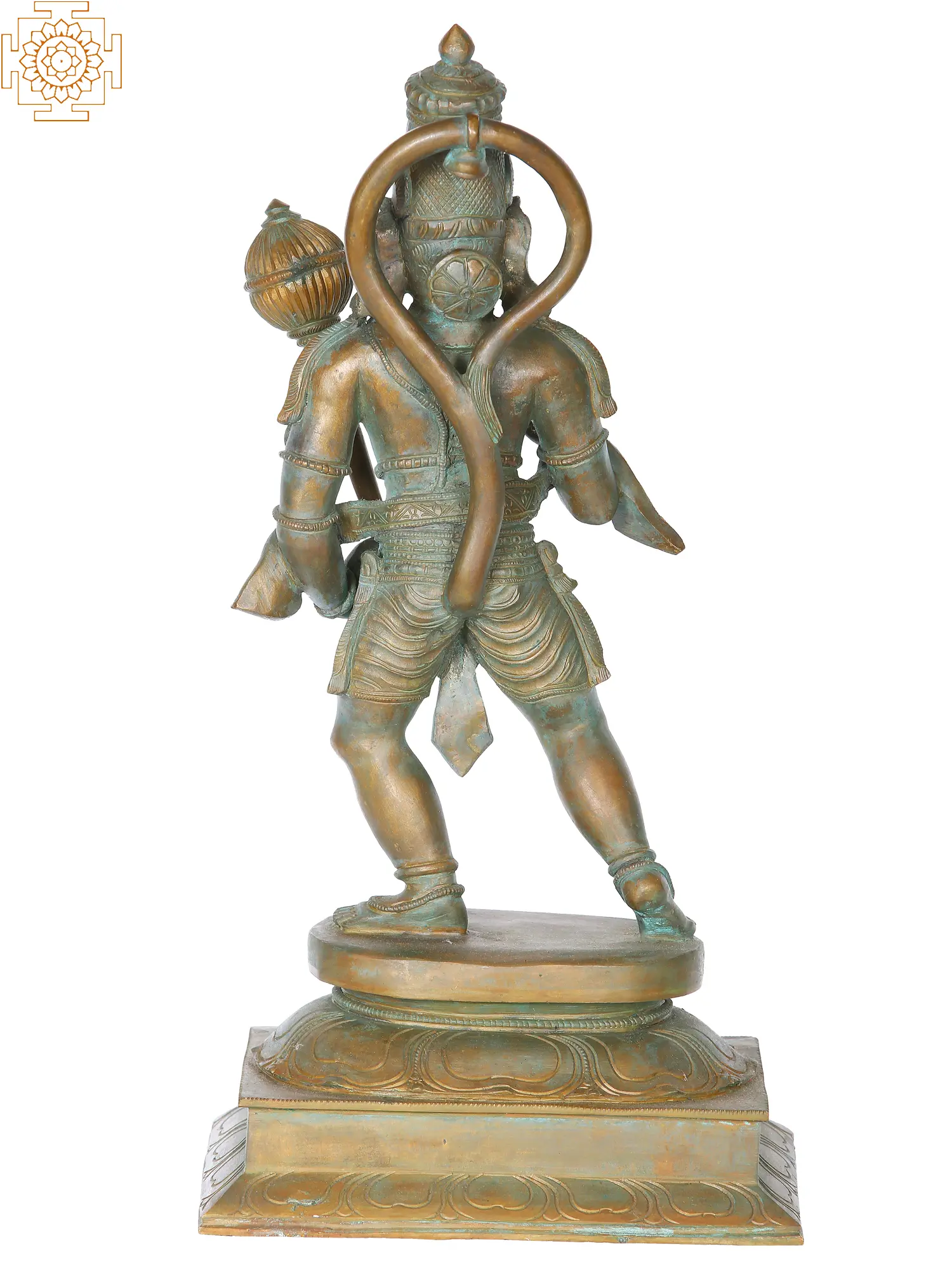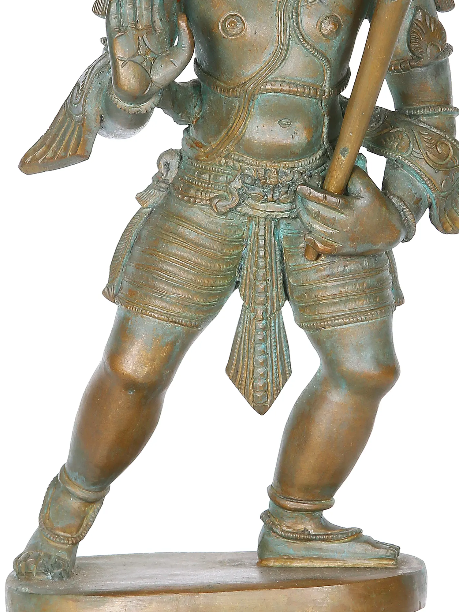 The stance of Hanuman sculpture is decidedly dynamic. With the gada, His signature weapon, in the left hand and the right raised in blessing, He makes as if to take off into the heavens any moment now. Perhaps this Hanuman statue in bronze captures the moment in time right before He set off for the Himalayas to retrieve the Sanjeevani for Lakshmana.